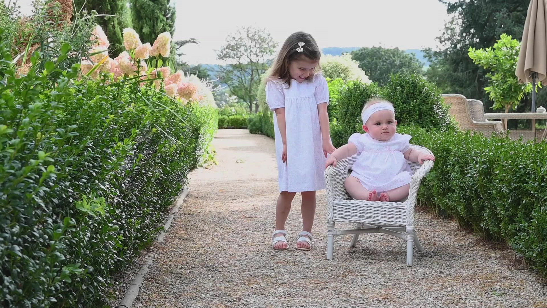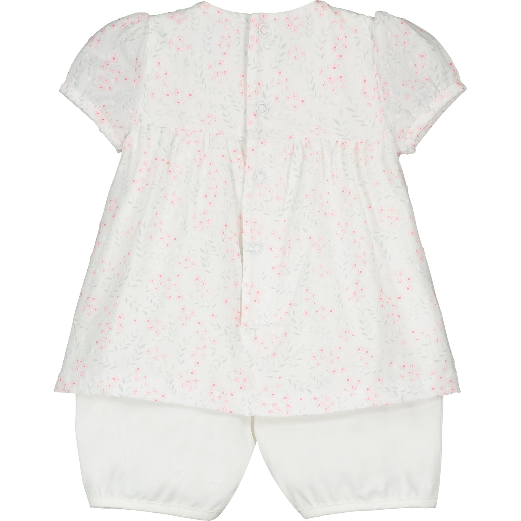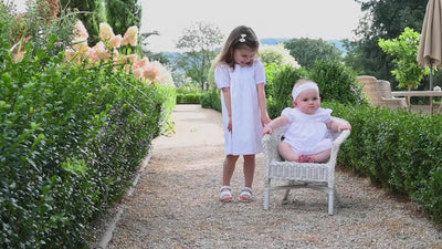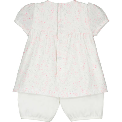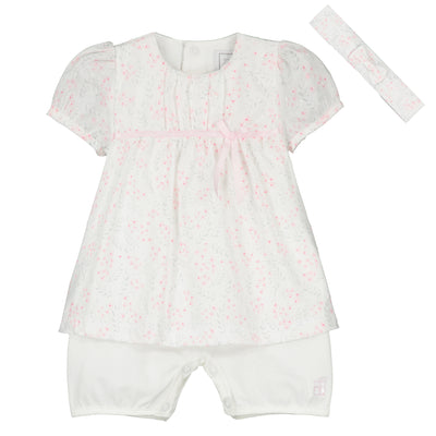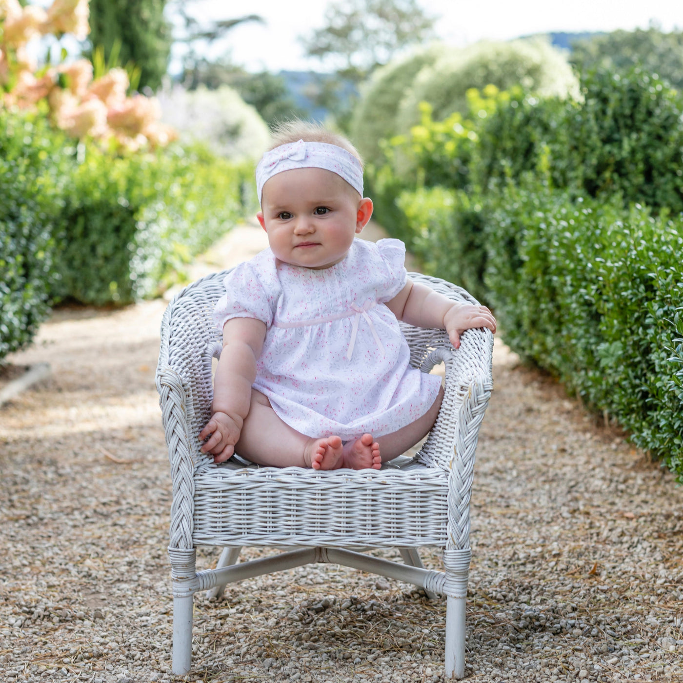 In our gorgeous new ditsy floral print, Birdie is a pretty, cool, 2 in 1 romper dress. Giving the illusion of a two piece, the romper top features relaxed smock styling with simple rounded neck. Four little pin tuck pleats, puff sleeves and satin ribbon trim adds feminine touches. The legs are gathered to give a bloomer effect and a matching floral hairband completes this beautiful little outfit. Perfect for hot summer days!