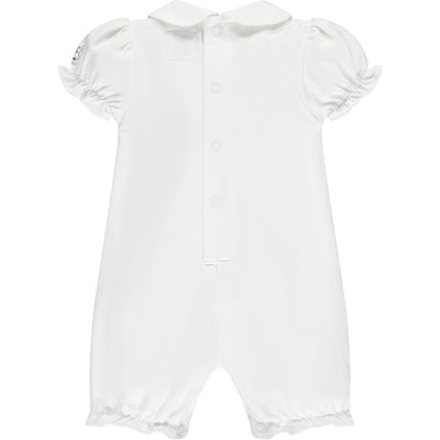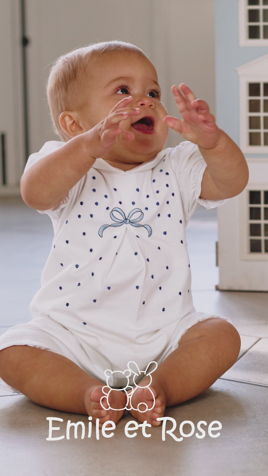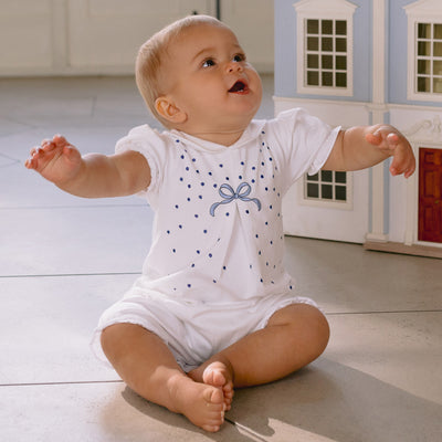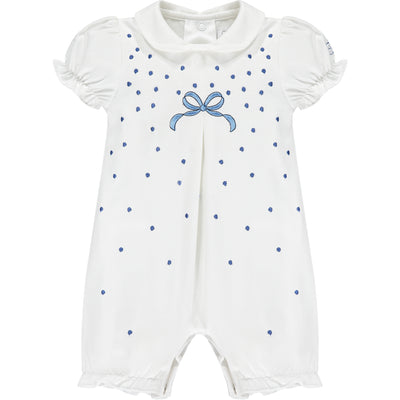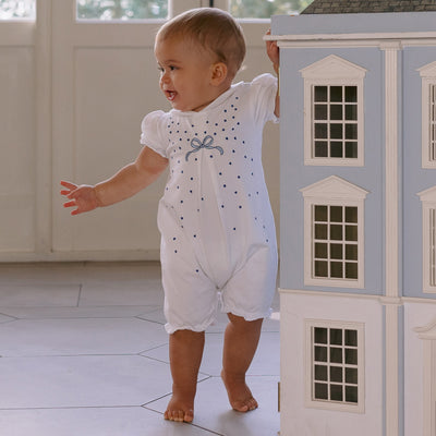Following our spotty theme, Darla, like Daphne is a delightful white romper. Running from the centre of the simple white, rounded collar, is a single pleat with a beautifully embroidered blue tied bow. The main body of the garment is decorated with a scattering of embroidered blue spots edged in navy. Gathered short sleeves and legs ensure comfort and coolness on the hottest of days.