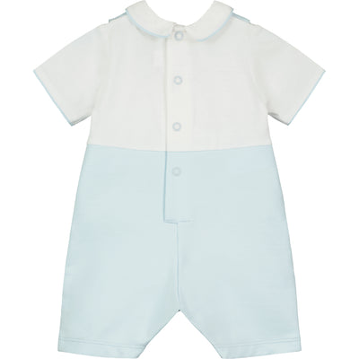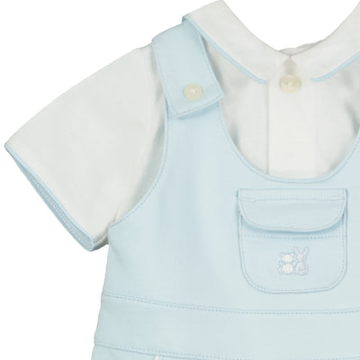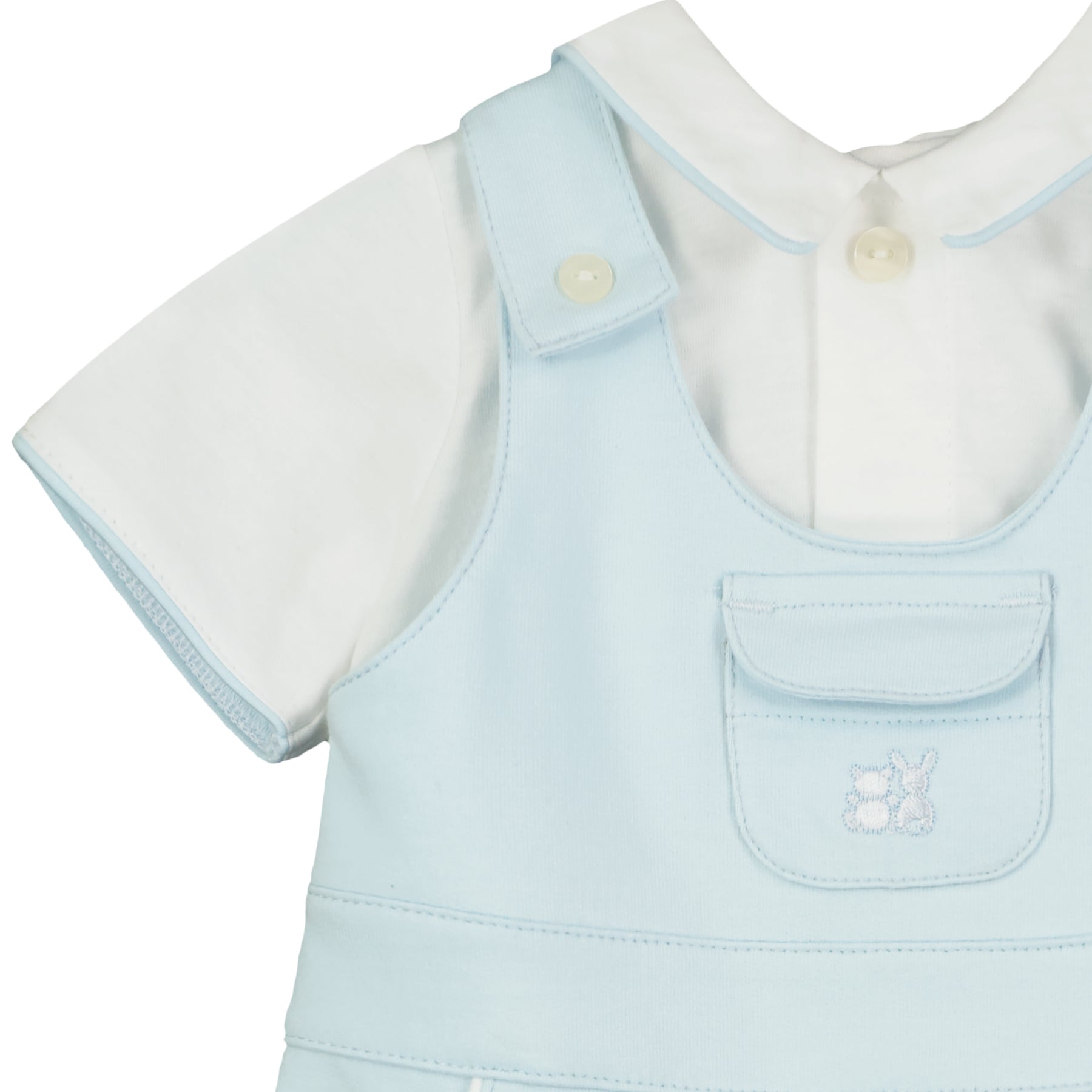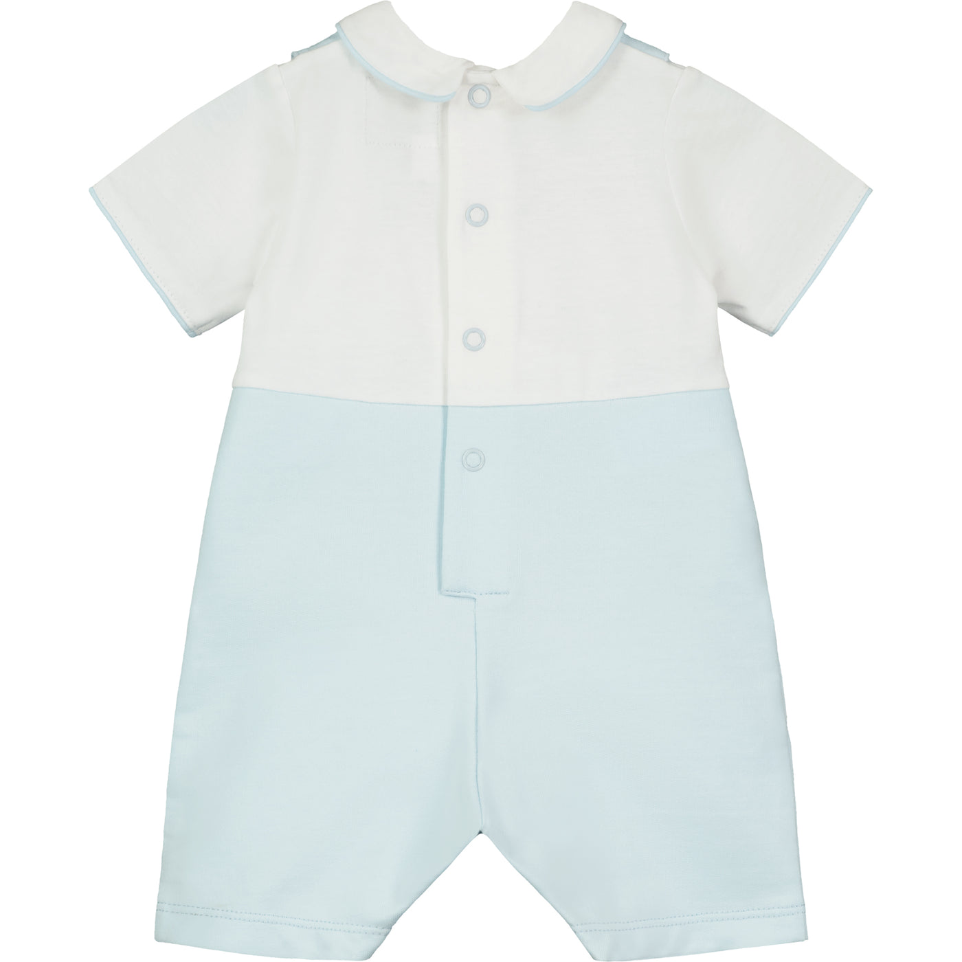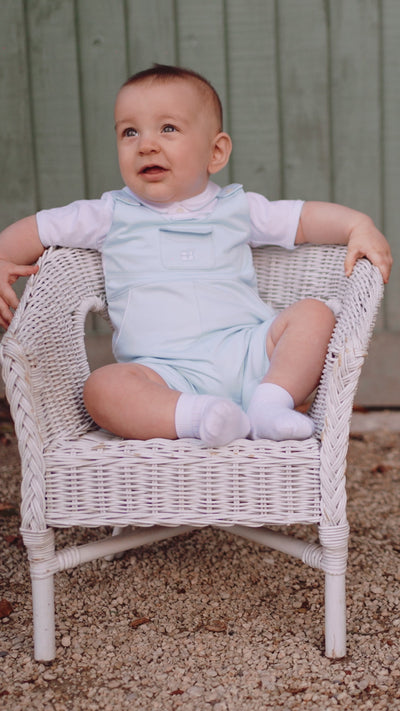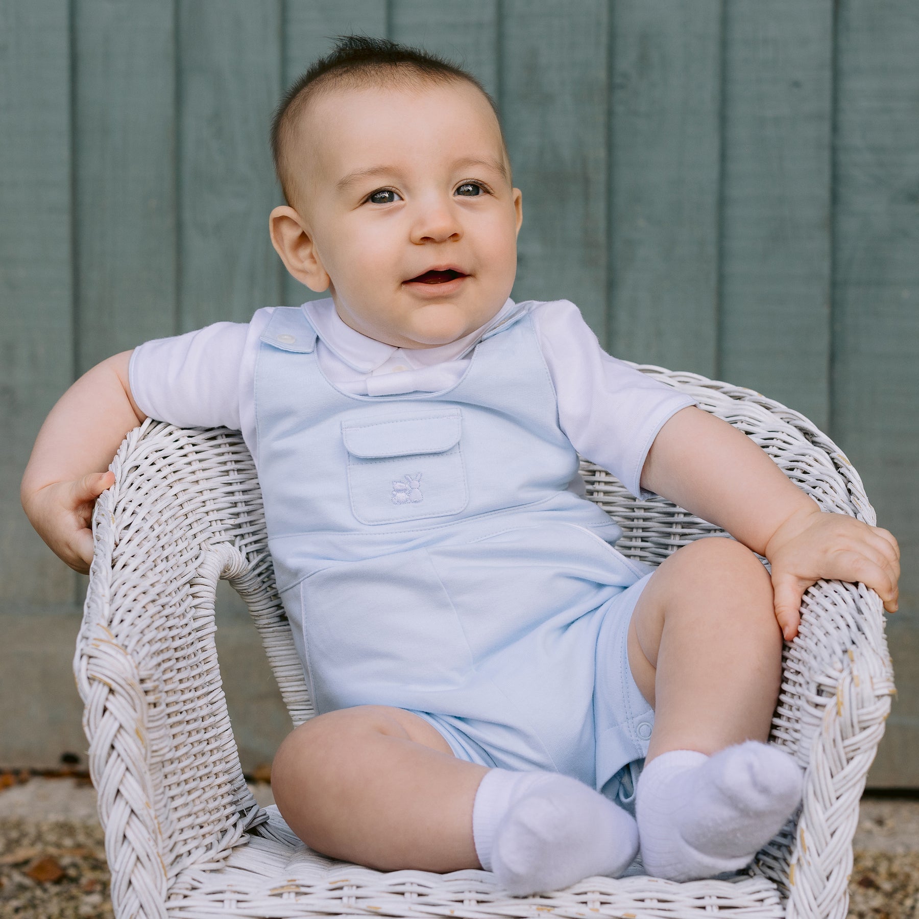 This classic bib short style is a Royal favourite. In a fresh pale blue, this bib short has been traditionally styled with tiny pearlised buttons and centre pocket on the bib front. The white short sleeved mock shirt has a soft cotton jersey collar and the short sleeve cuff is trimmed in pale blue. The shorts part of the garment also has two side pockets and full popper leg opening for easy changing. Just right for a picnic!