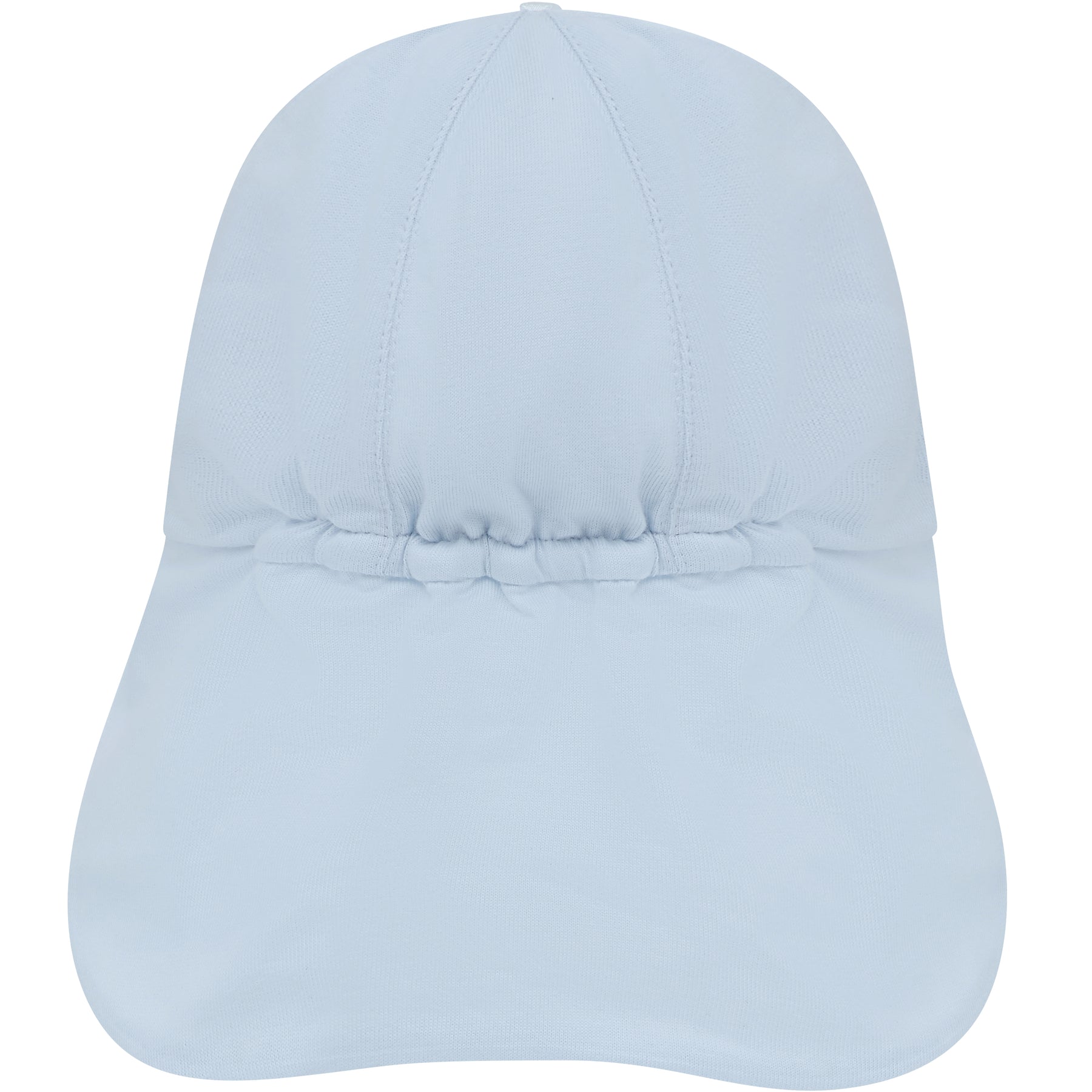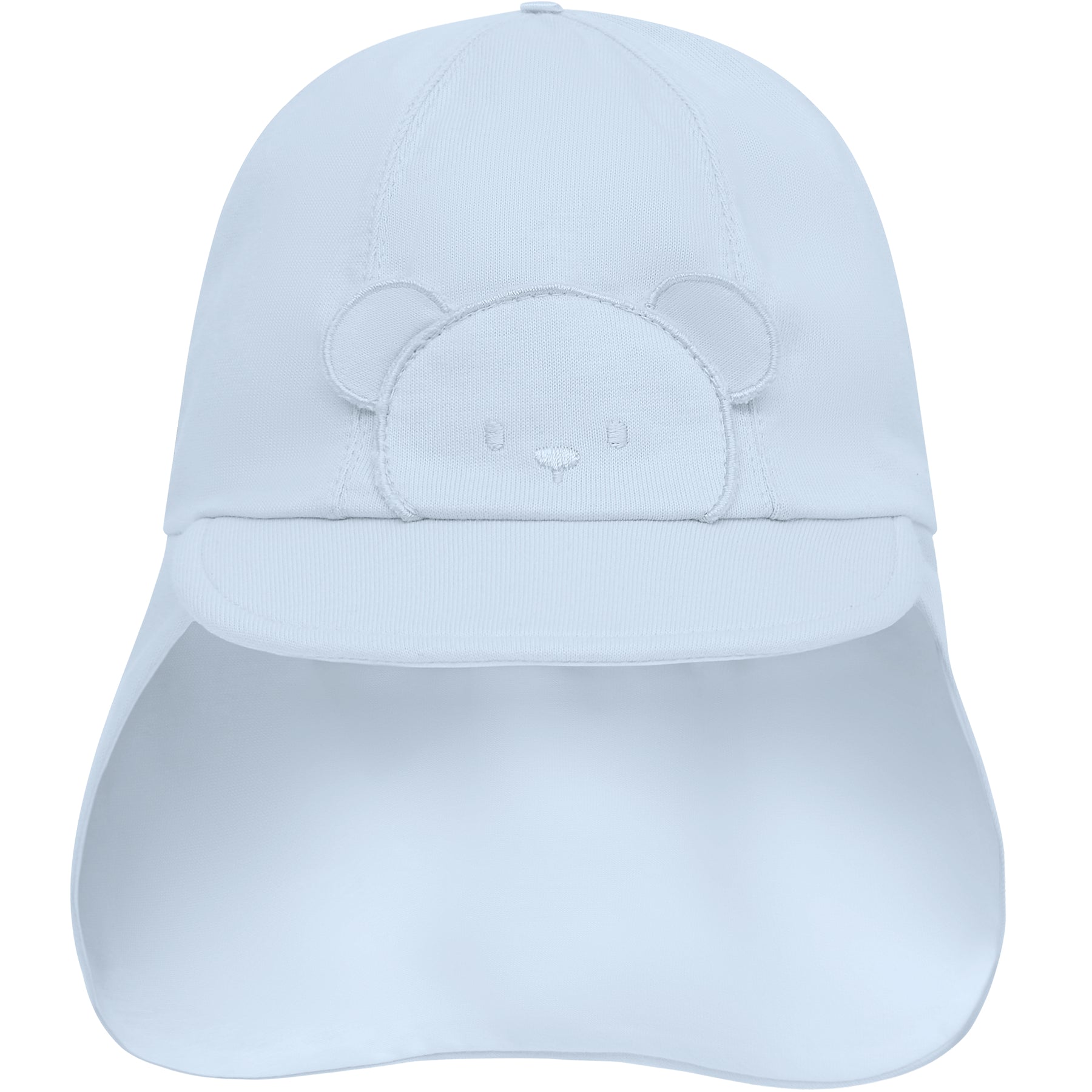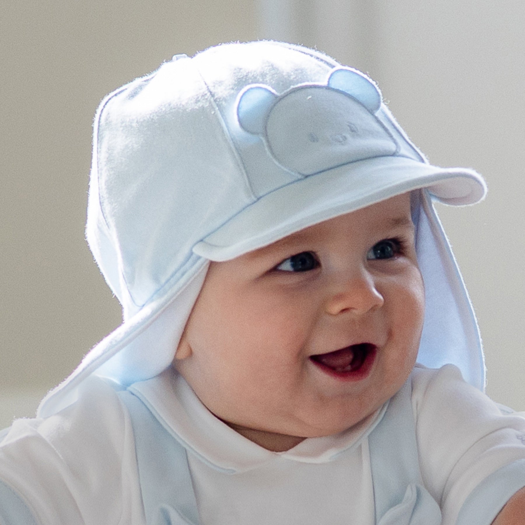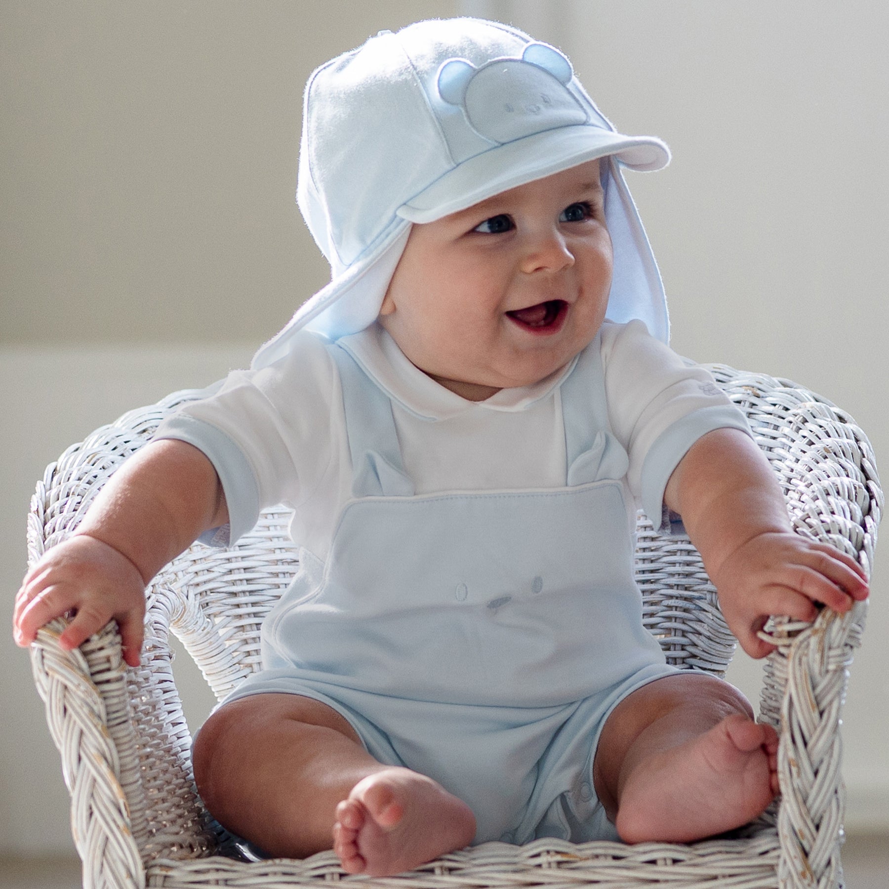 Lee is our very cute new cap, with neck shield to protect baby from the summer sun! All in soft jersey, lined in white, and with a sun peak, the cap will coordinate beautifully with our blue garments. It also features on the front a teddy applique with 3D ears, perfect for holidays or staycations!