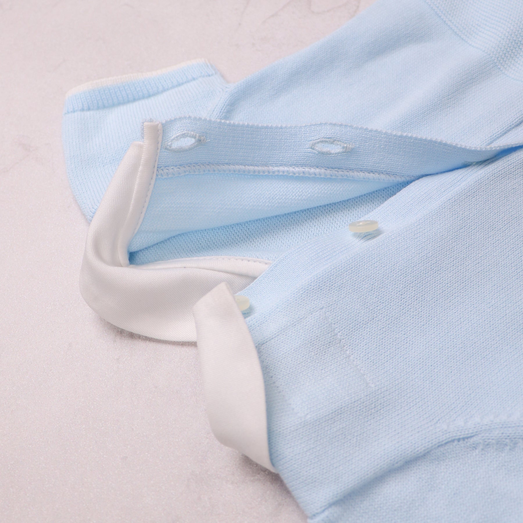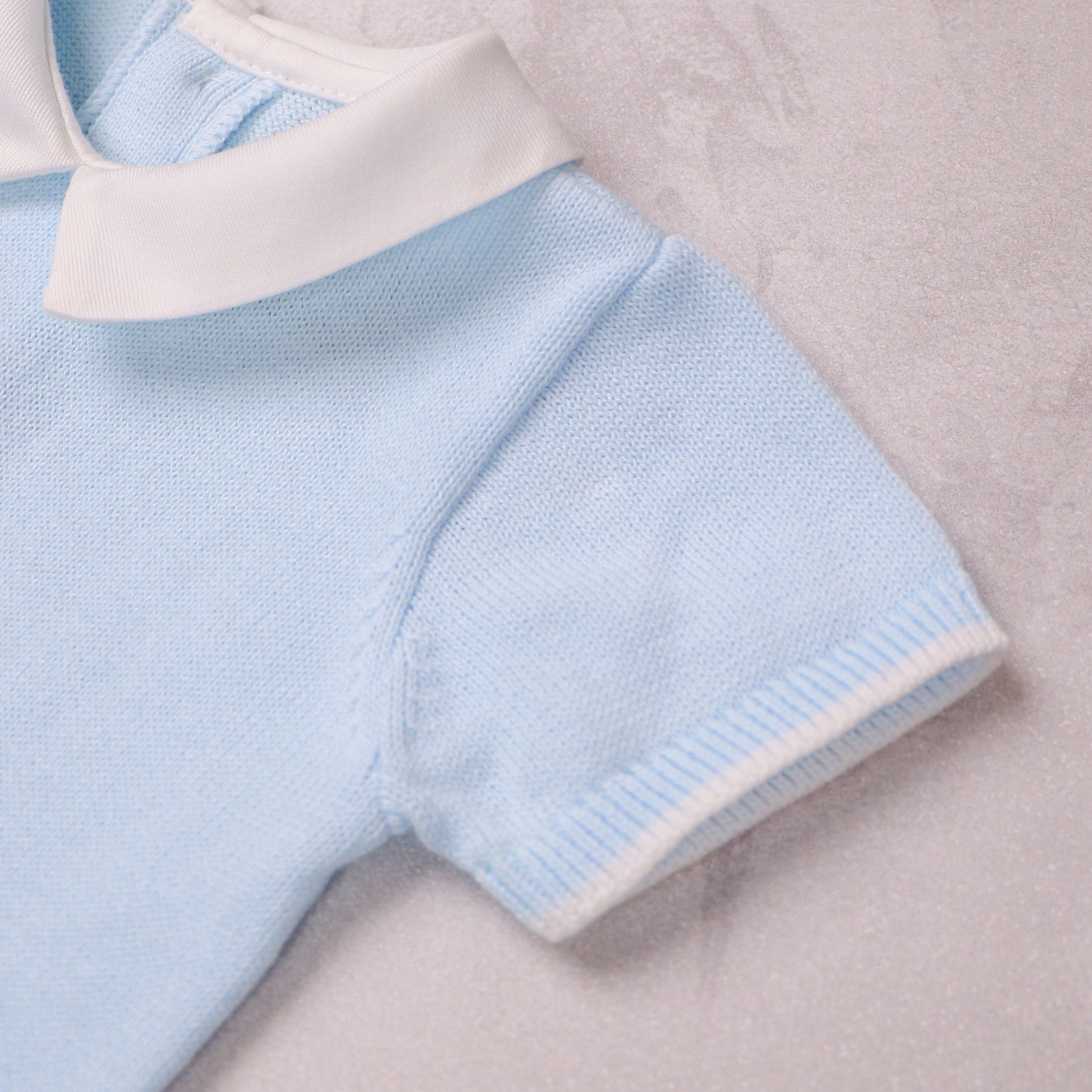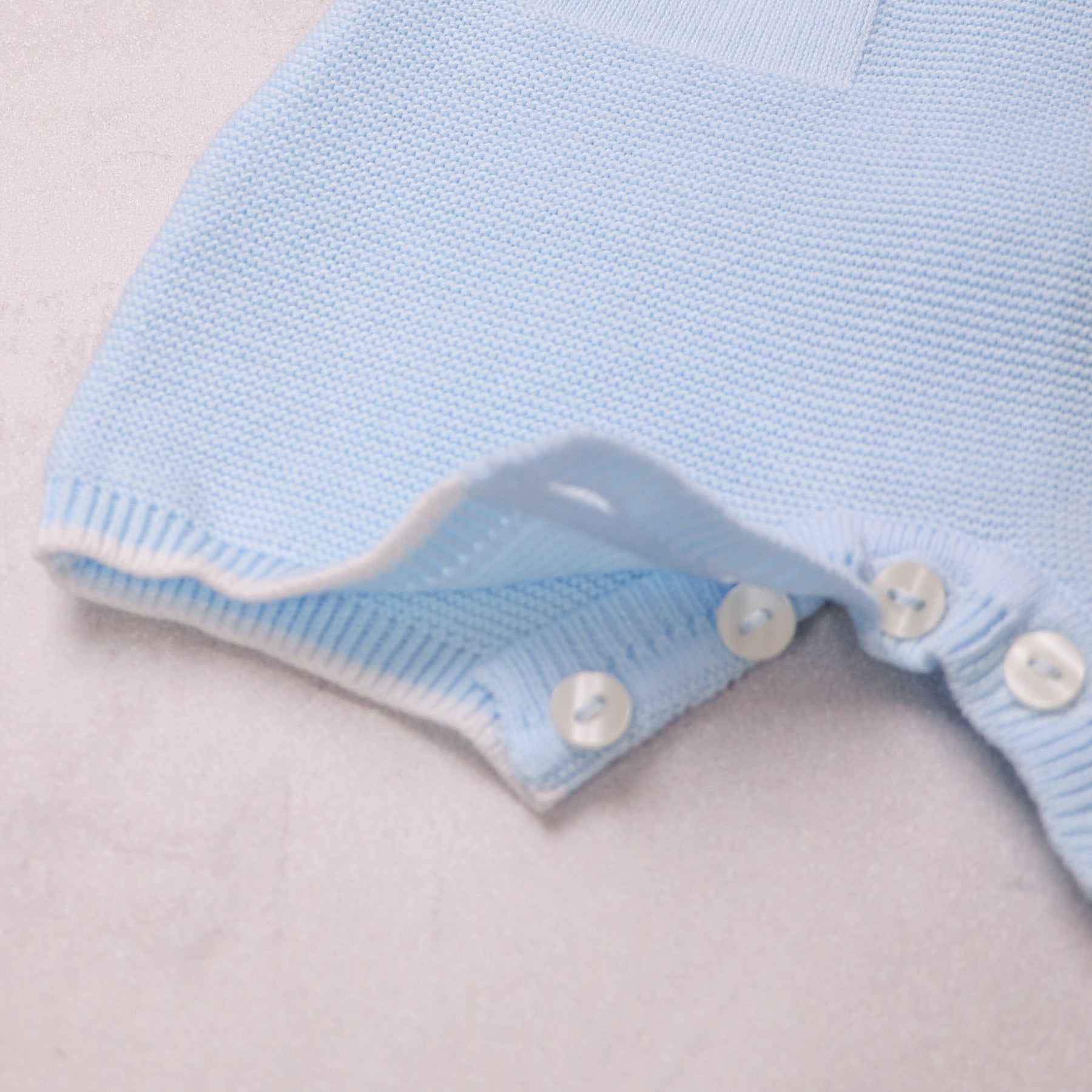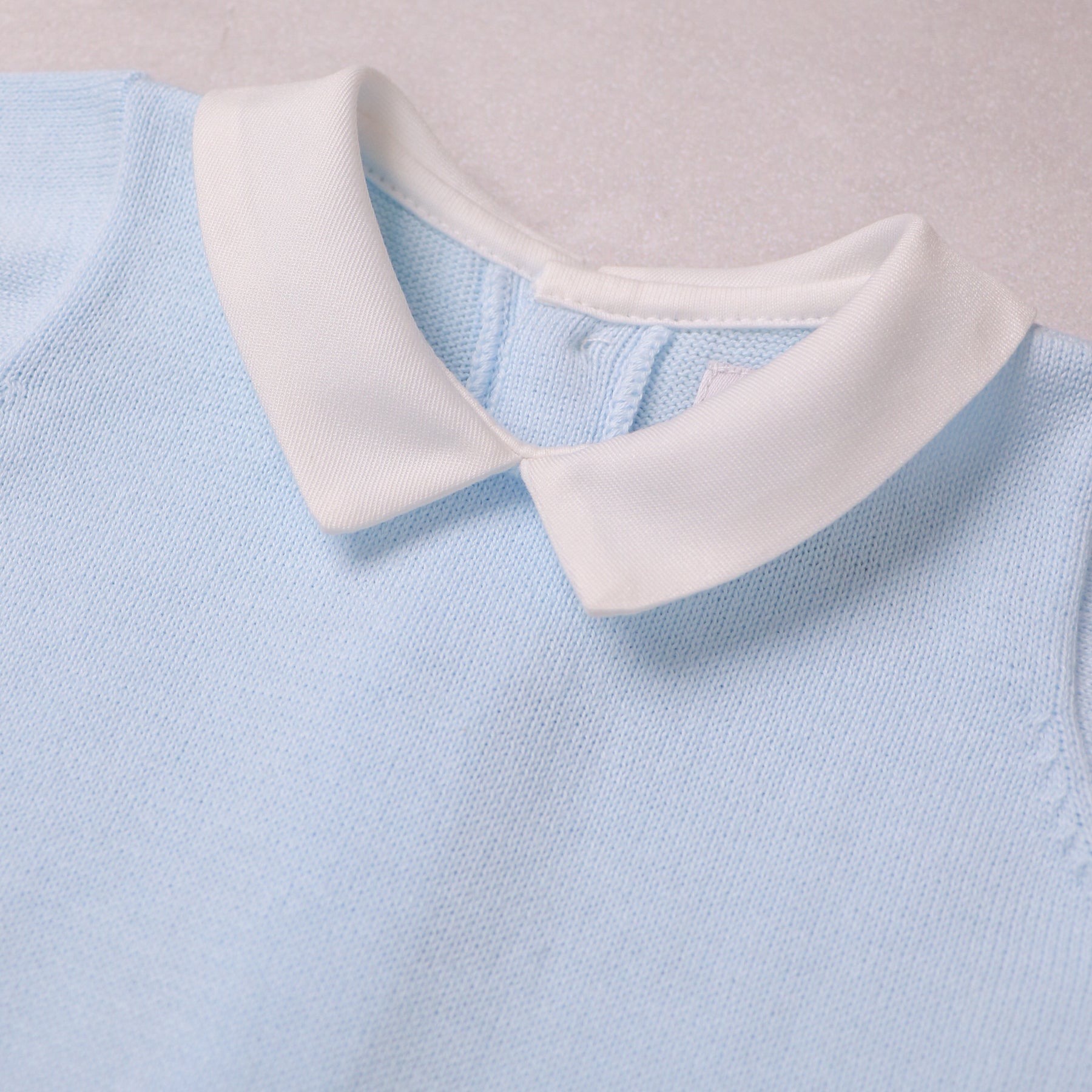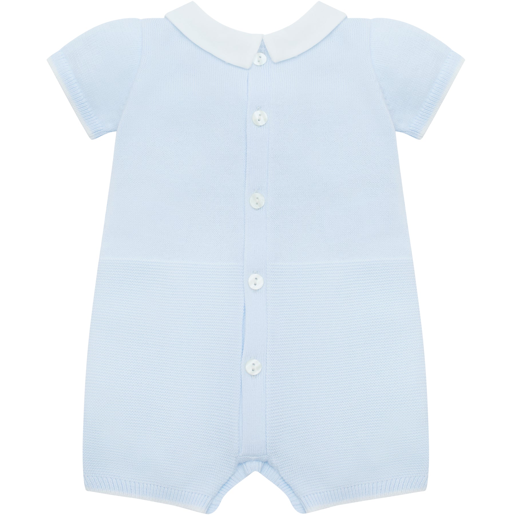 This gorgeous knitted romper, is the perfect style for summer and is exquisitely knitted with a variety of different stitches. In pale blue, the lower part of the garment has a more textured stitch with mock pockets edged in white. A sweet little button adds detail to each pocket and the white edged sleeves and leg cuffs and a crisp white collar all add to this classic garment. Gorgeous pearlised buttons are used again on the back and leg openings. Simple but stunning!
