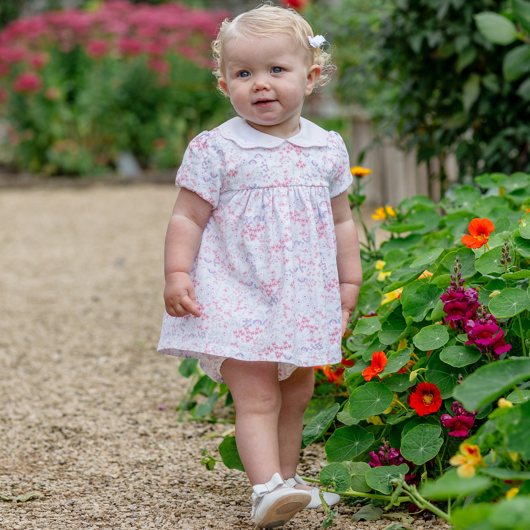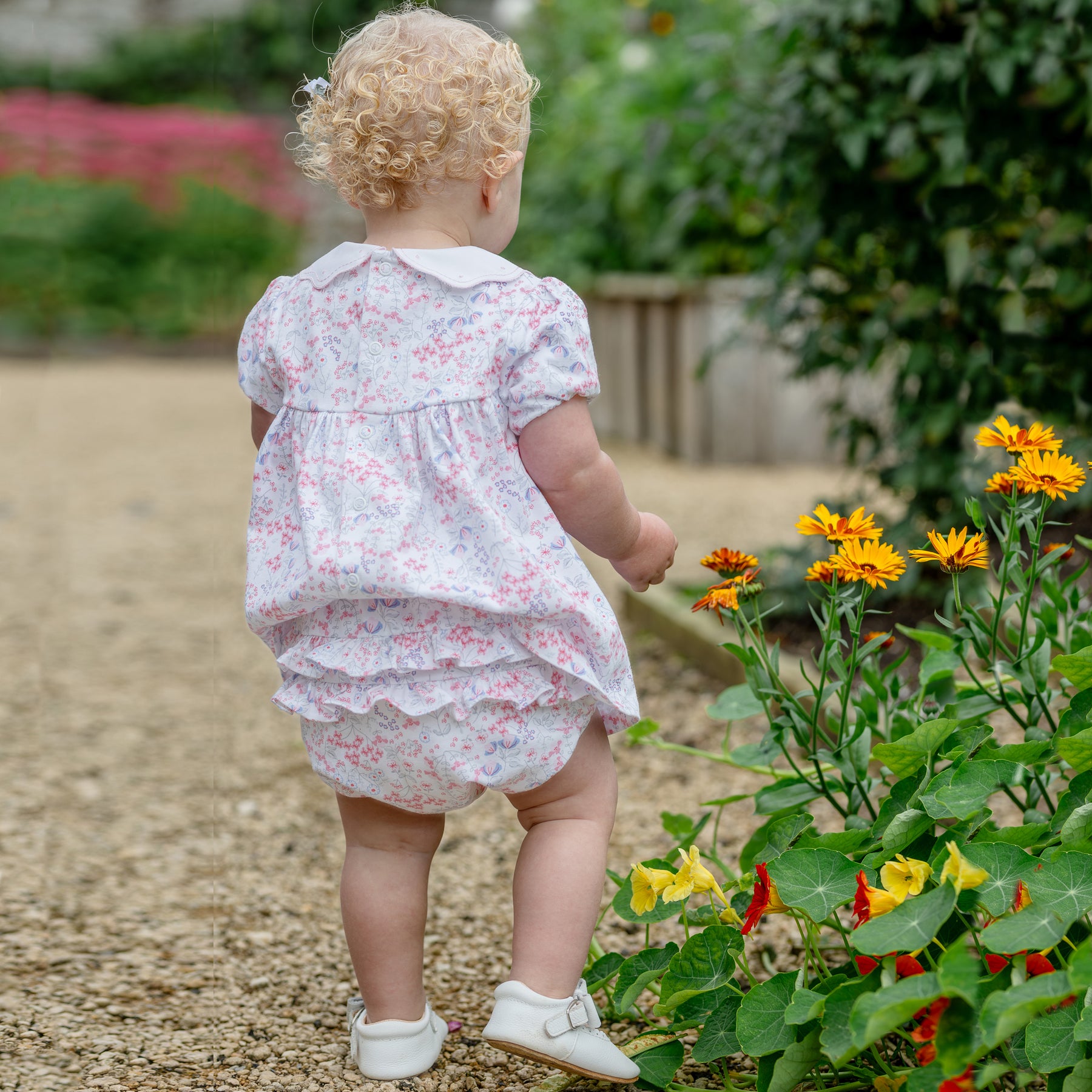 Lola is our Spanish inspired all over print dress, something a little bit different. With it's shorter full skirted dress and frilly over-pants, it's really quite special. The dress is full with an over-sized embroidered, lace collar and puffed short sleeves. The pants have rows of frills which can be seen from under the dress, a pretty combination of floral print and frothy frills!
