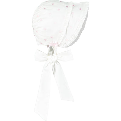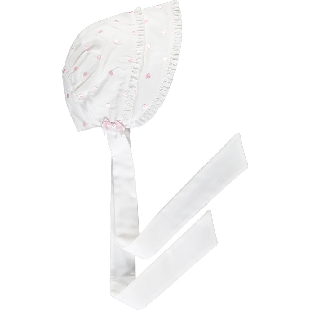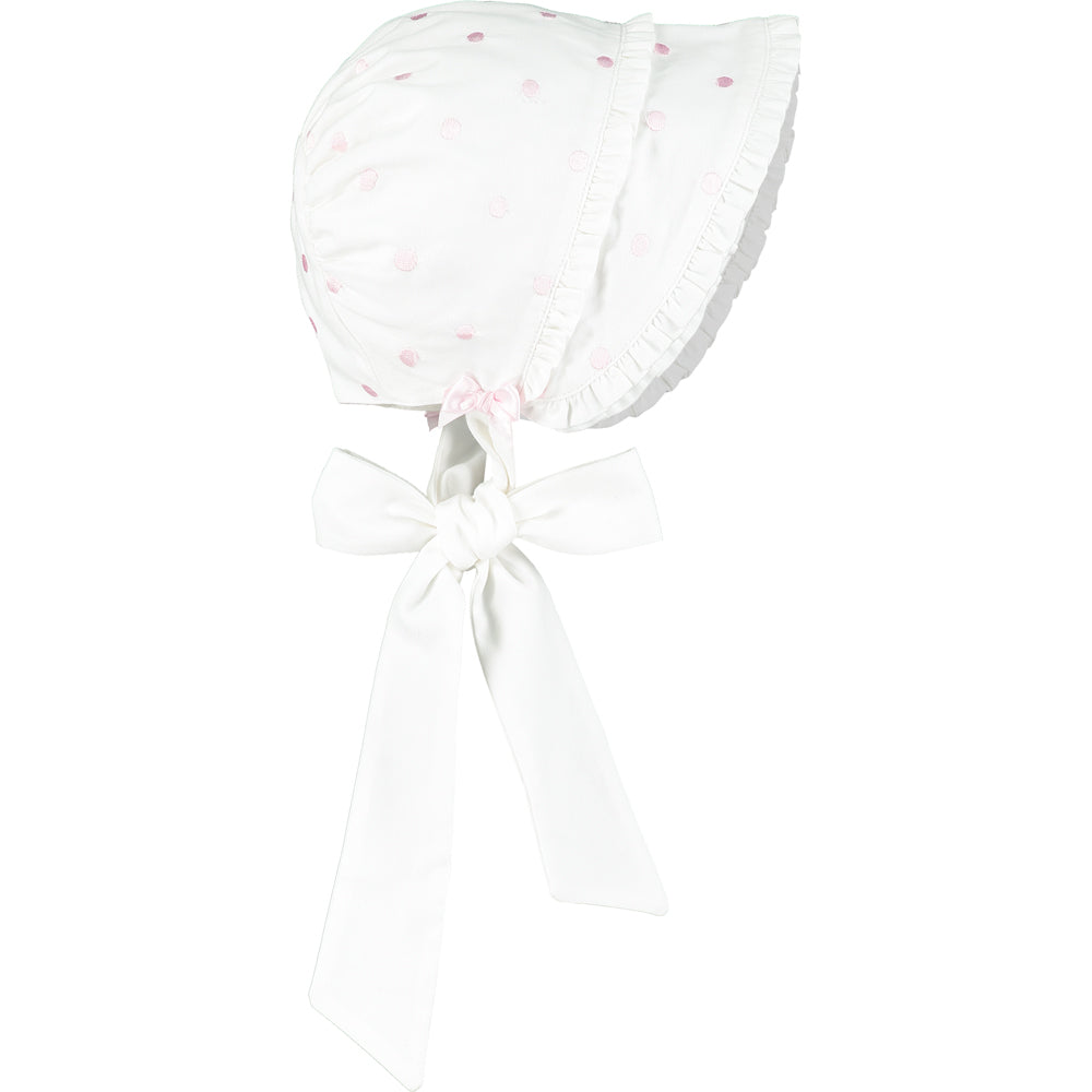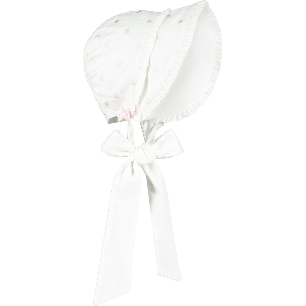 This baby girls adorable white bonnet with pale pink embroidered polka dots has two tiers of delicate ruffles adorning the front. Two perfectly tied pink satin bows sit just above the brushed cotton ties. The bonnet is fully lined and ties under at the front with soft cotton.