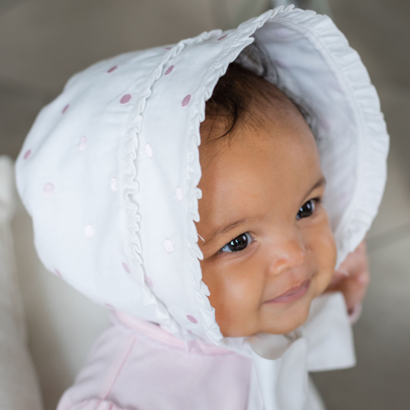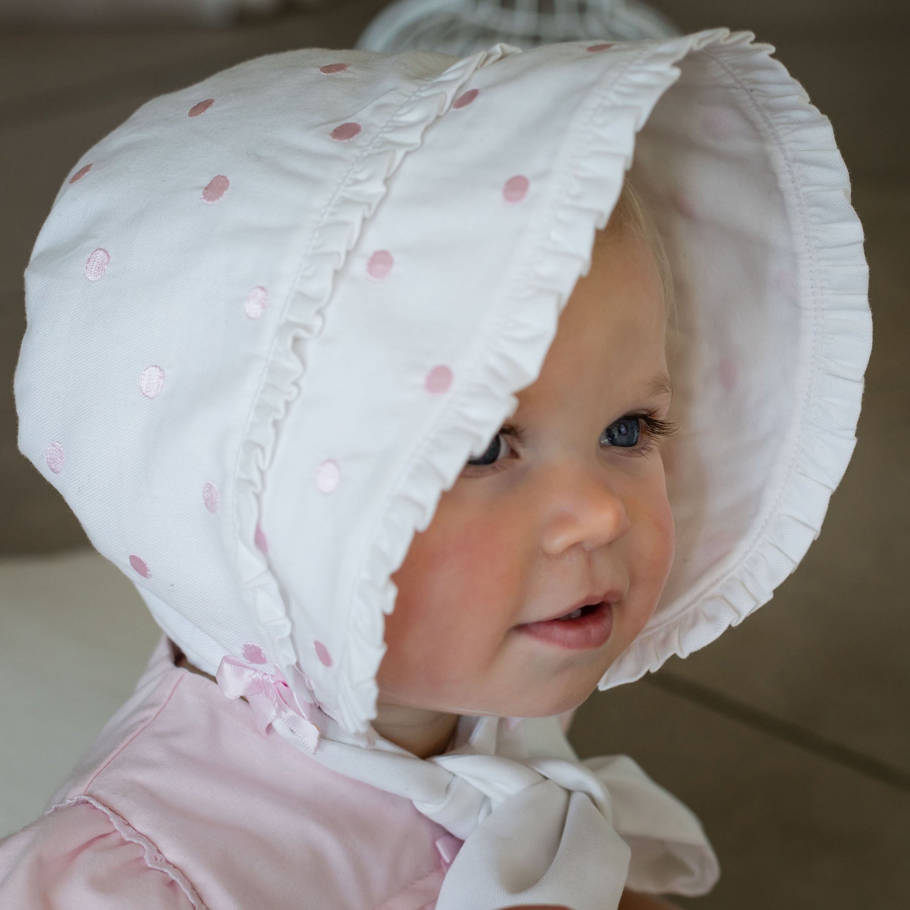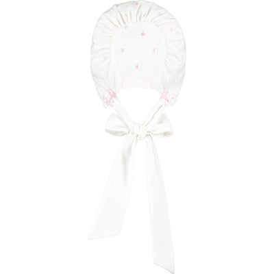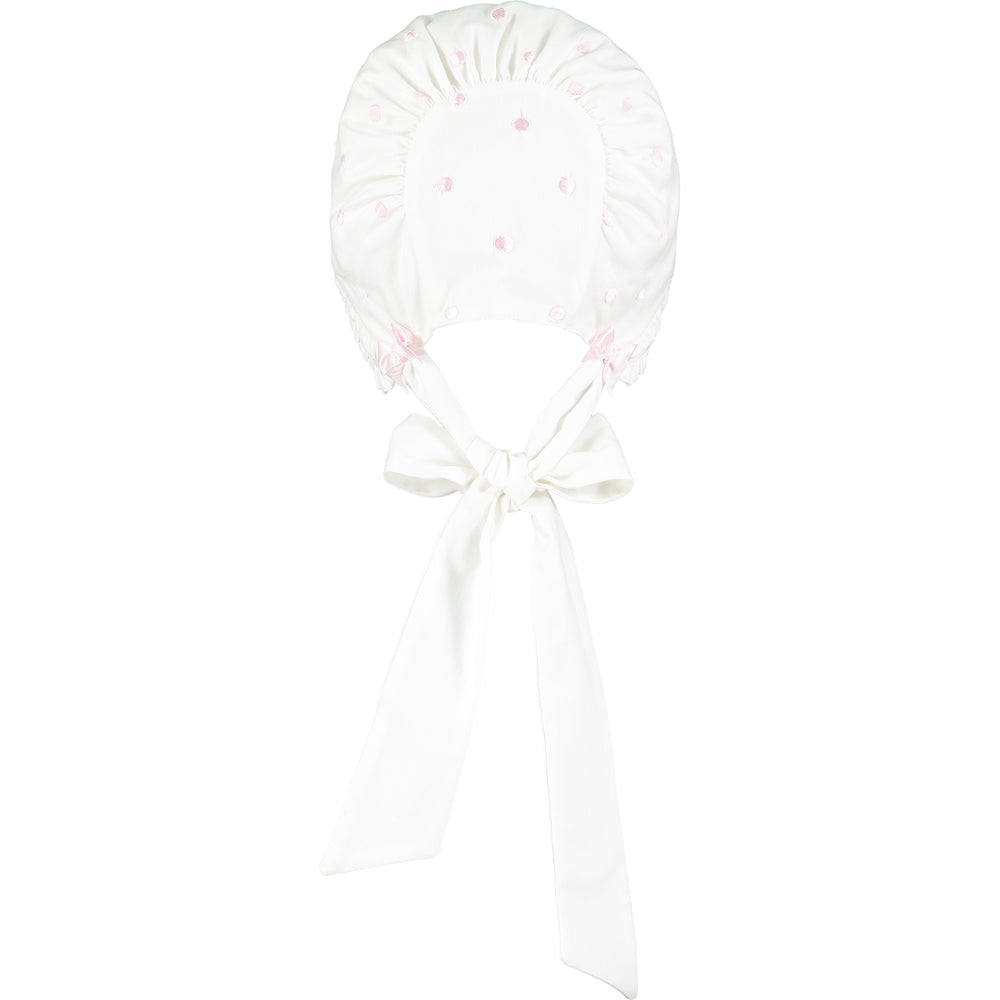 This baby girls adorable white bonnet with pale pink embroidered polka dots has two tiers of delicate ruffles adorning the front. Two perfectly tied pink satin bows sit just above the brushed cotton ties. The bonnet is fully lined and ties under at the front with soft cotton.