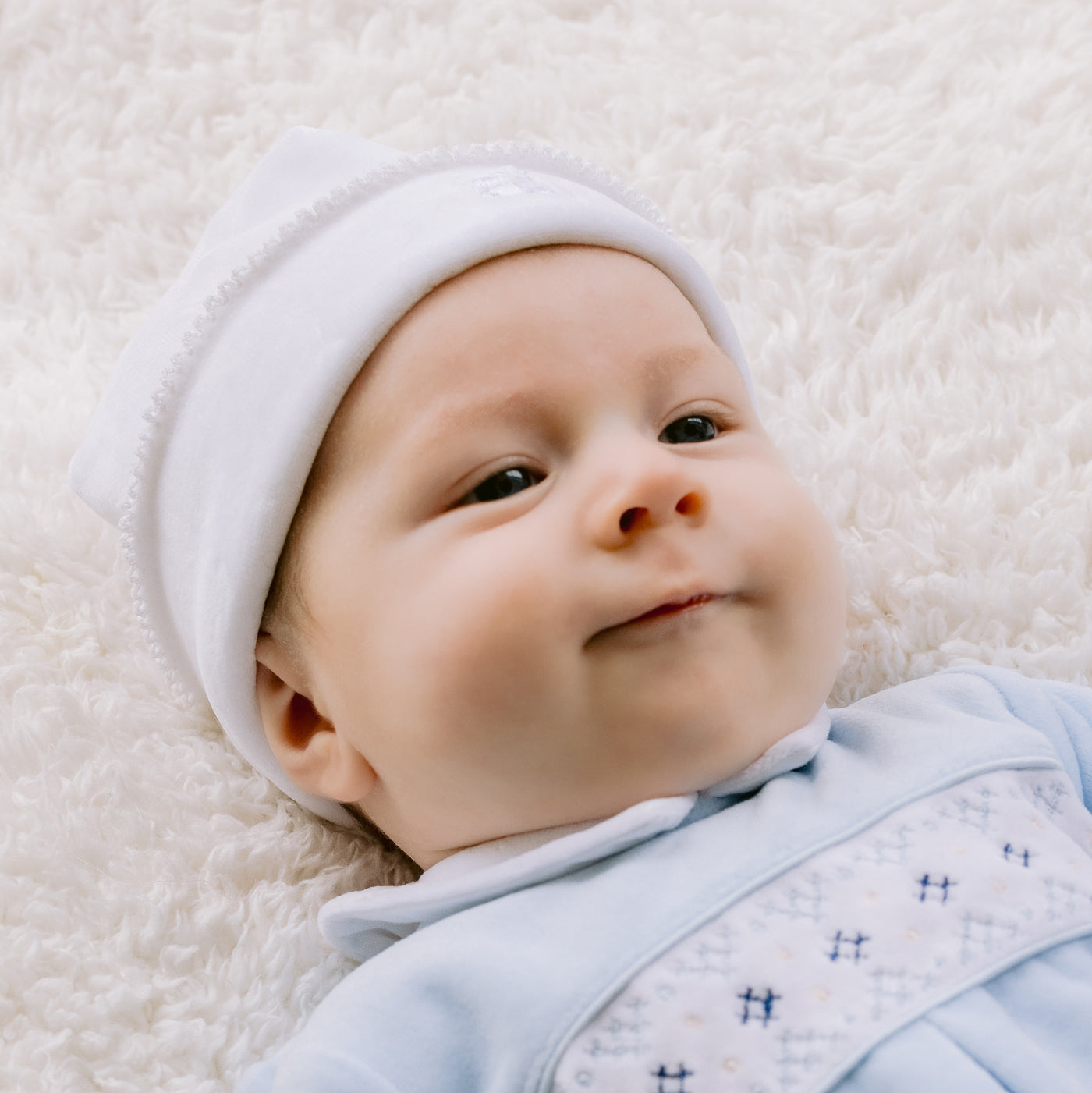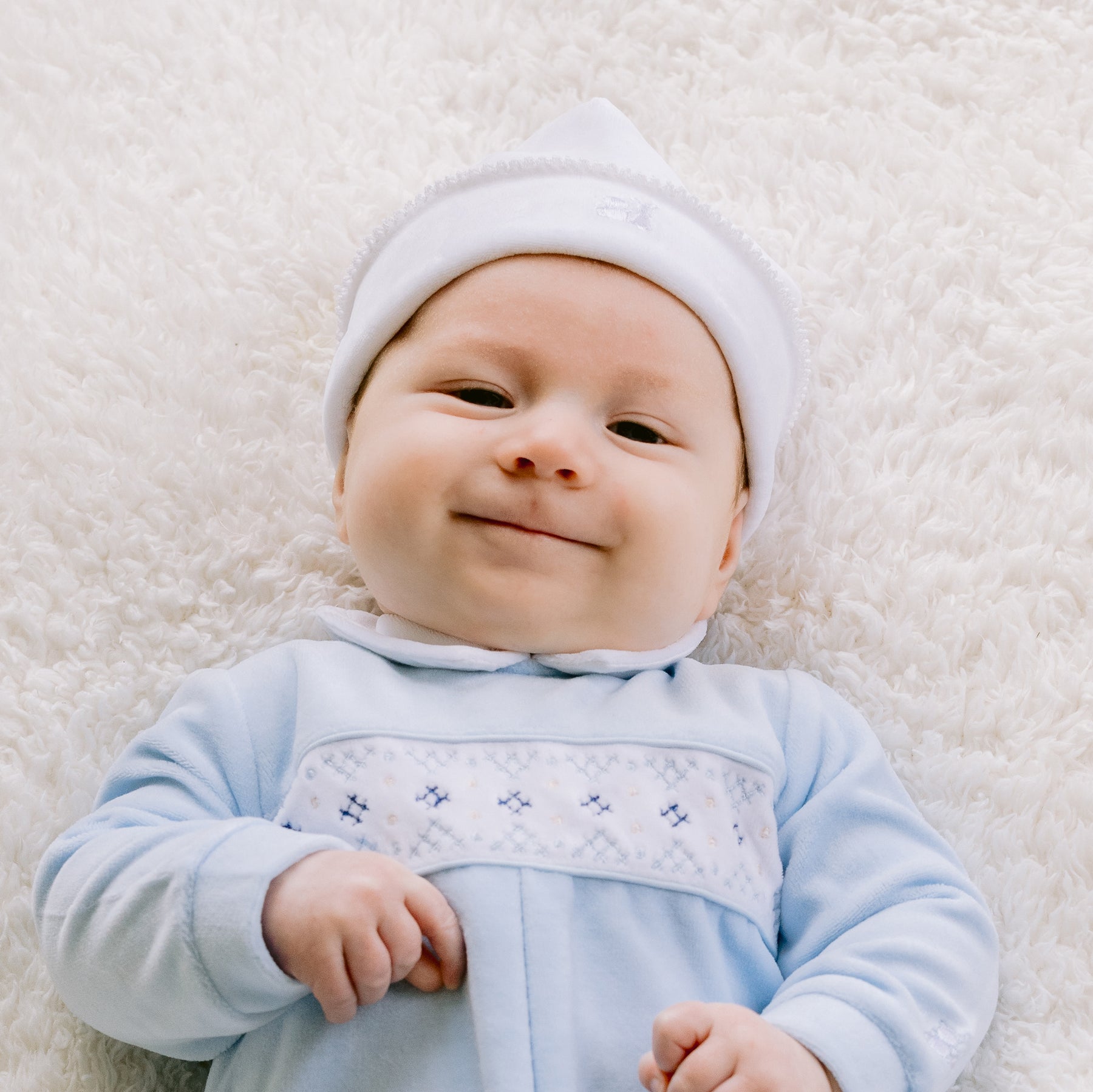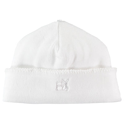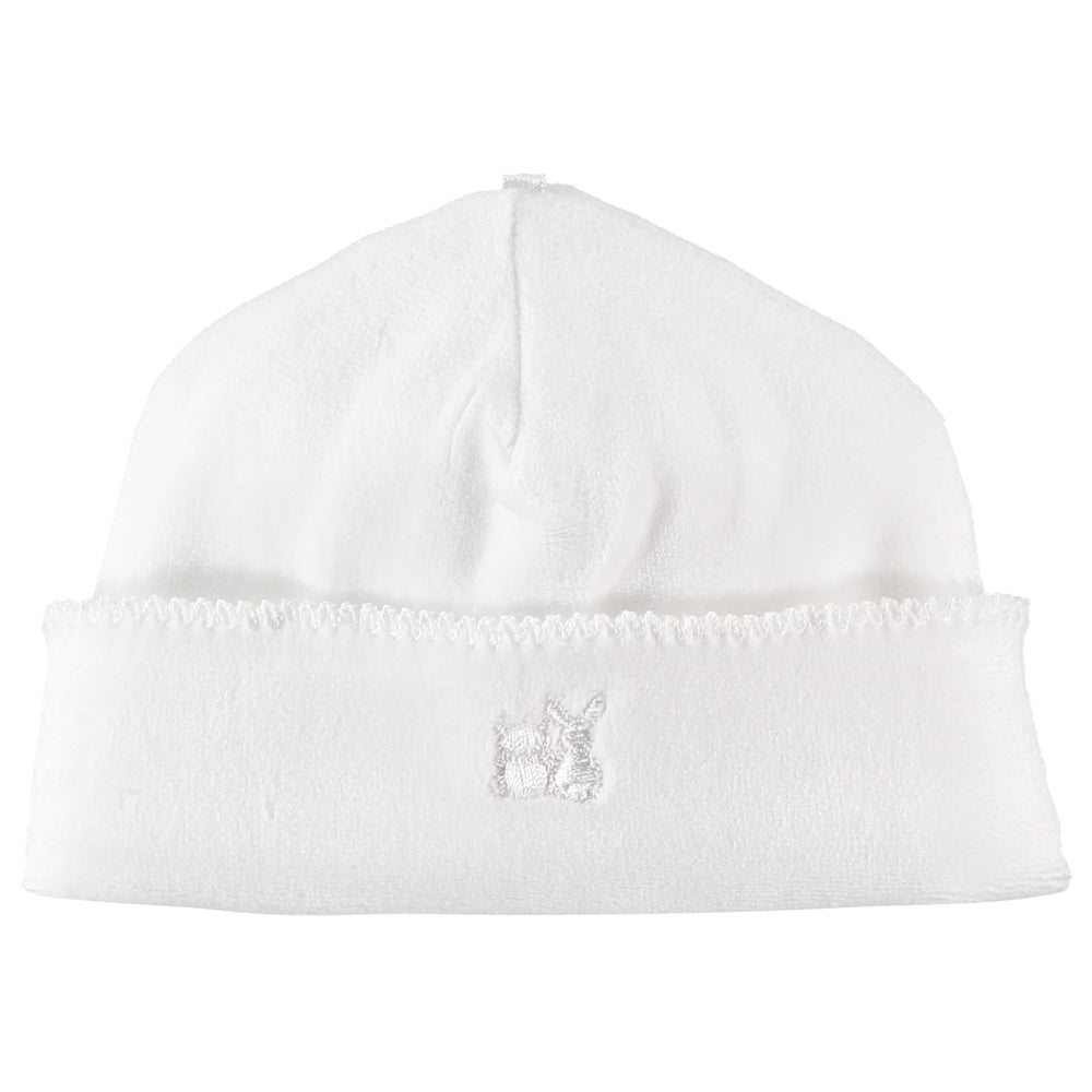 Keep baby warm with this simple but luxurious pull on hat in white velour which is turned up at the hem. The hat will match perfectly with any Emile et Rose garment and carries our embroidered signature logo.