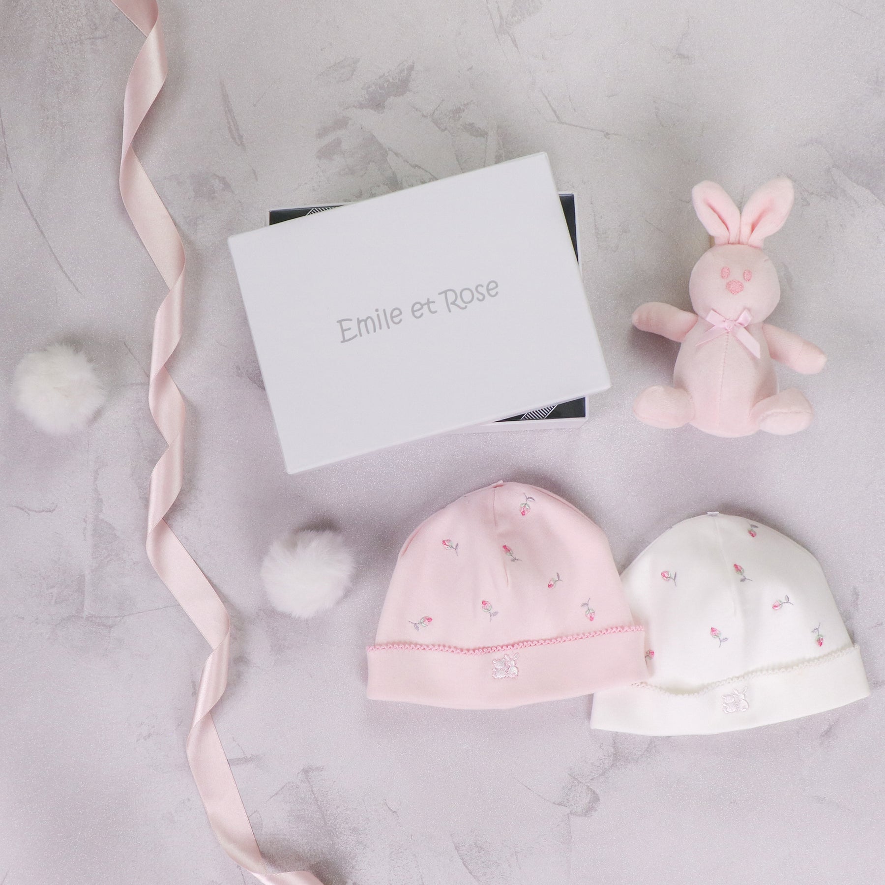 New for this season, Linzi is a lovely new baby girl, affordable gift set. It contains our popular pull-on baby hats, one pink and one white, with gorgeous rosebud embroideries and our super cute Rose bunny. All beautifully presented in a luxury white presentation box with a clear window adorned with the signature Emile et Rose logo and ribbon detailing. A lovely new baby gift!