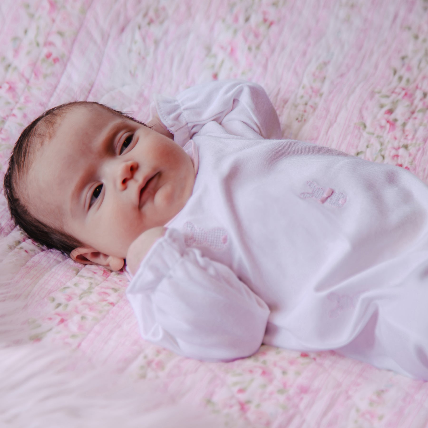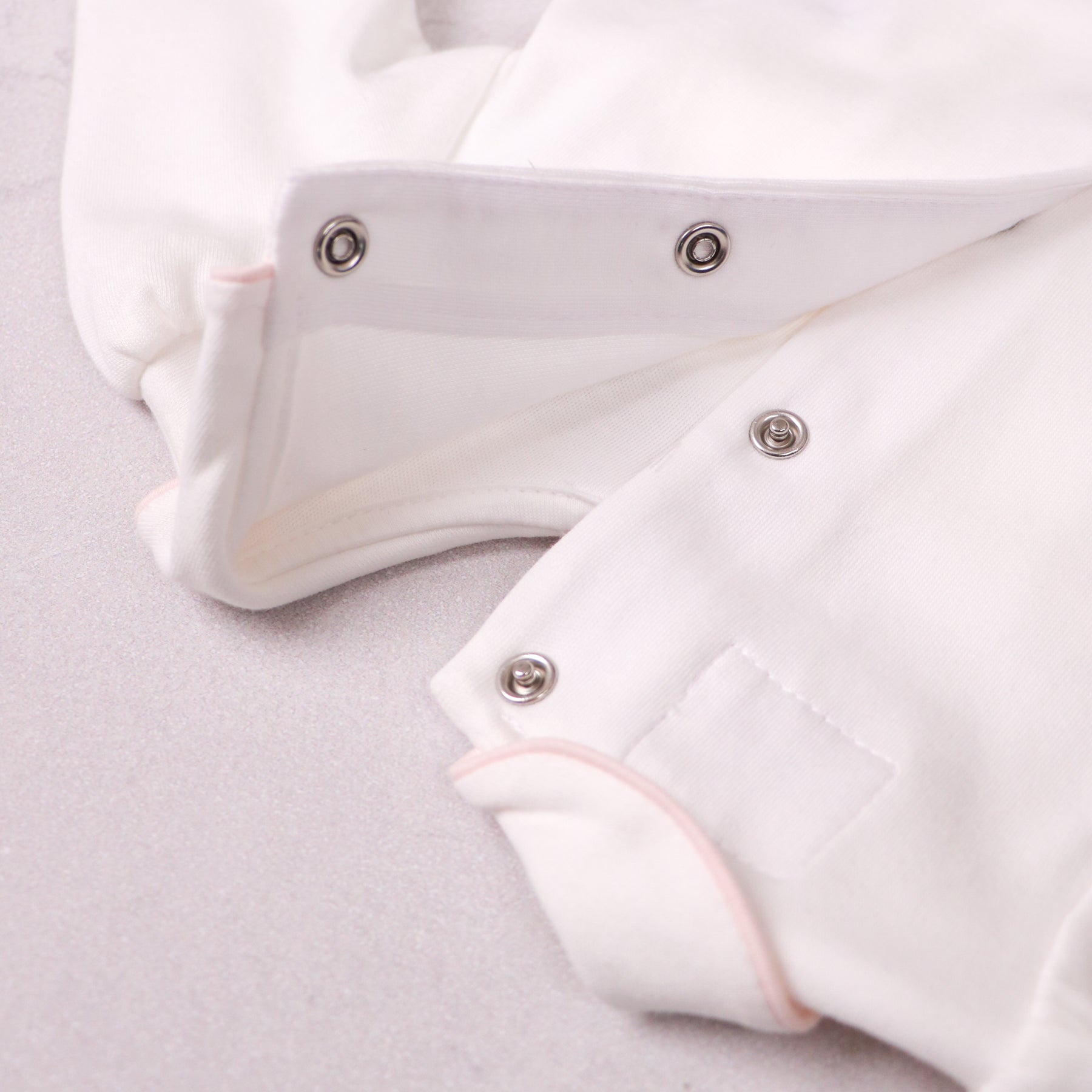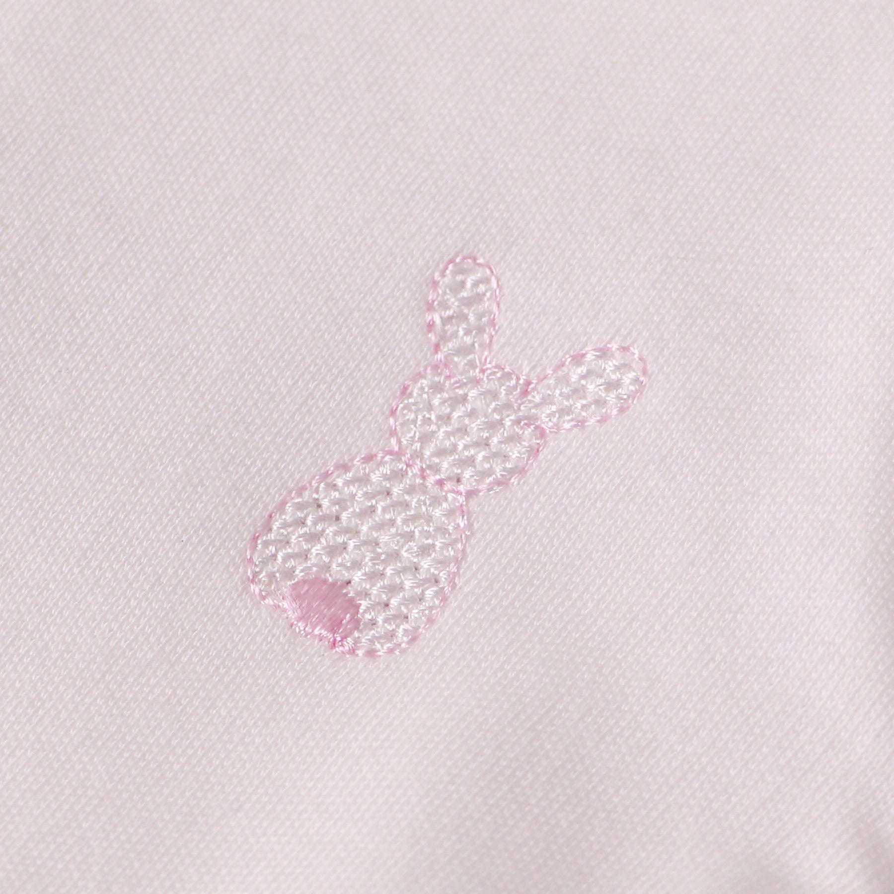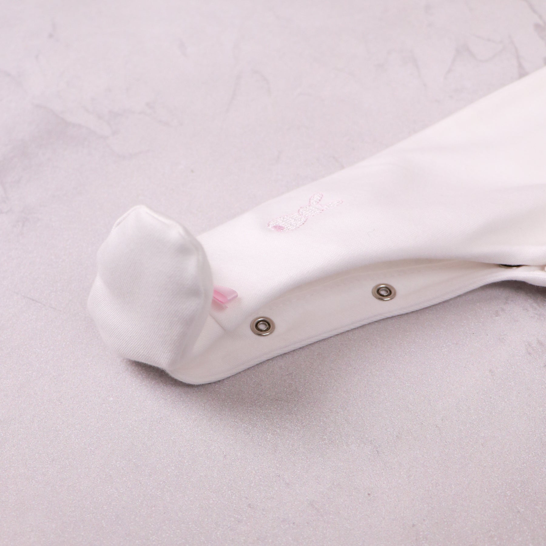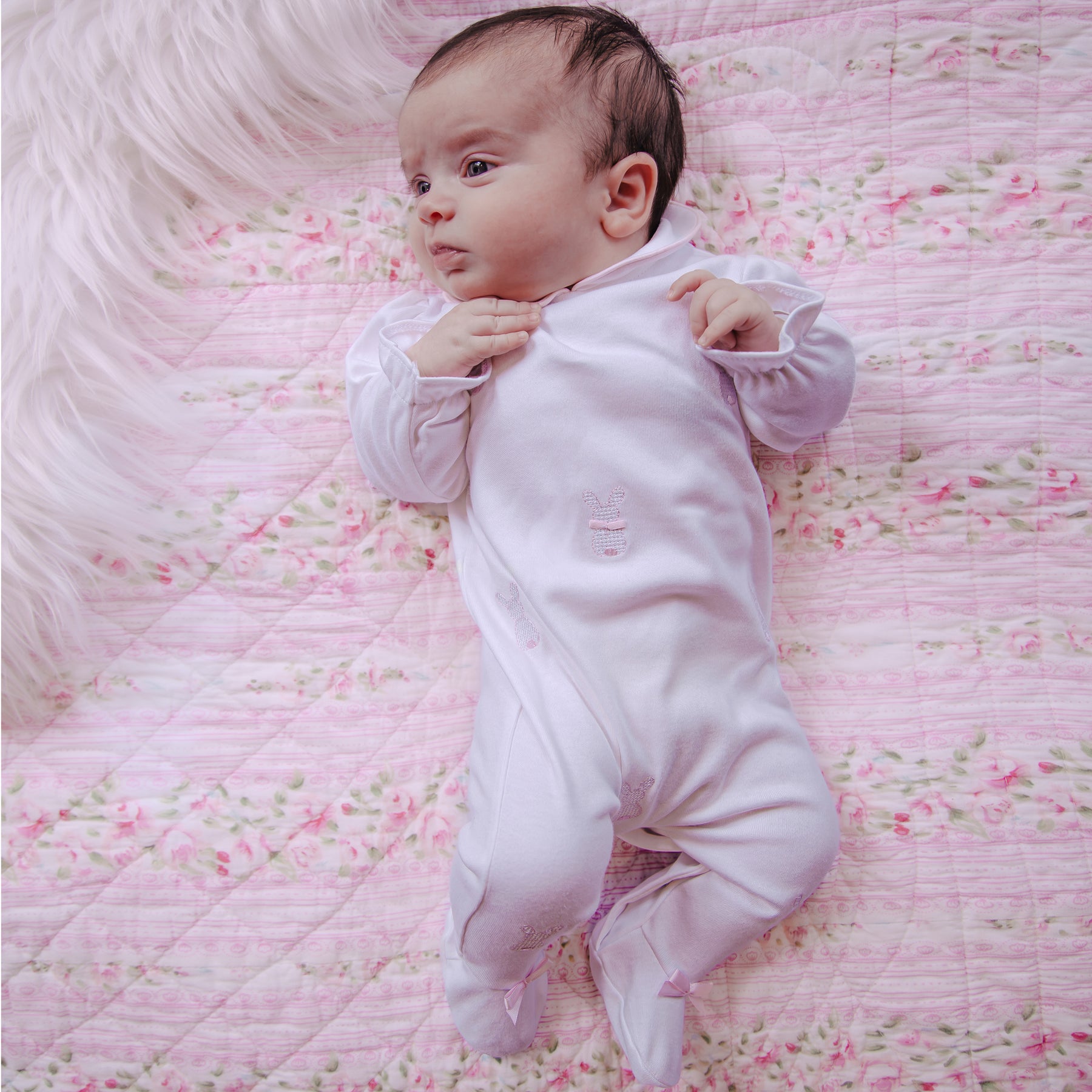 Small embroidered pink bunnies adorn the front of this lovely little white babygrow. Simple in shape, with a neat rounded white collar with pink piped trim, pink satin bows on the feet and a super cute ribbon "bow-tie" to the central bunny. This baby girls babygrow is perfect for napping or playing. Also comes with matching pull on hat.