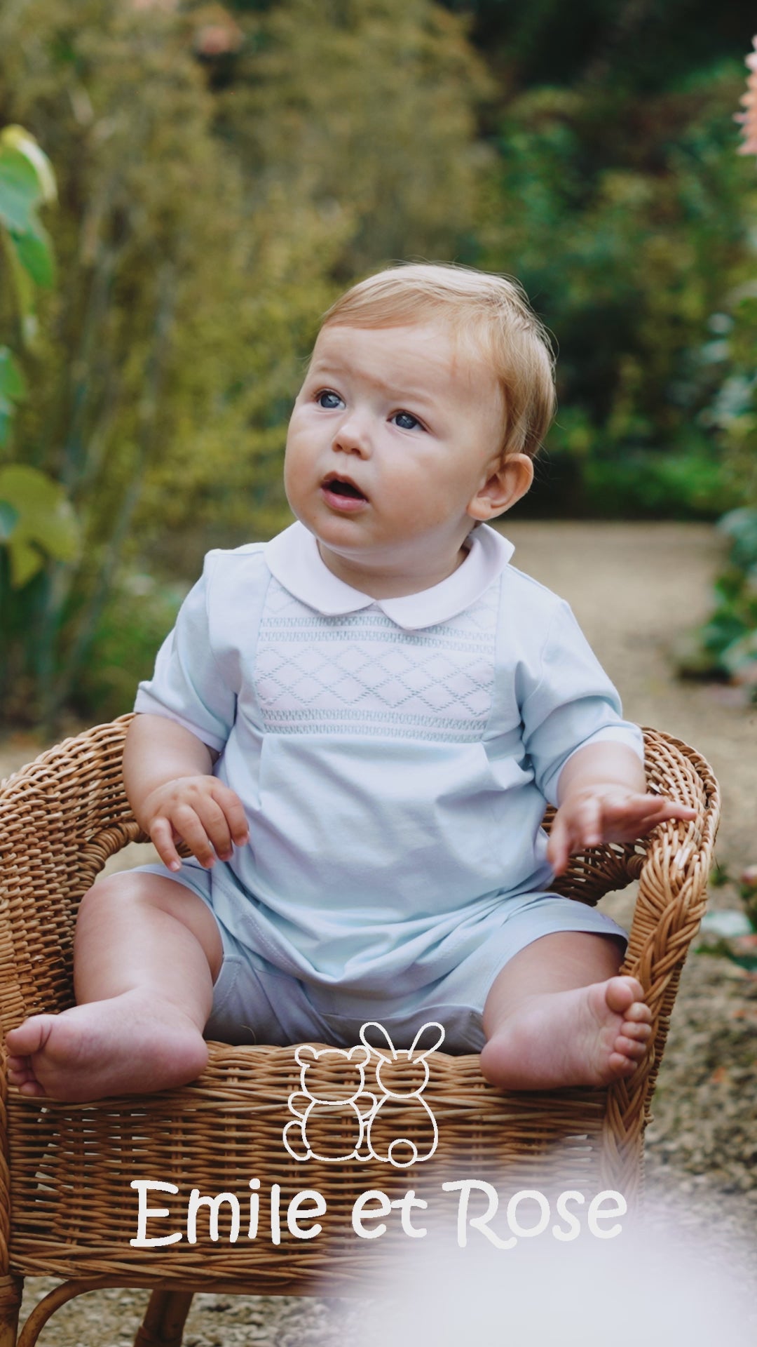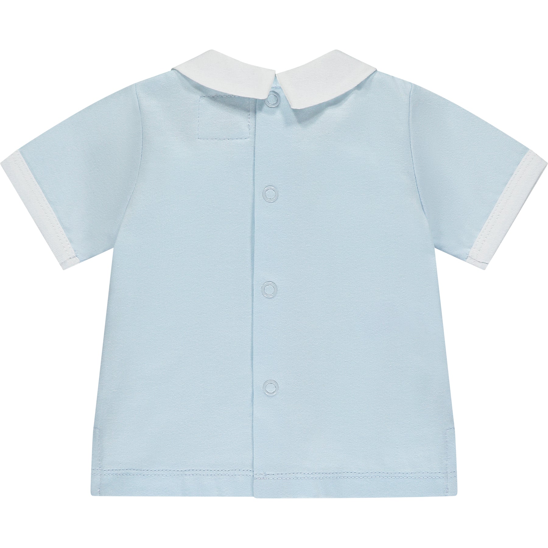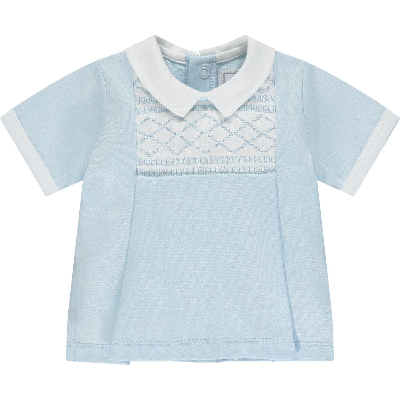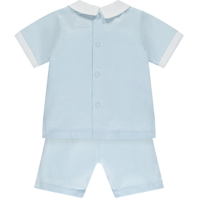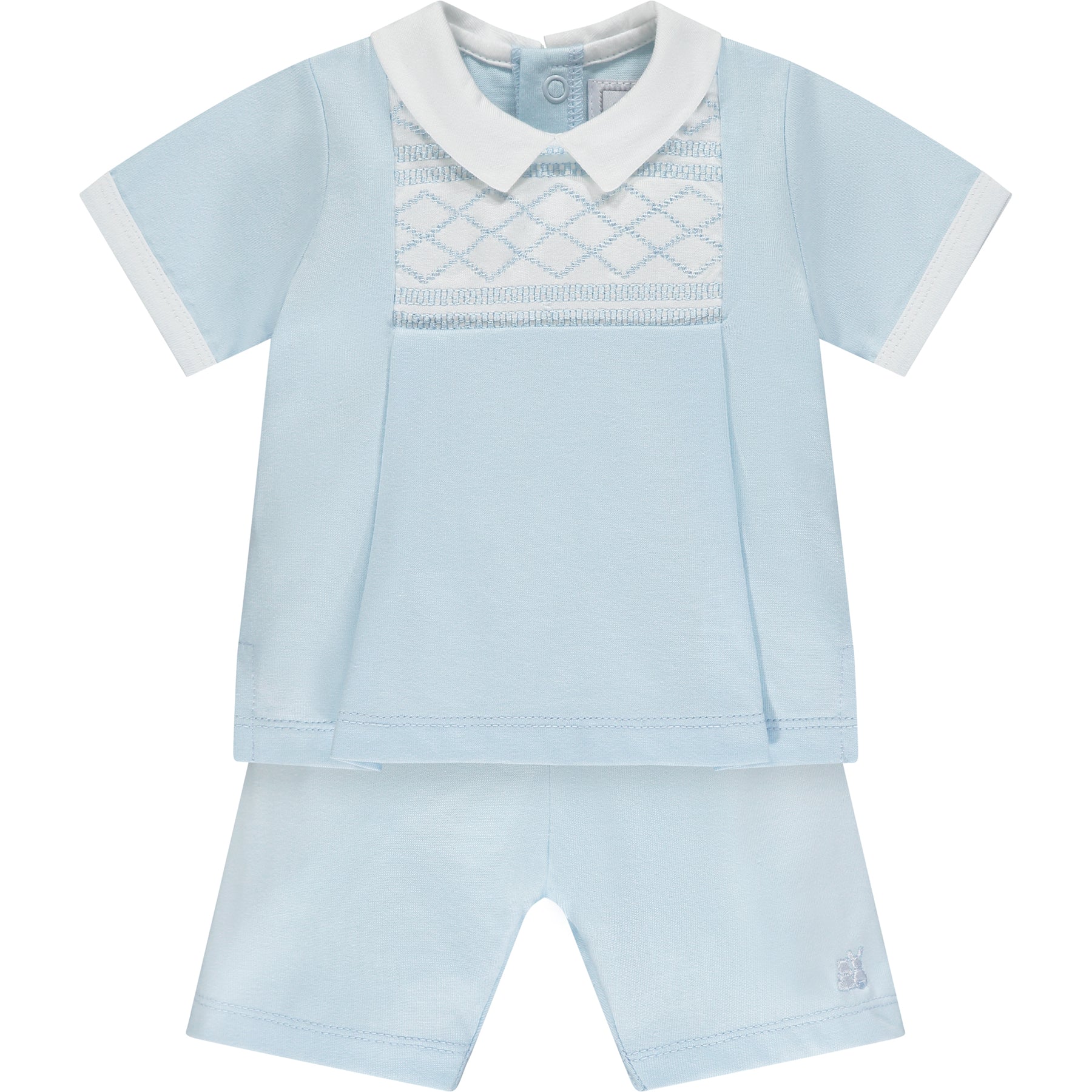 Similar to Drake but this time in a smart little two-piece, Dale is perfect for any occasion. The top has the same beautifully embroidered yoke with chequered and criss-cross design, framed by a crisp white collar. The pleats give this a smocked effect and teamed with soft jersey shorts, its very comfy for baby.
