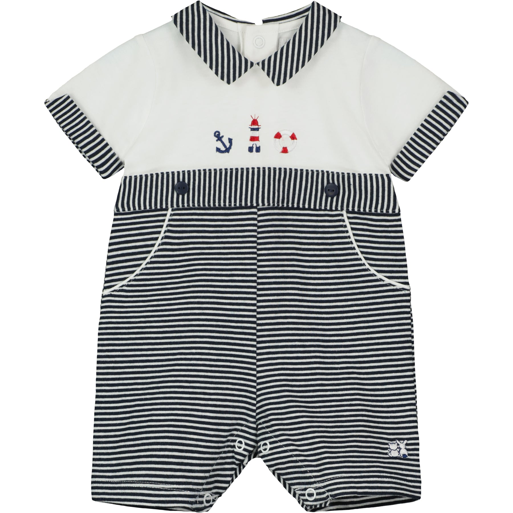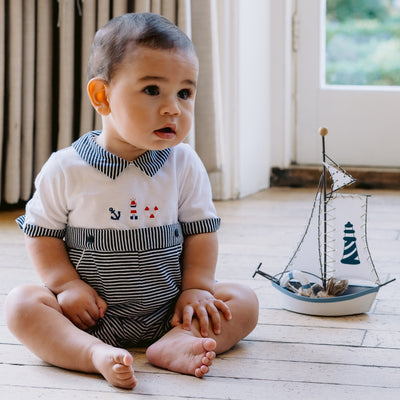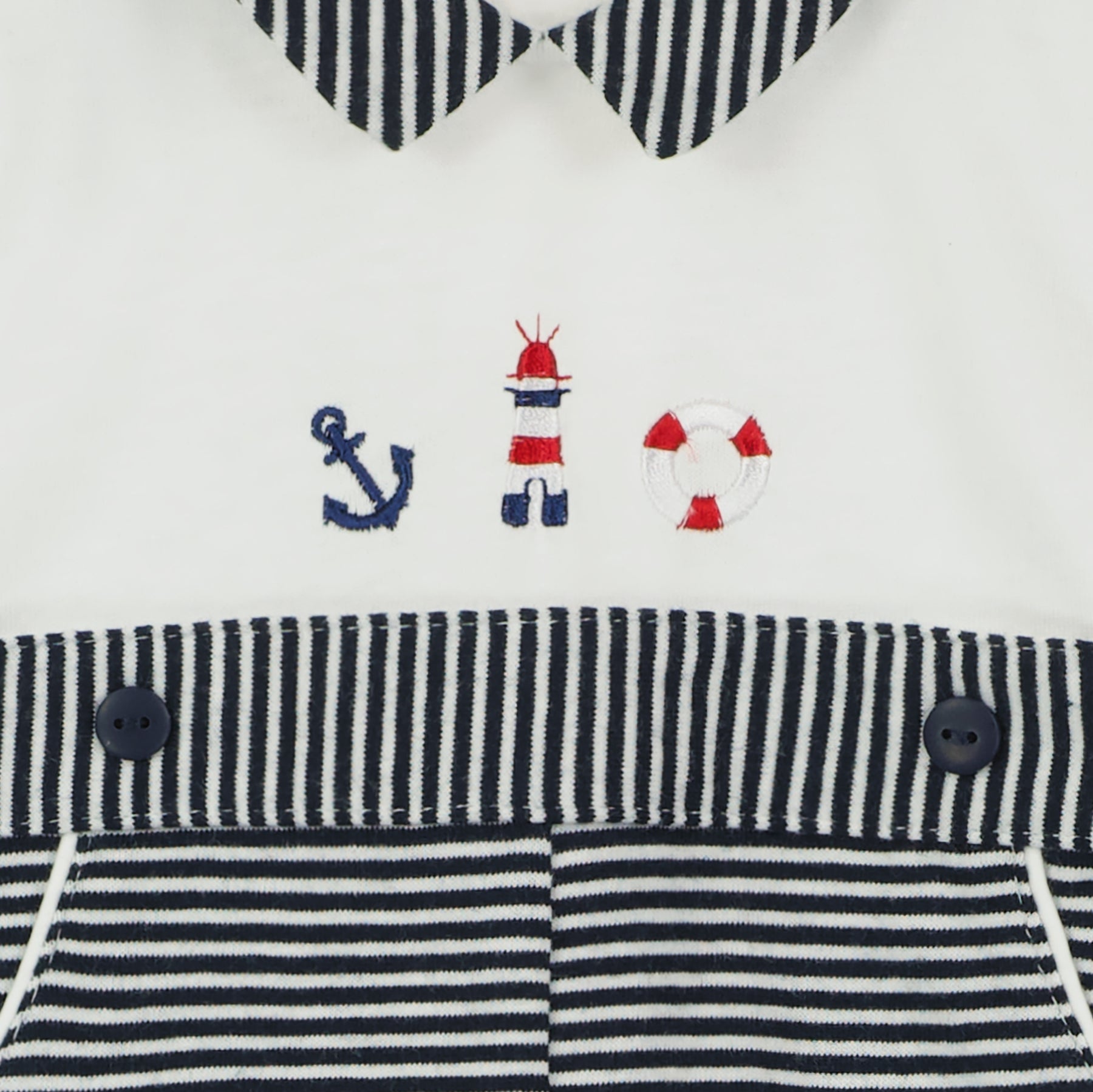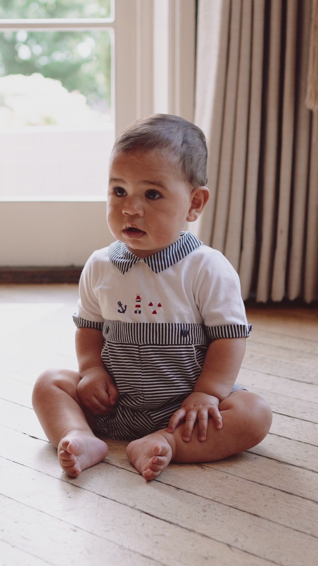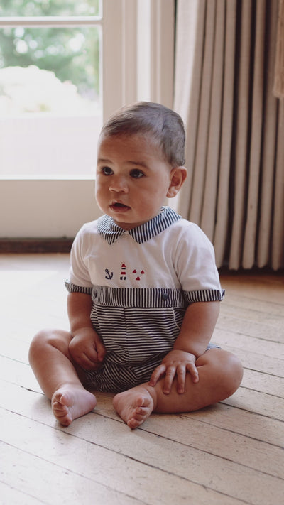 Similar to Finlay but this time in a romper, the nautical theme continues with Finch. The collar and sleeve turnups of this gorgeous romper are decorated with striking navy and white stripes. Cute nautical embroideries of an anchor, lighthouse and buoy adorn the front. The lower part has horizonal stripes with little side pockets trimmed with white piping. A vertical striped waistband with two little navy buttons complete this adorable romper.