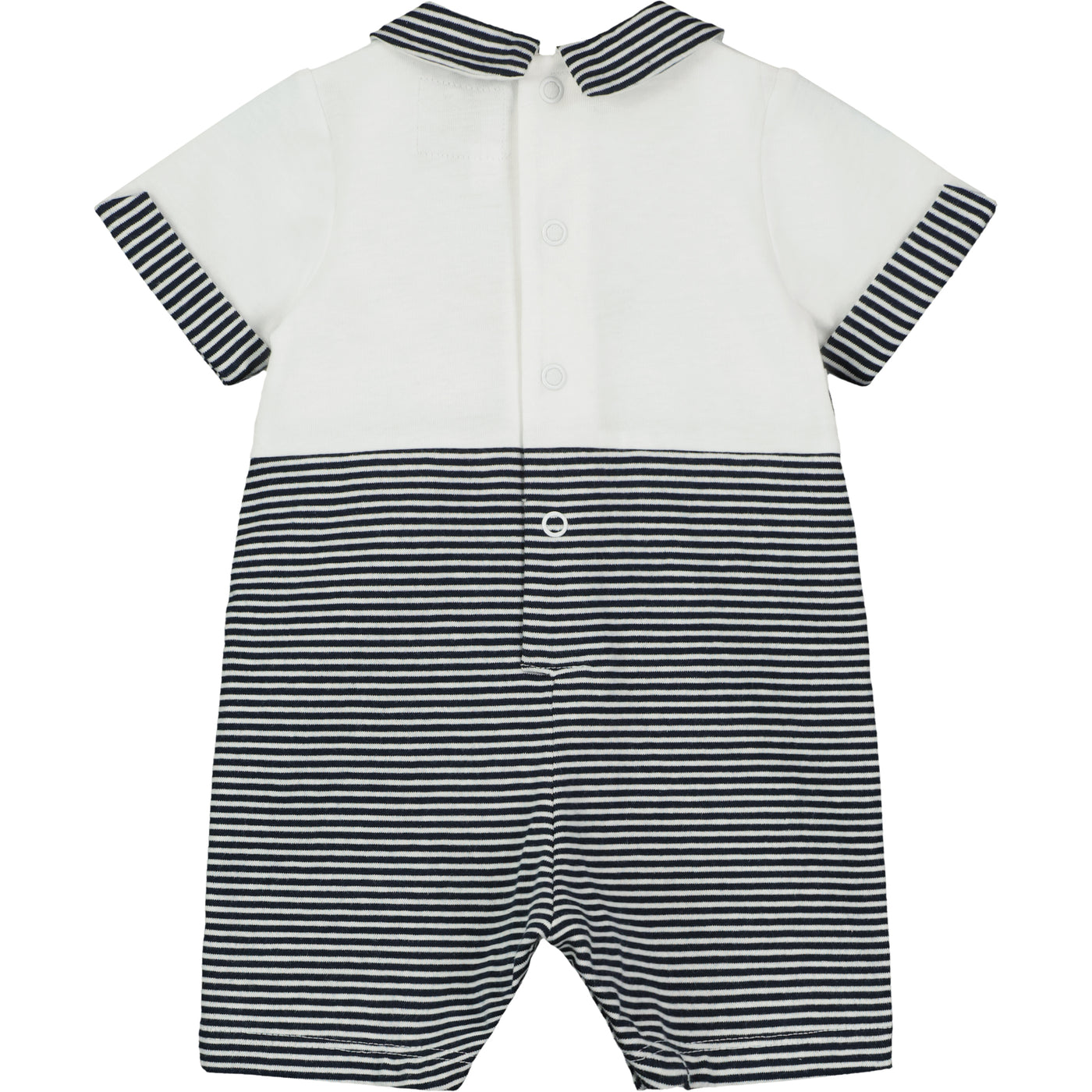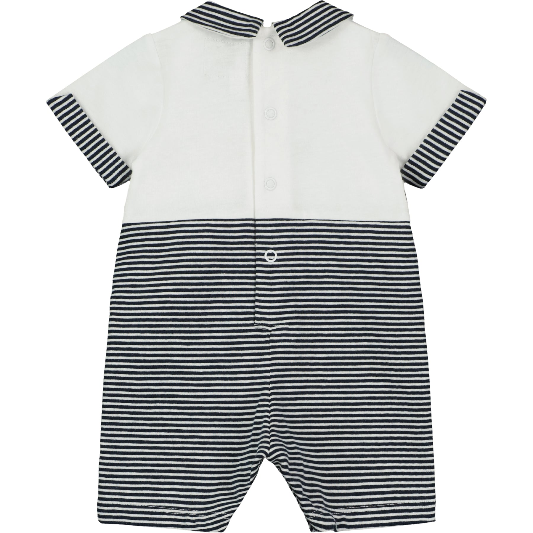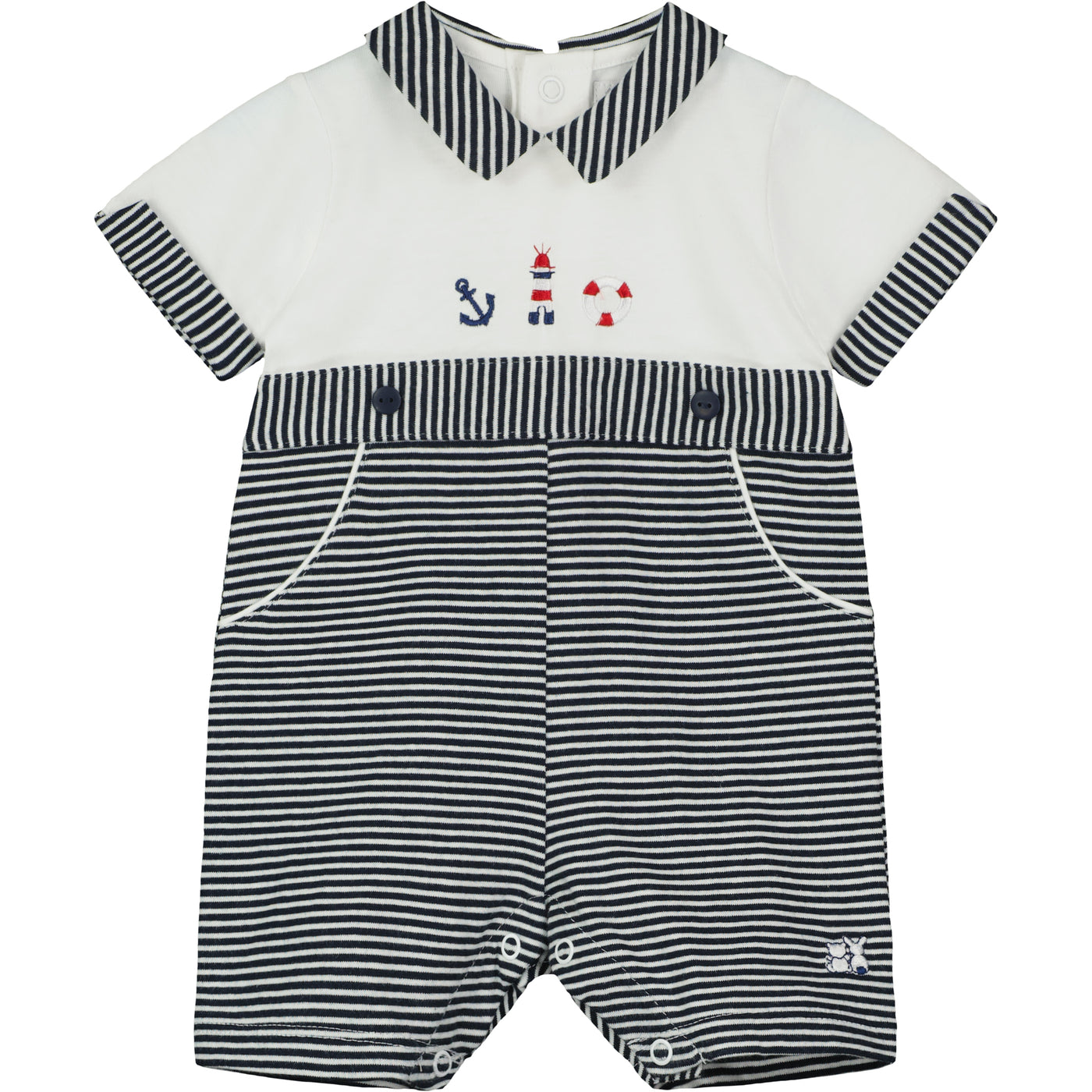 Similar to Finlay but this time in a romper, the nautical theme continues with Finch. The collar and sleeve turnups of this gorgeous romper are decorated with striking navy and white stripes. Cute nautical embroideries of an anchor, lighthouse and buoy adorn the front. The lower part has horizonal stripes with little side pockets trimmed with white piping. A vertical striped waistband with two little navy buttons complete this adorable romper.