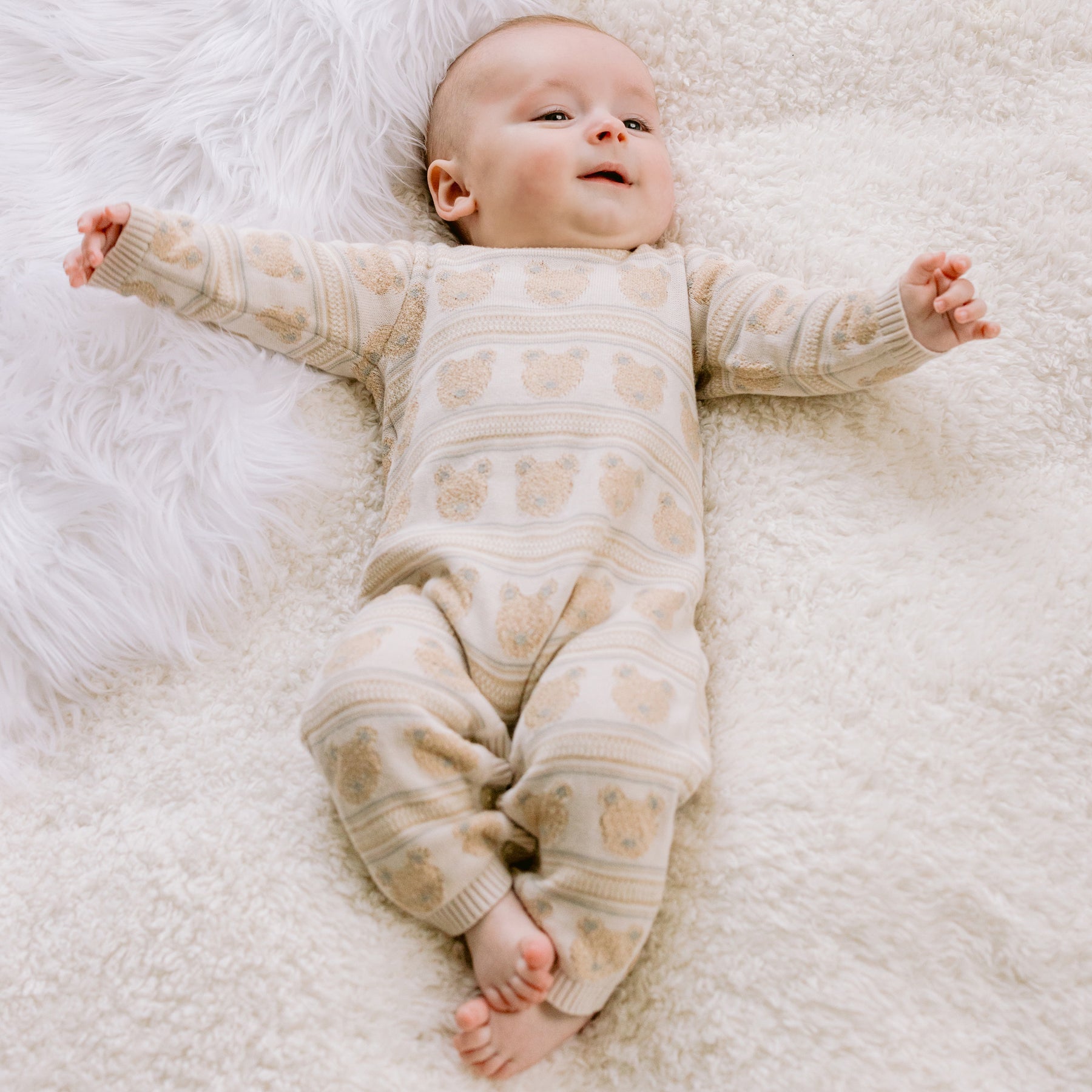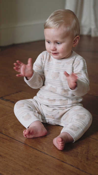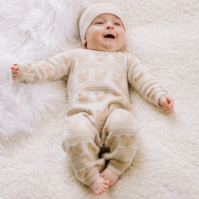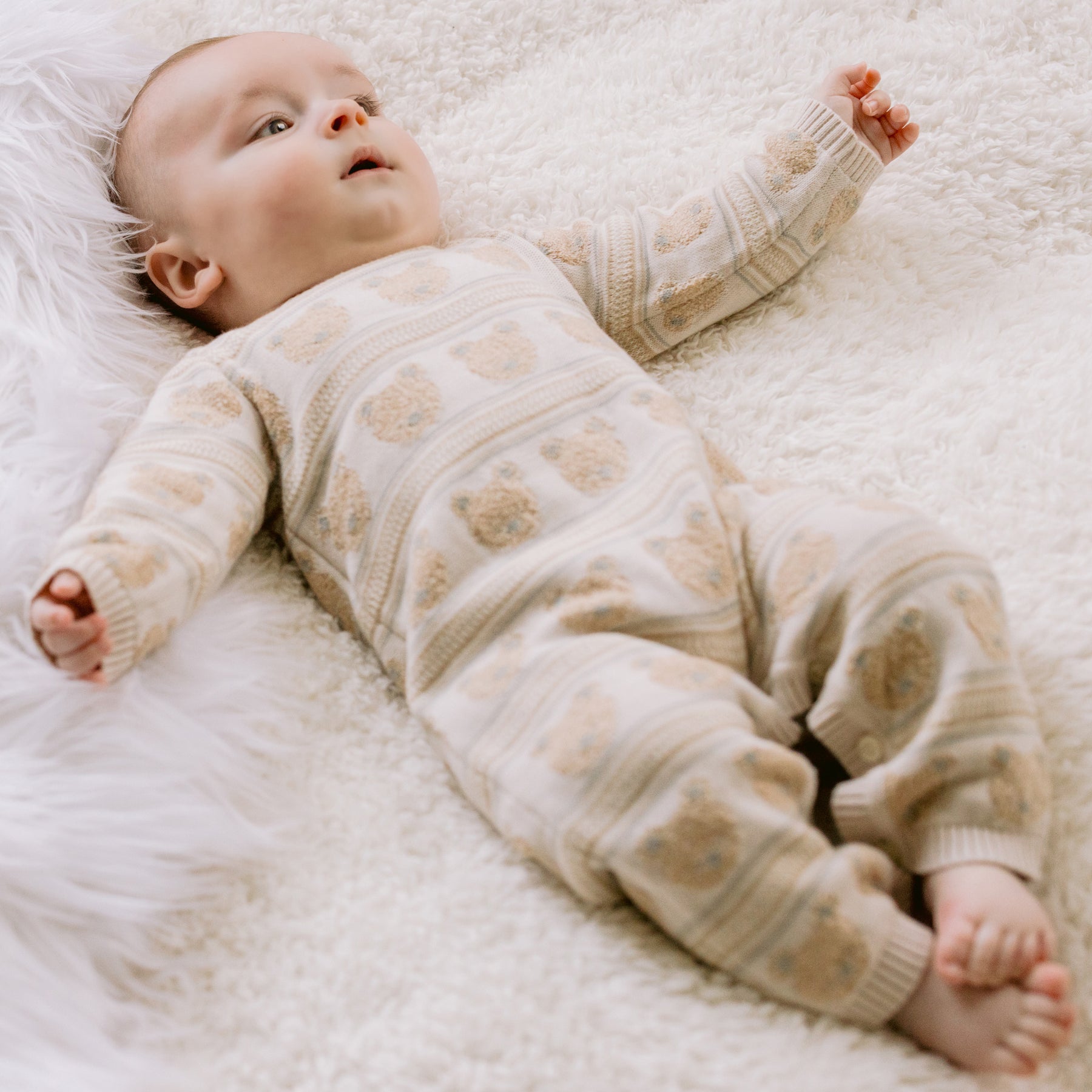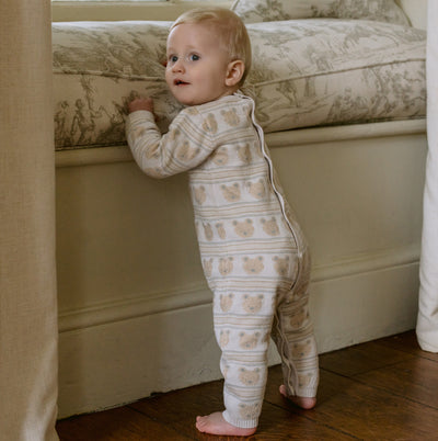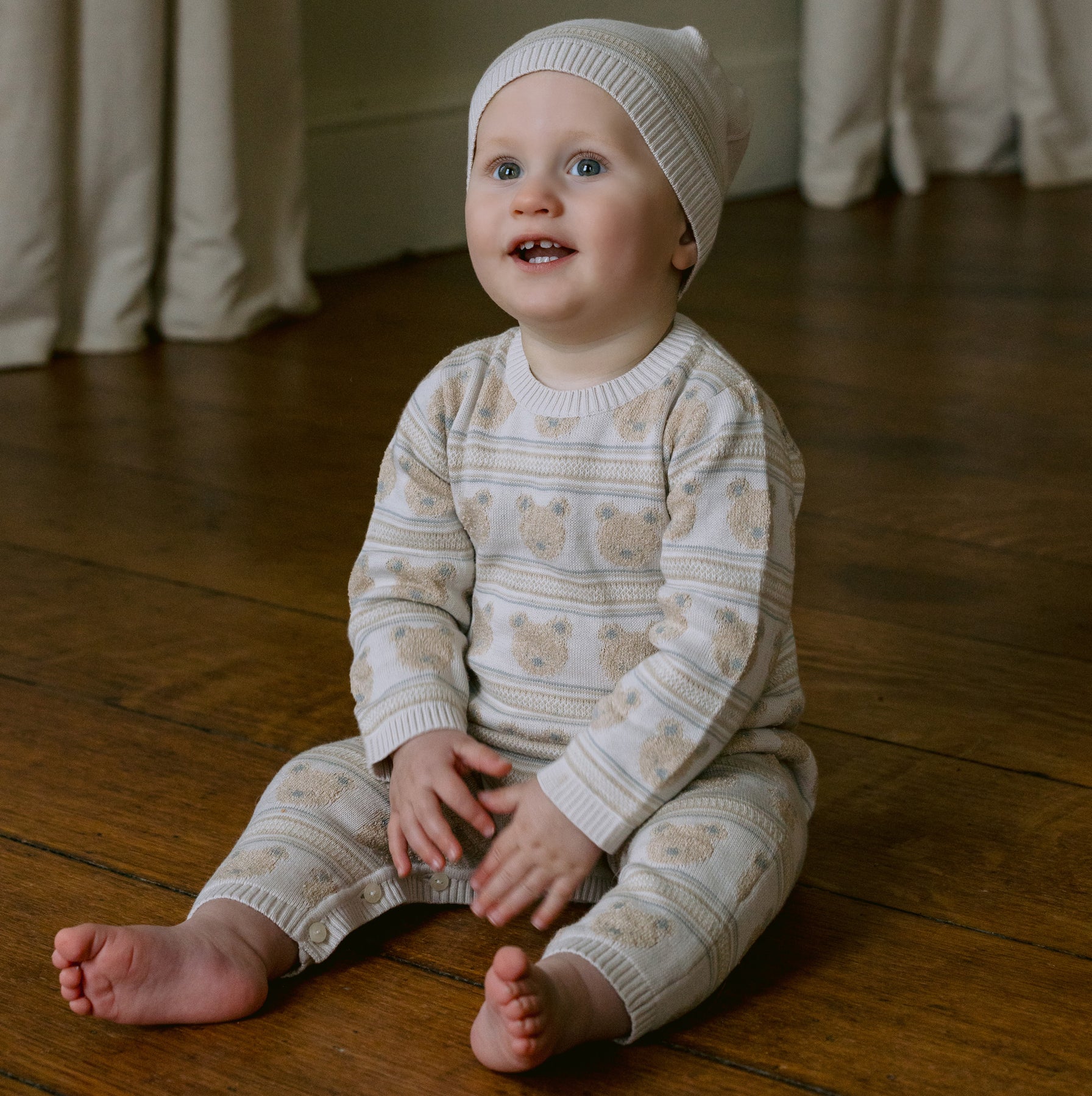 Harry, our lovely knitted all in one, should be part of any little boys’ wardrobe. Something a little different, with alternating rows of stone, caramel, grey and white stitching the main feature of this garment is the repeated rows of cute little teddy heads. Ribbed neck, cuffs and matching hat ensure cosy comfort for your little cub.