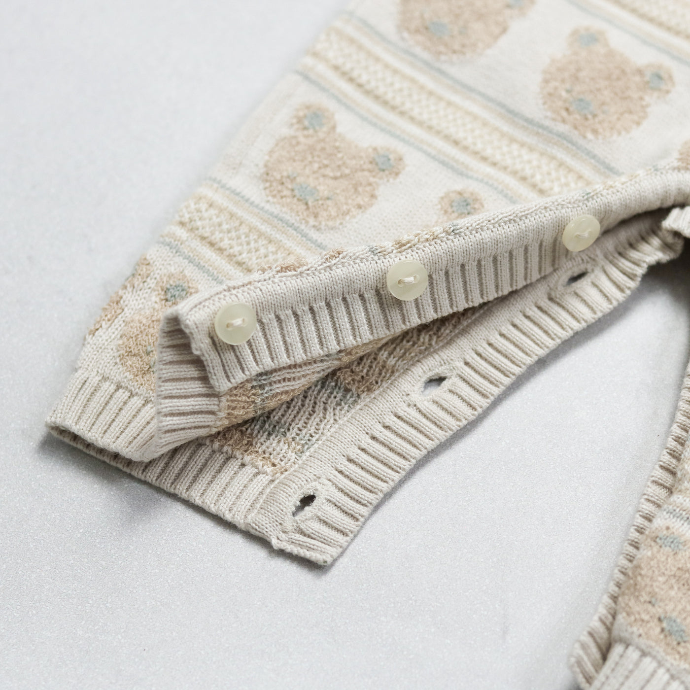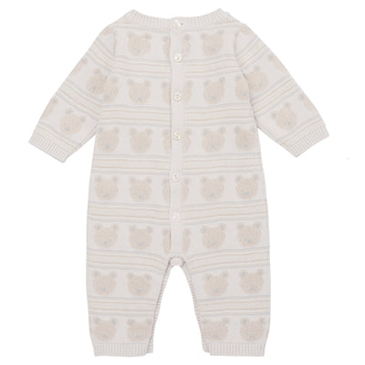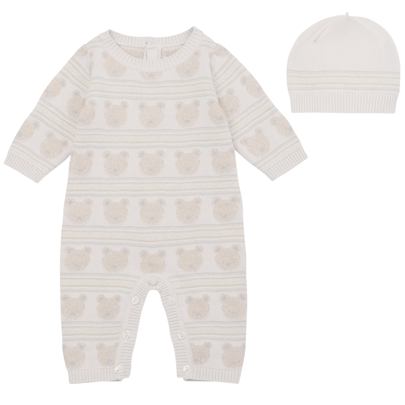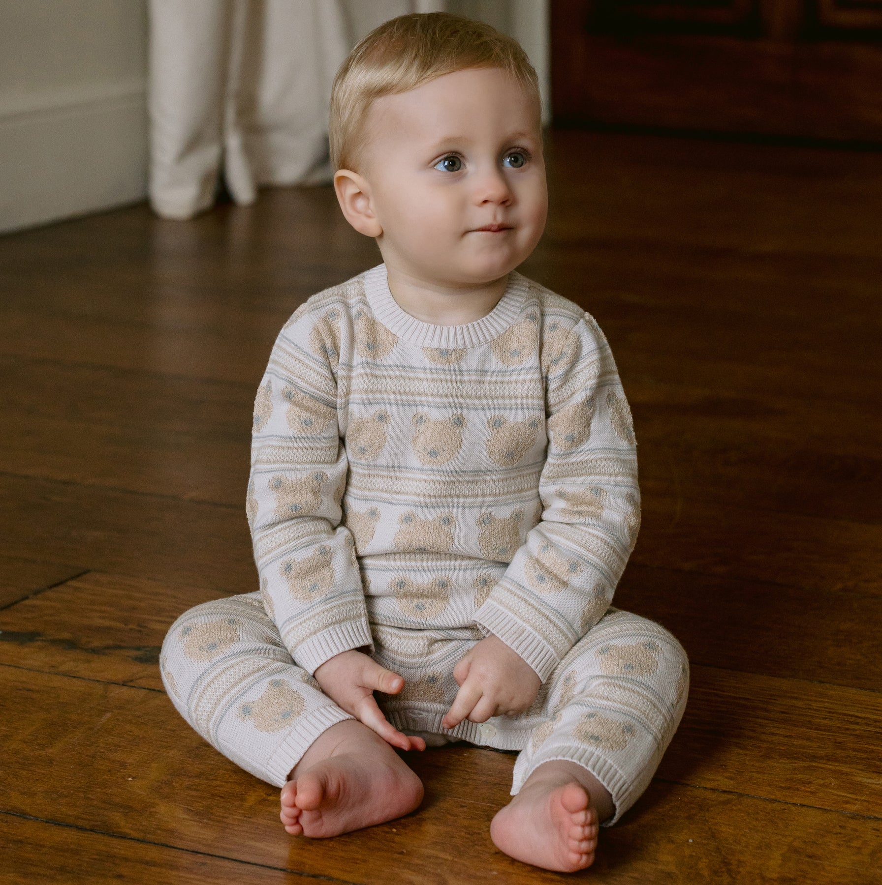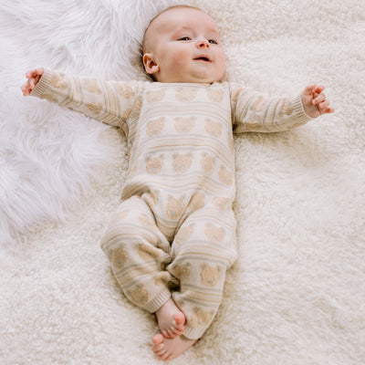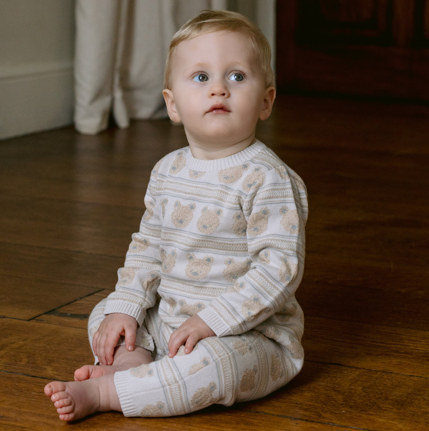 Harry, our lovely knitted all in one, should be part of any little boys’ wardrobe. Something a little different, with alternating rows of stone, caramel, grey and white stitching the main feature of this garment is the repeated rows of cute little teddy heads. Ribbed neck, cuffs and matching hat ensure cosy comfort for your little cub.