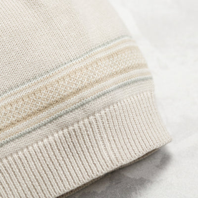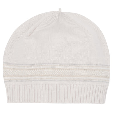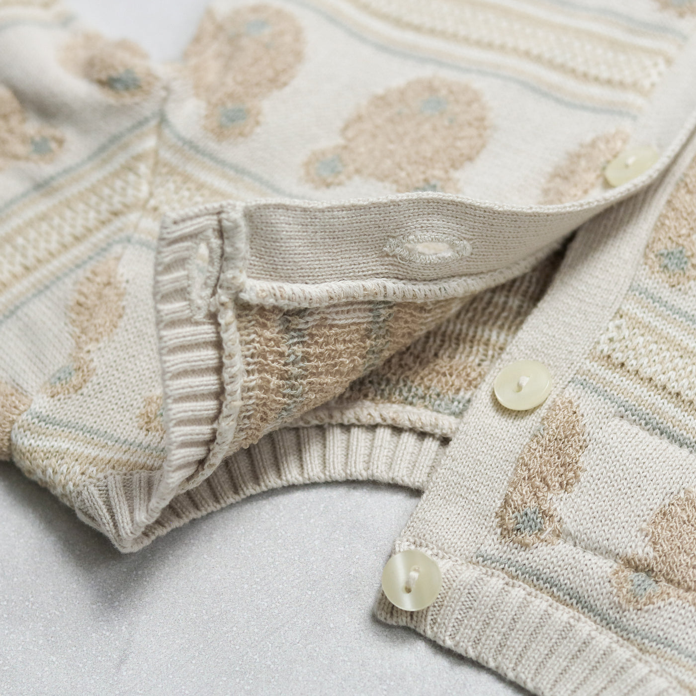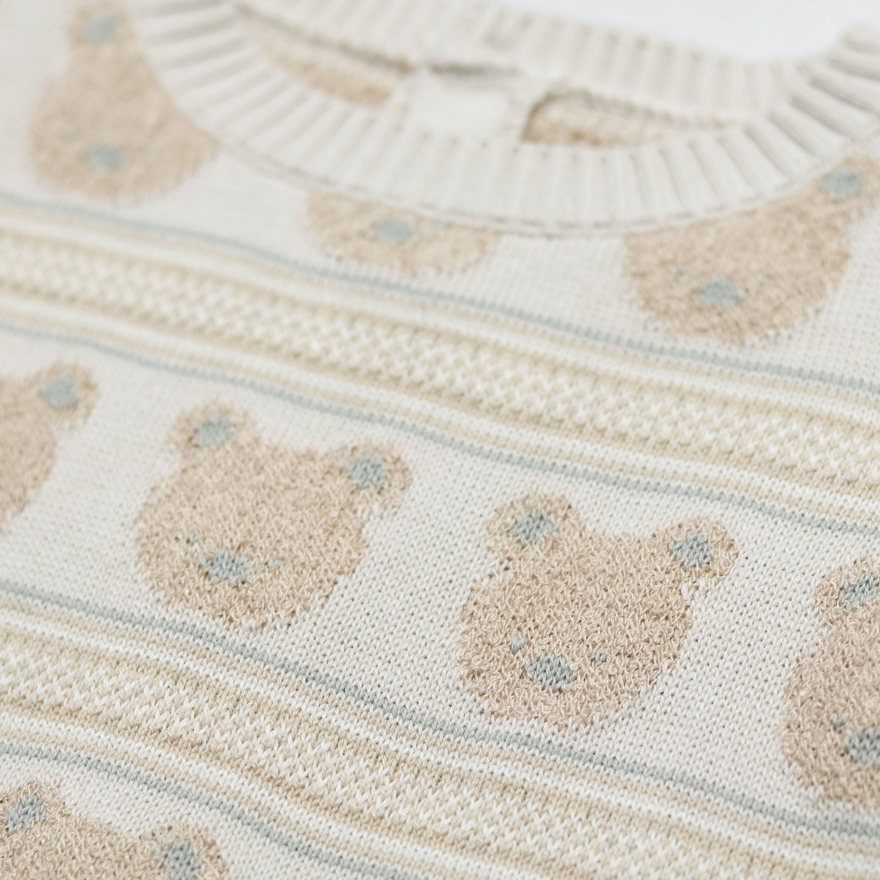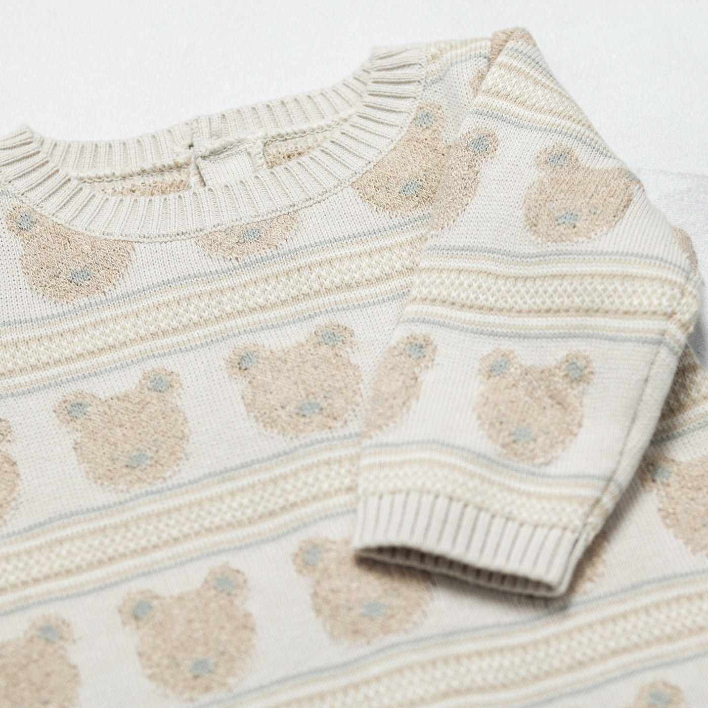Harry, our lovely knitted all in one, should be part of any little boys’ wardrobe. Something a little different, with alternating rows of stone, caramel, grey and white stitching the main feature of this garment is the repeated rows of cute little teddy heads. Ribbed neck, cuffs and matching hat ensure cosy comfort for your little cub.