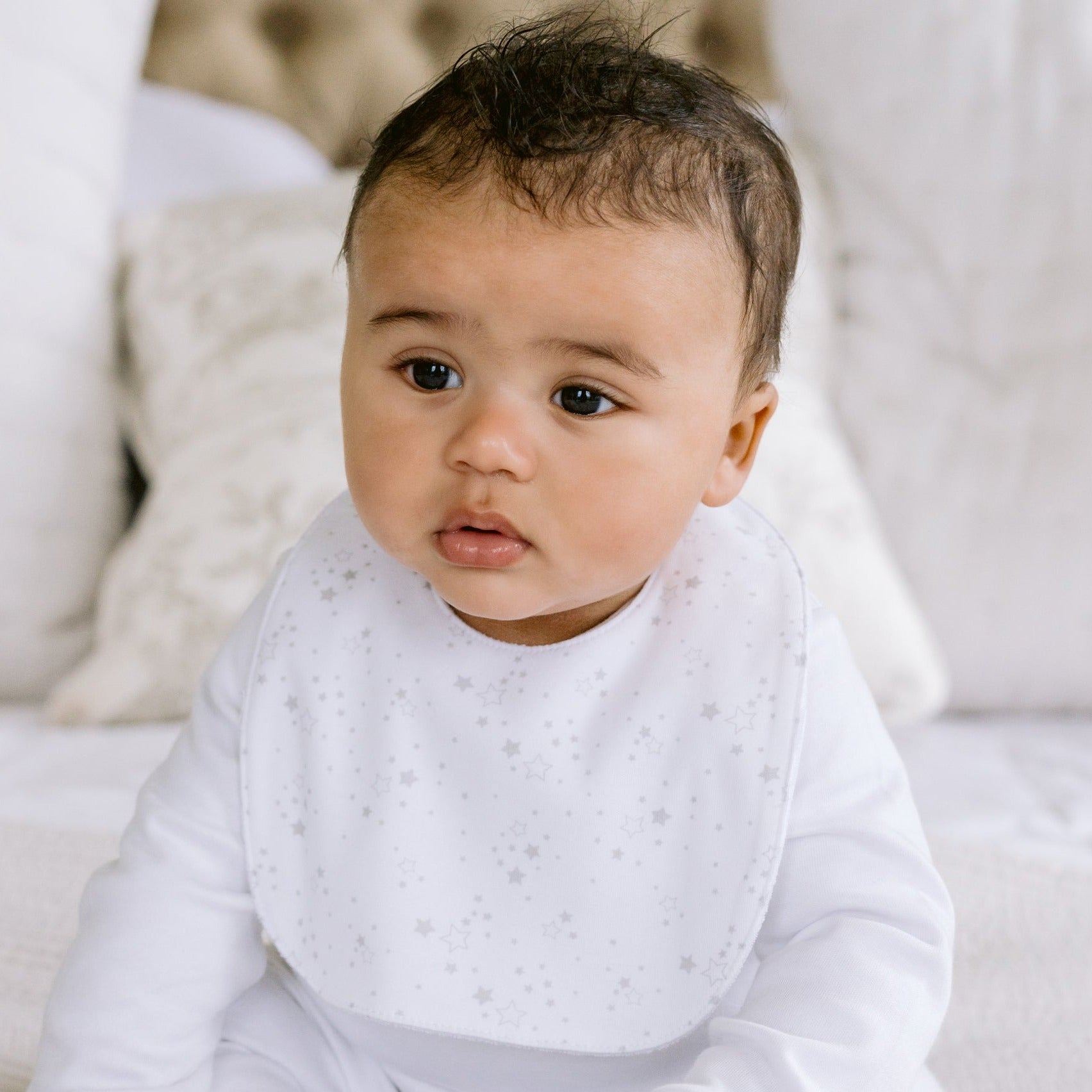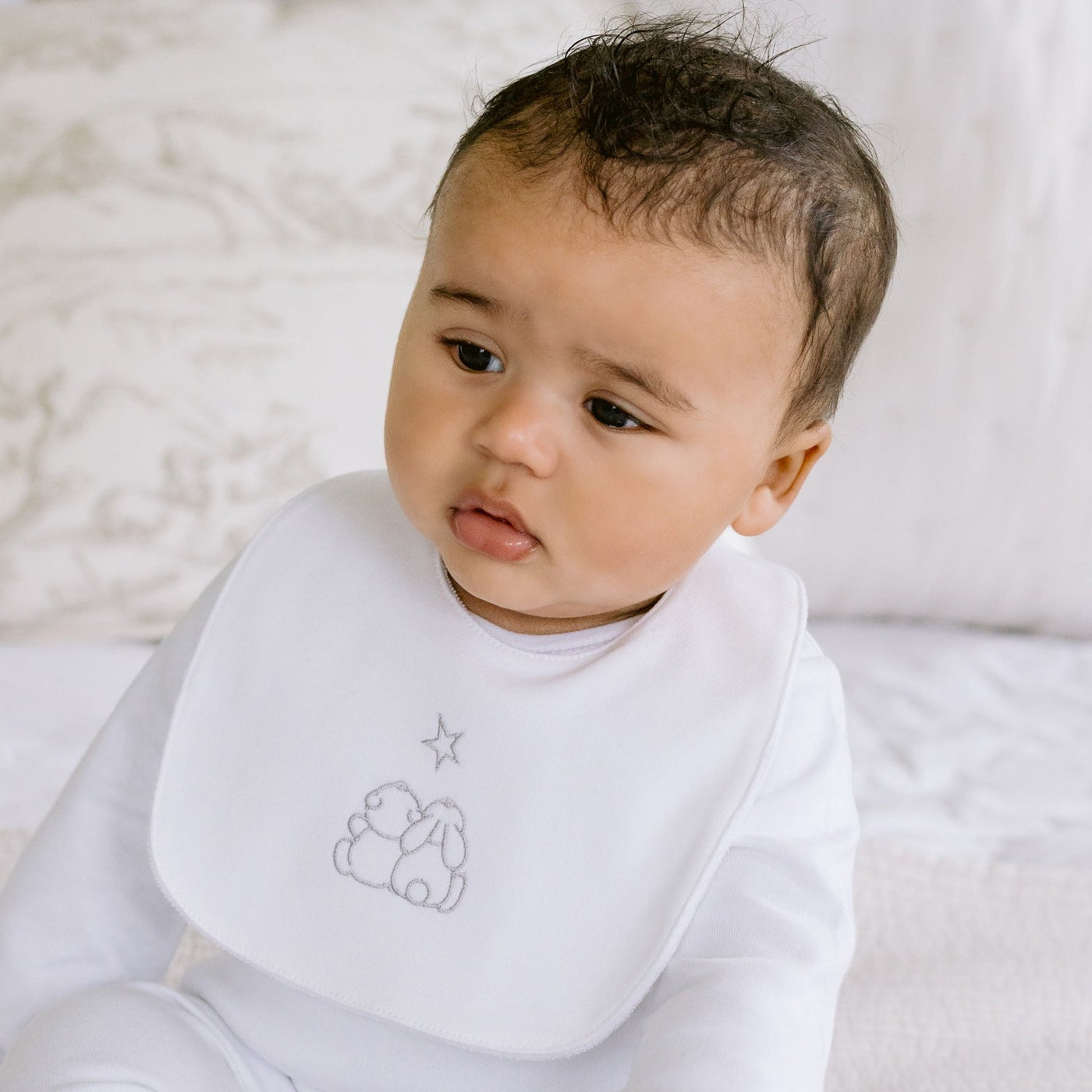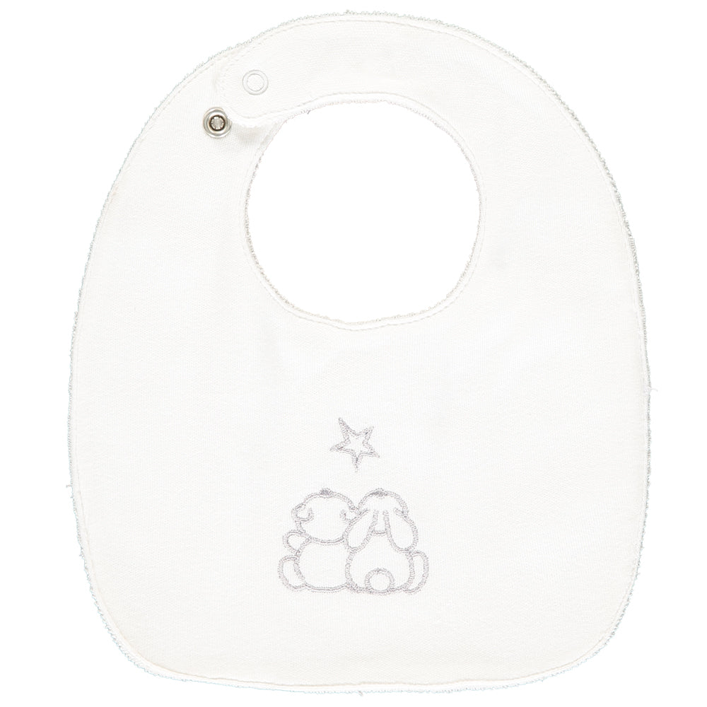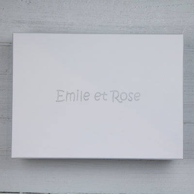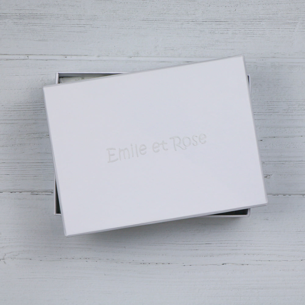Eine weitere Geschenkoption für Ihr neues Familienmitglied. Sie enthalten unseren liebenswerten weißen Bären Emile und zwei praktische Lätzchen, eines mit hellgrauem Sternenaufdruck und das andere mit gesticktem Emile und Rose. Sie bestehen aus weicher Baumwolle mit Frottee auf der Rückseite. Dieses kleine Geschenk wird in einer weißen Geschenkbox mit durchsichtigem Fenster geliefert, die mit dem charakteristischen Emile et Rose-Logo und Banddetails verziert ist und mit Seidenpapier ausgekleidet ist.