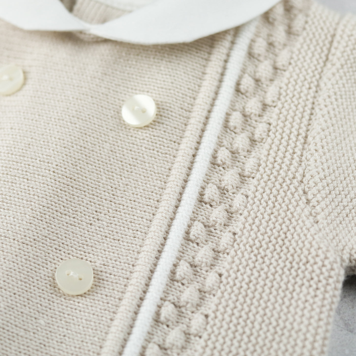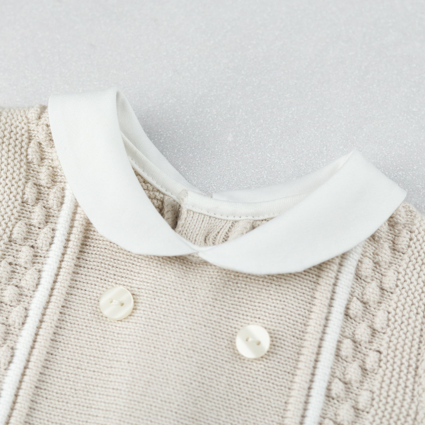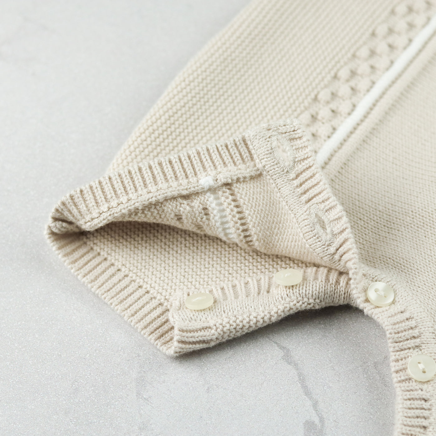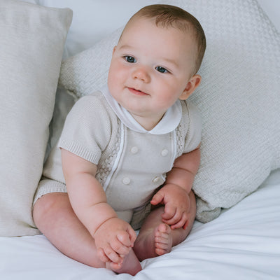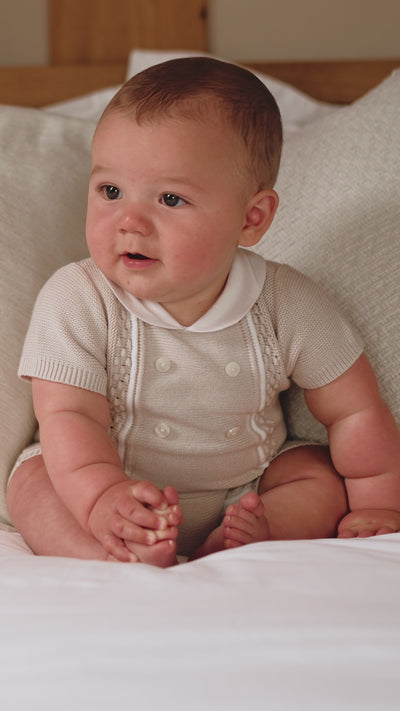 Introducing our Java romper, a new addition to our stone coloured garments. Similar to our blue James romper, Java is a great unisex option. It has the same textured knit sides, contrasting white stitch style panel and decorative buttons, but this time with a sweet rounded white collar. The same buttons are also on the reverse of the garment and leg opening. A fabulous addition to any baby's wardrobe.