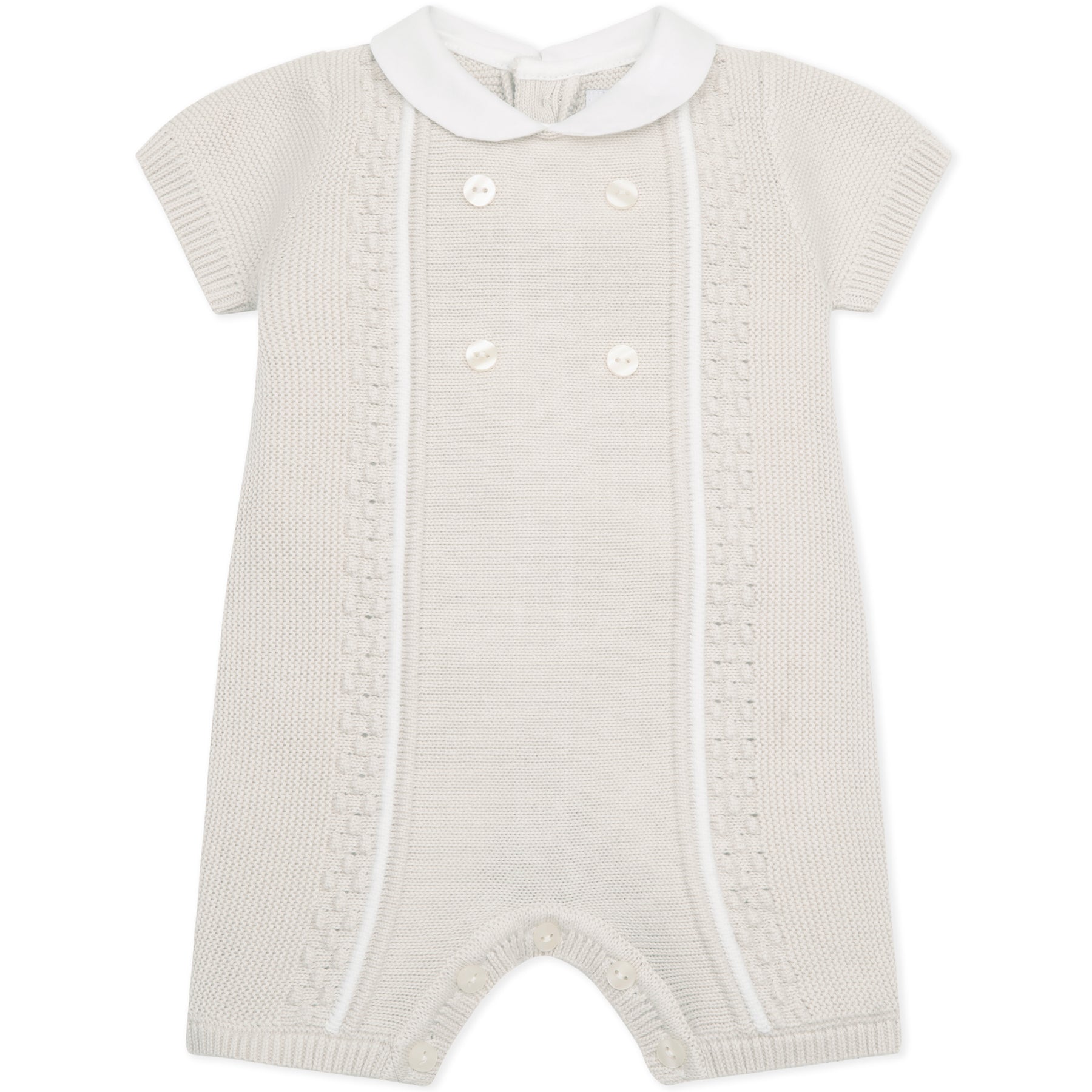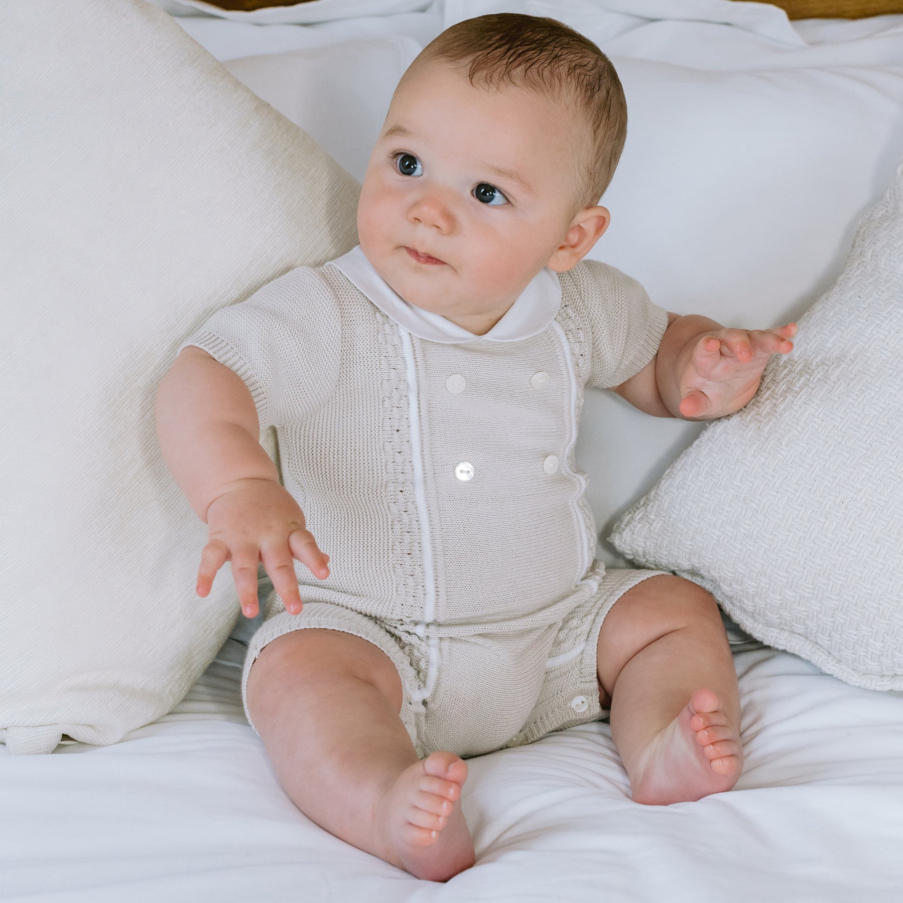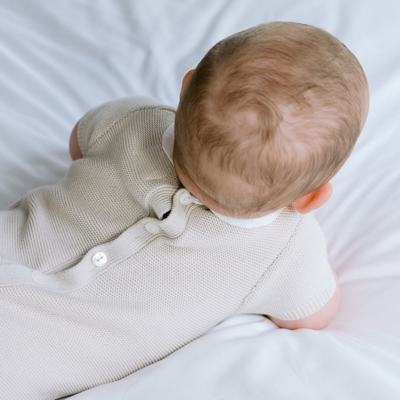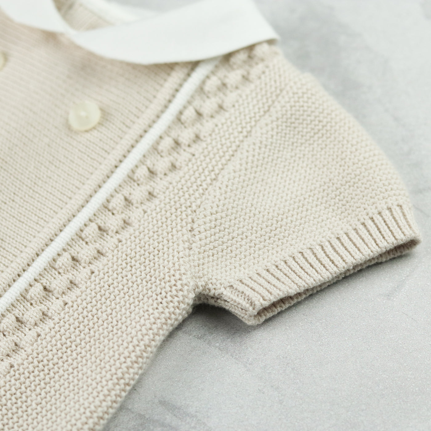 Introducing our Java romper, a new addition to our stone coloured garments. Similar to our blue James romper, Java is a great unisex option. It has the same textured knit sides, contrasting white stitch style panel and decorative buttons, but this time with a sweet rounded white collar. The same buttons are also on the reverse of the garment and leg opening. A fabulous addition to any baby's wardrobe.