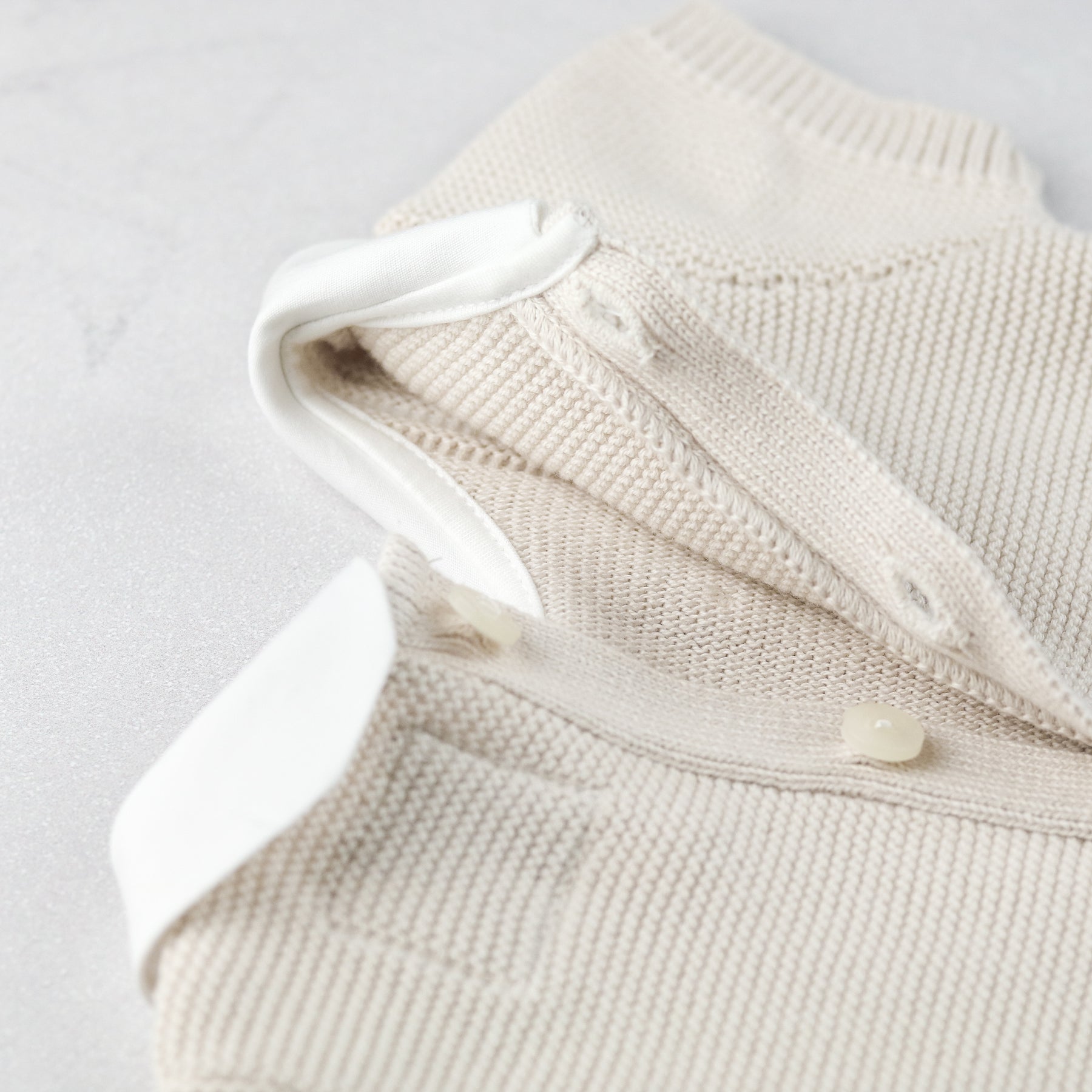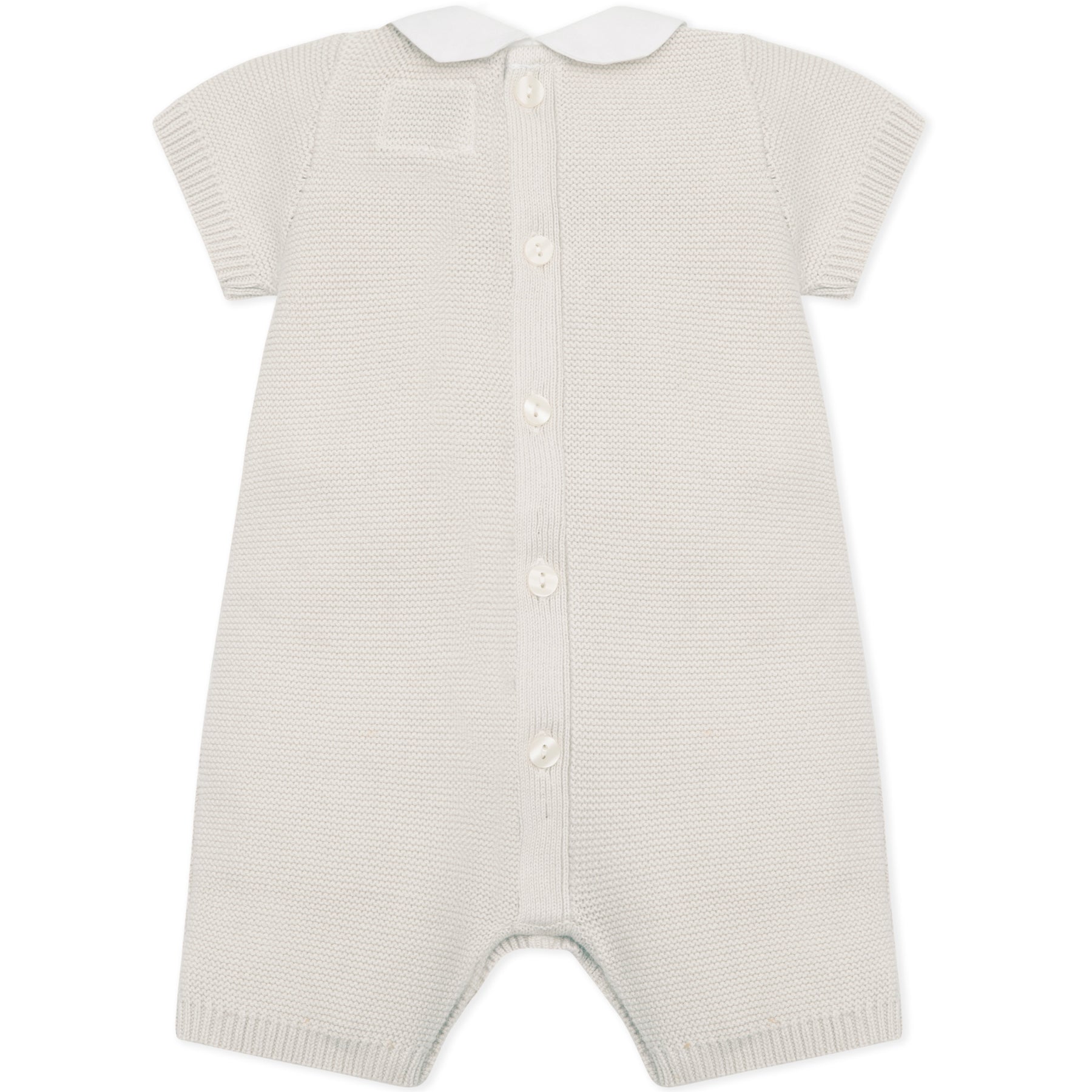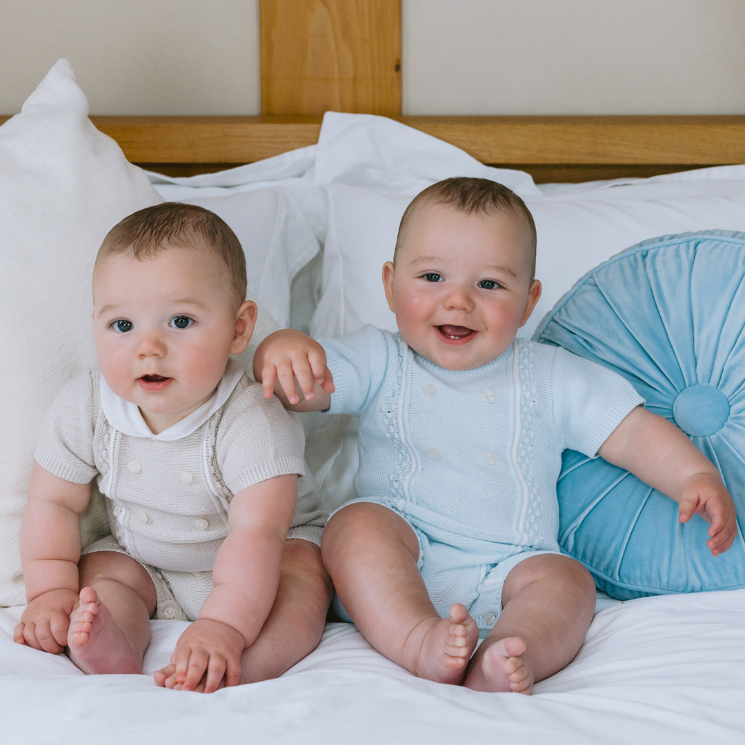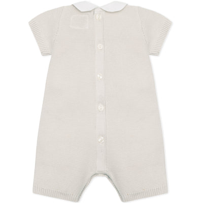 Introducing our Java romper, a new addition to our stone coloured garments. Similar to our blue James romper, Java is a great unisex option. It has the same textured knit sides, contrasting white stitch style panel and decorative buttons, but this time with a sweet rounded white collar. The same buttons are also on the reverse of the garment and leg opening. A fabulous addition to any baby's wardrobe.