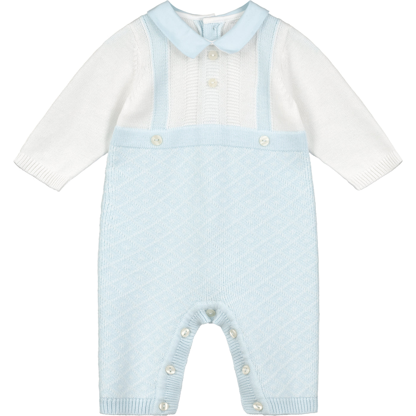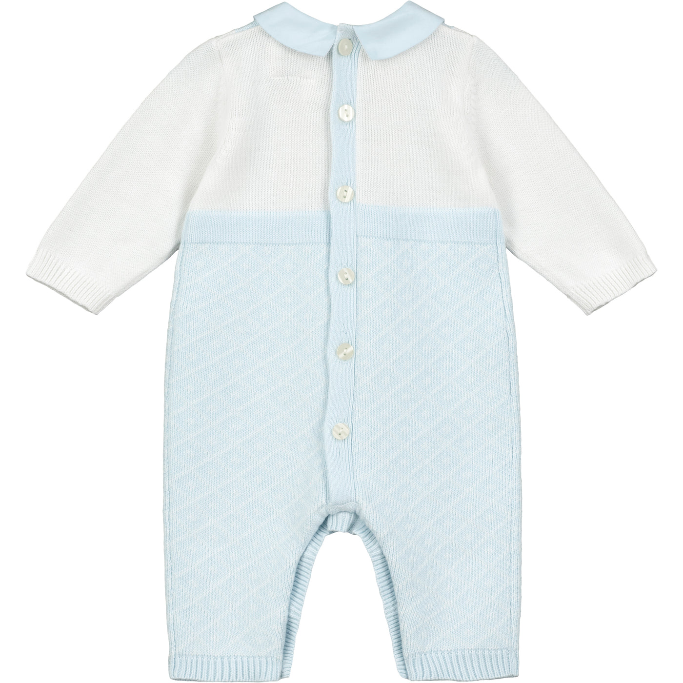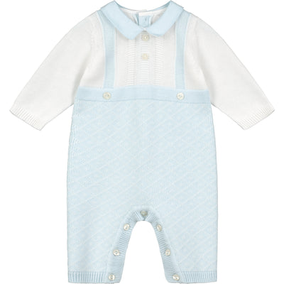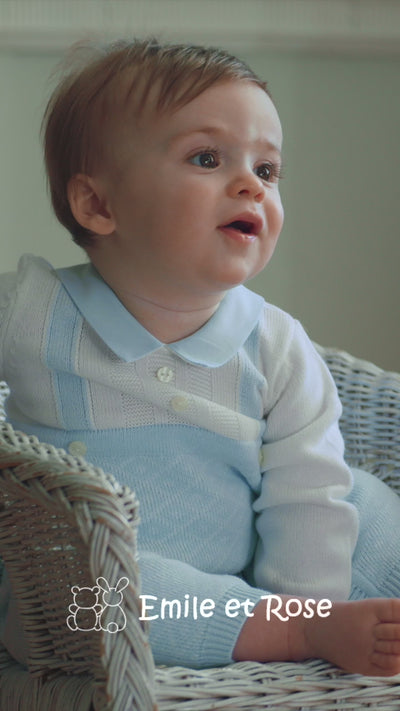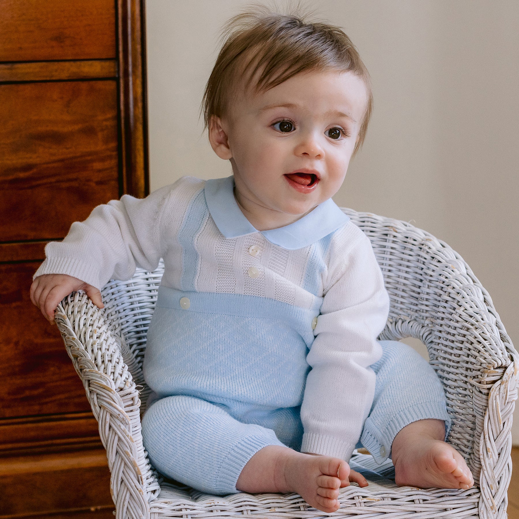 Earl ist ein hübscher kleiner All-in-One mit einigen klassischen Merkmalen. Das Kleidungsstück ist wunderschön mit verschiedenen Maschen gestrickt, die obere Hälfte ist weiß und der untere Teil in unserem charakteristischen Hellblau. Angetäuschte Hosenträger und ein kontrastierender kleiner blauer Kragen runden den Look hübsch ab.