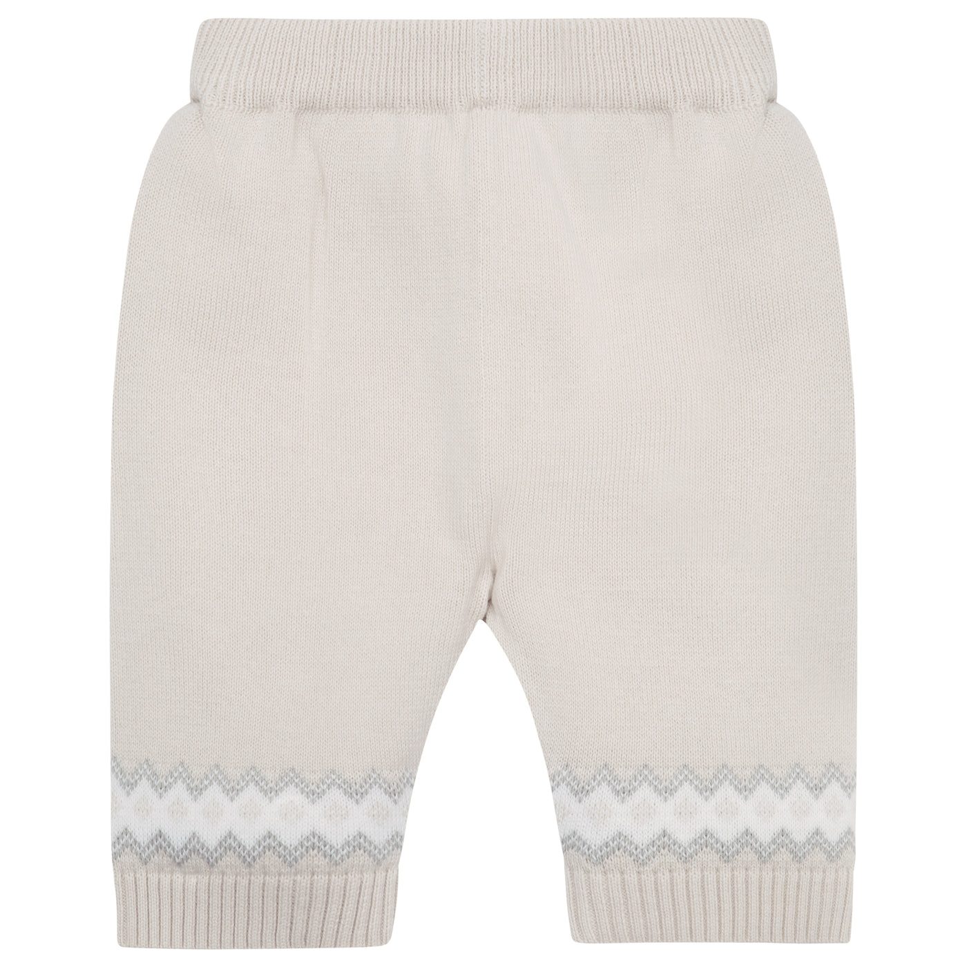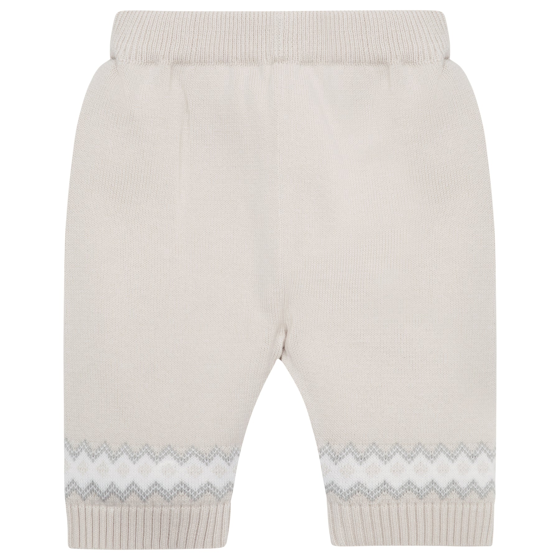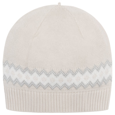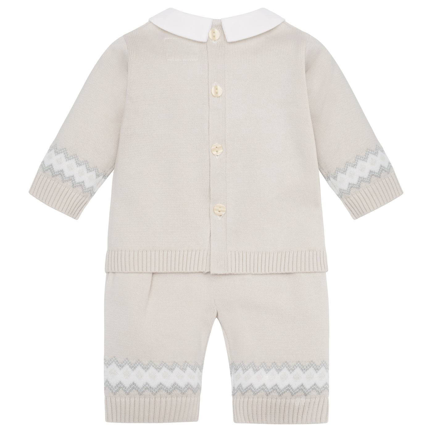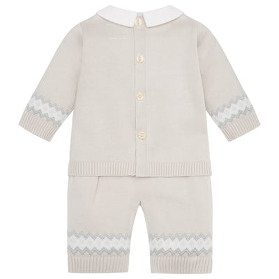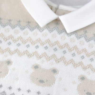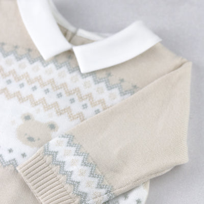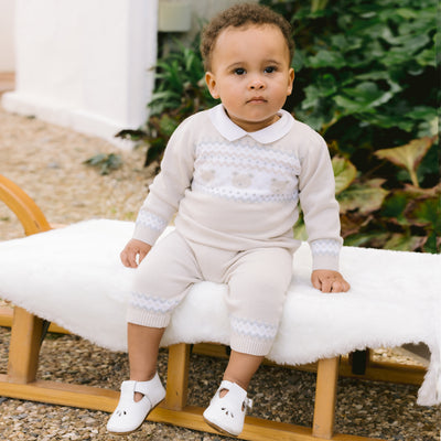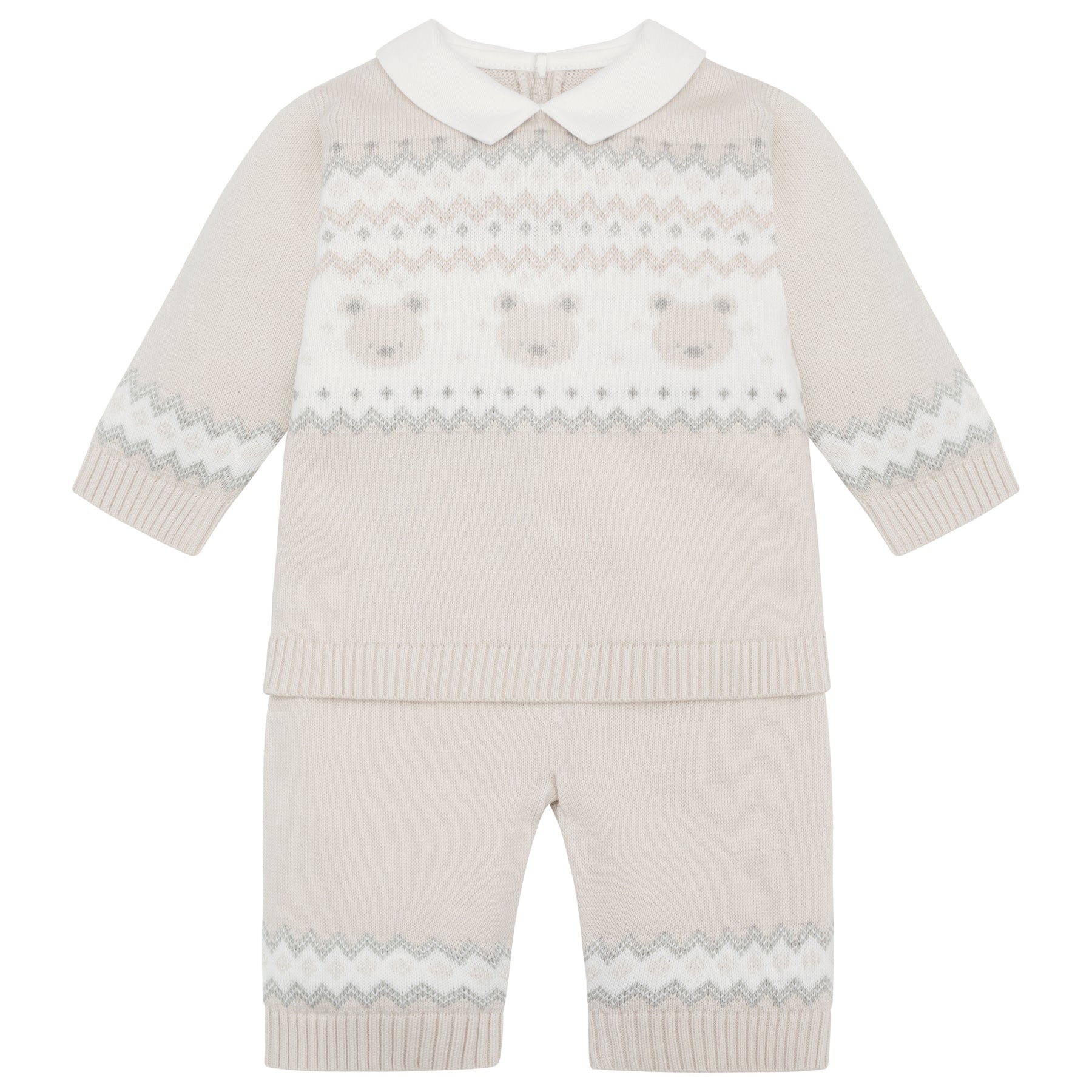 Similar to Kristian, Kipling is a cosy, beautifully knitted, two piece. The top comprises of the same striking white, caramel and grey fairisle design across the chest which frames a line of adorable teddy heads. This fairisle design is repeated on the wrists and ankles of the leggings and a lovely matching hat completes this set. Also available in pale blue.