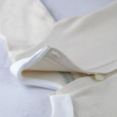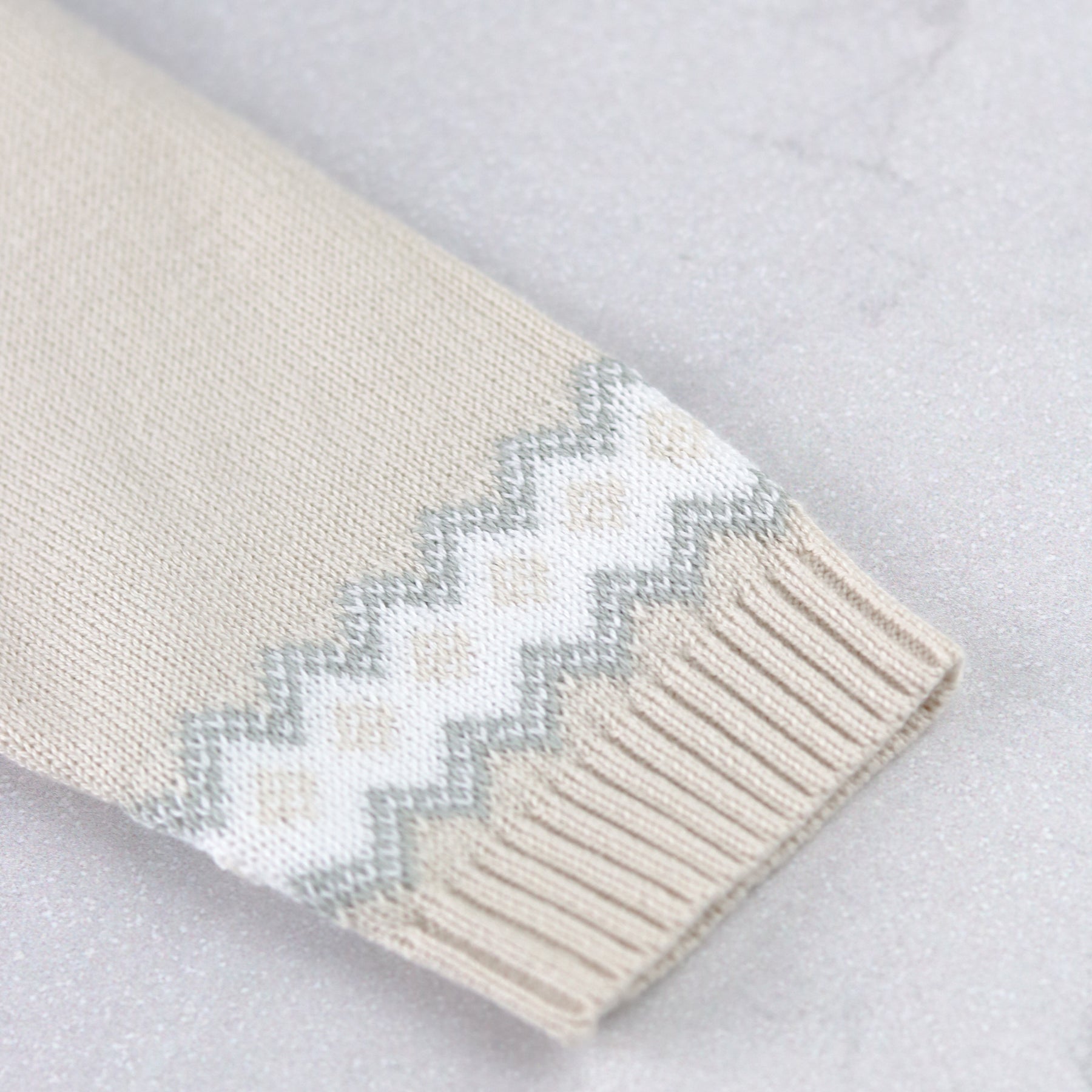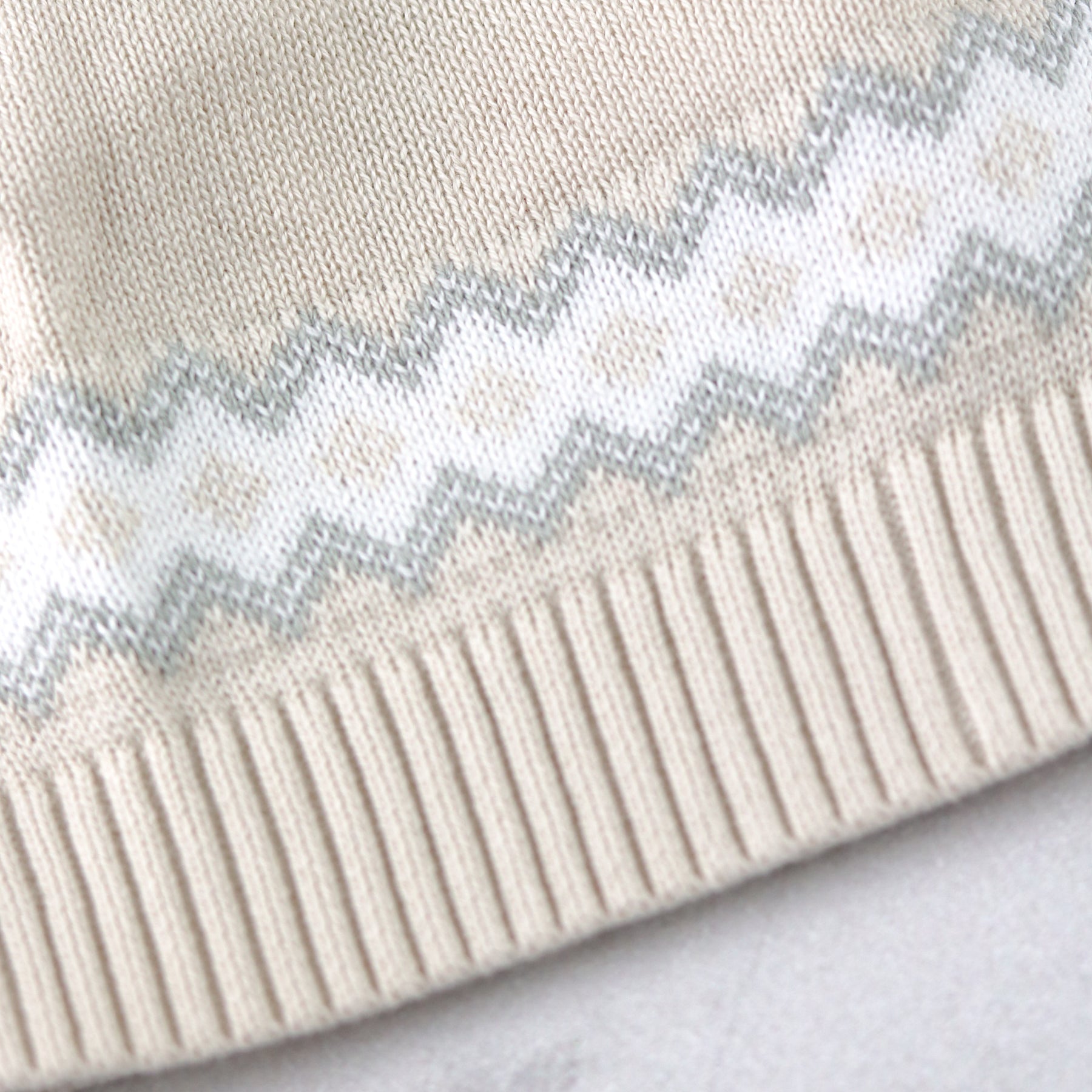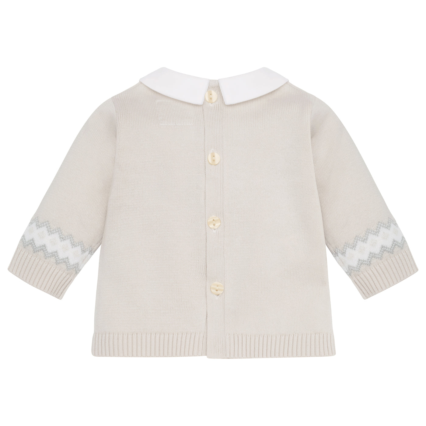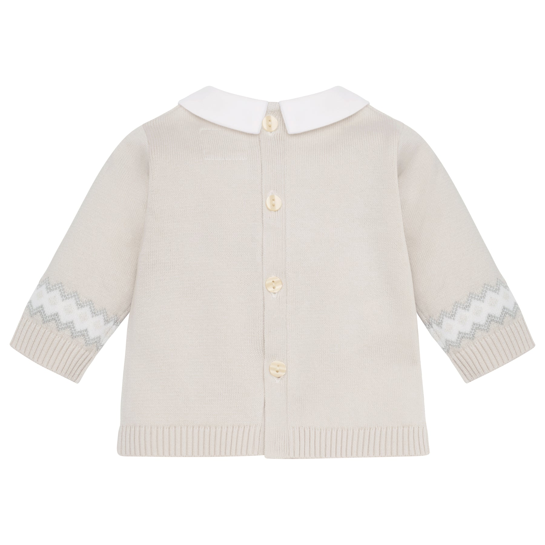 Similar to Kristian, Kipling is a cosy, beautifully knitted, two piece. The top comprises of the same striking white, caramel and grey fairisle design across the chest which frames a line of adorable teddy heads. This fairisle design is repeated on the wrists and ankles of the leggings and a lovely matching hat completes this set. Also available in pale blue.