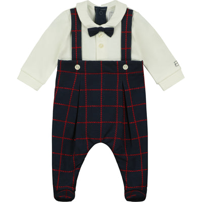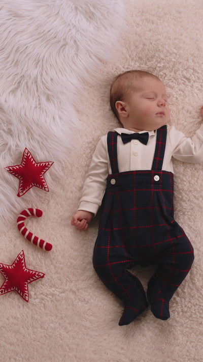When something a little smarter is required look no further than Elmo! In classic navy with striking red embroidered check, this garment gives the impression of a shirt and dungarees but is in fact a babygrow. Mock braces are fixed by a tiny button at the waistband, the top part is in the style of a buttoned shirt and the finishing touch of a little navy bow tie, will ensure that your little gentleman looks the part at any special occasion.