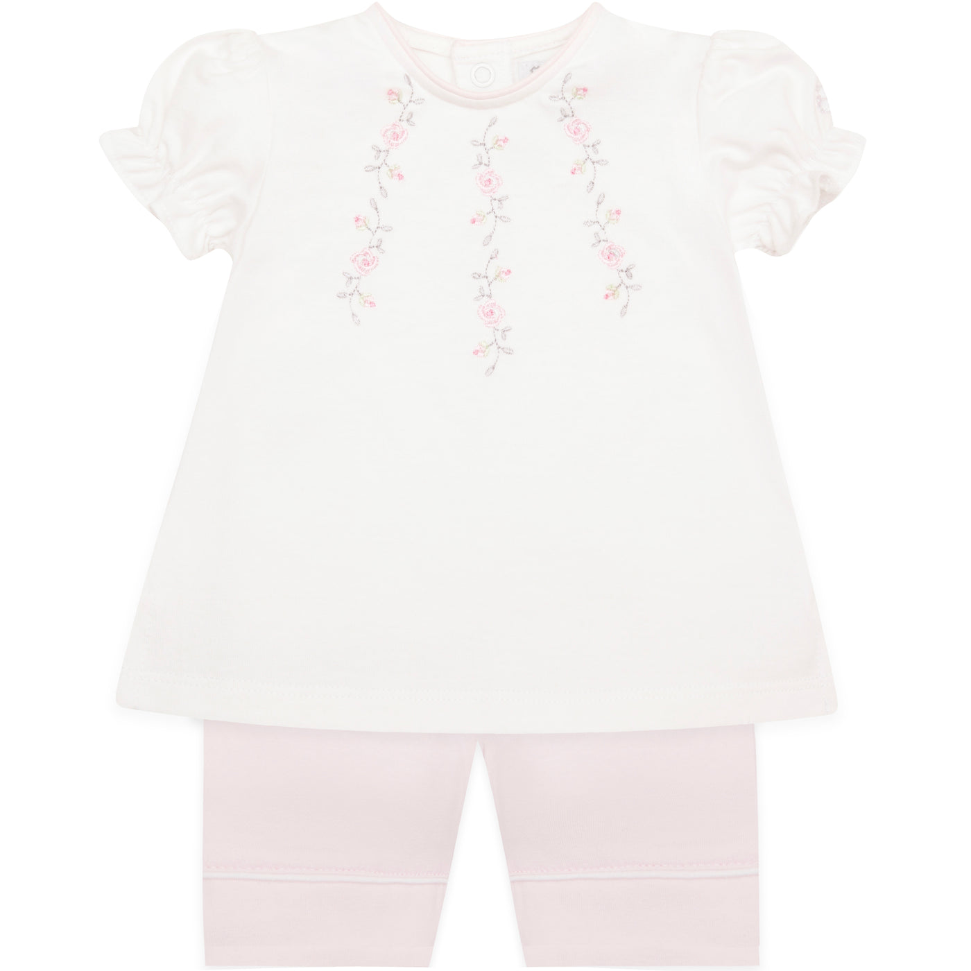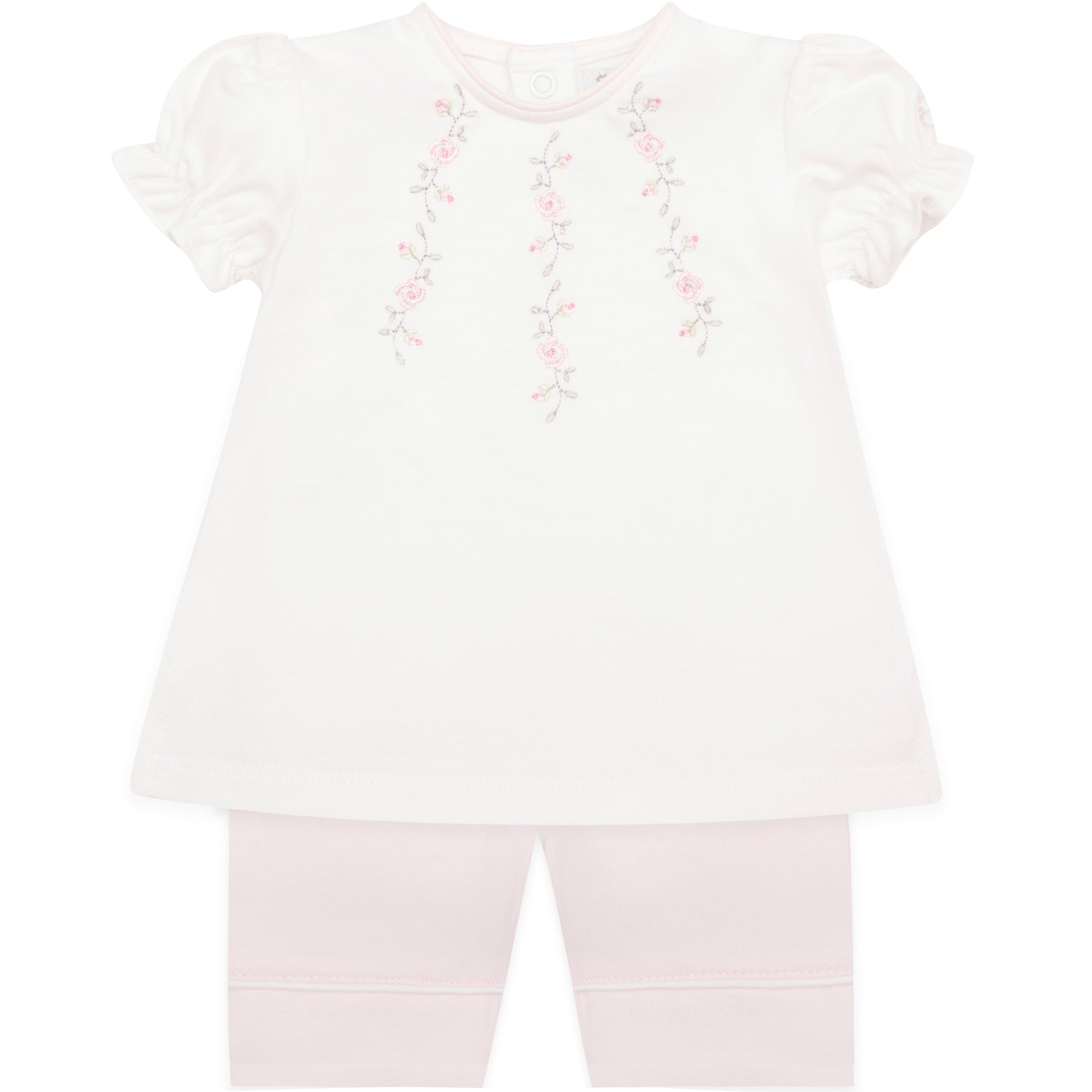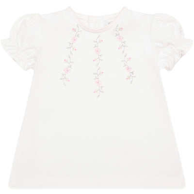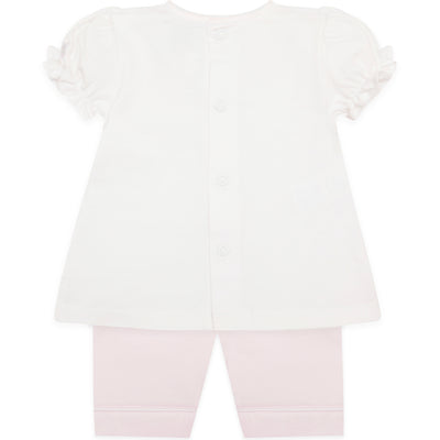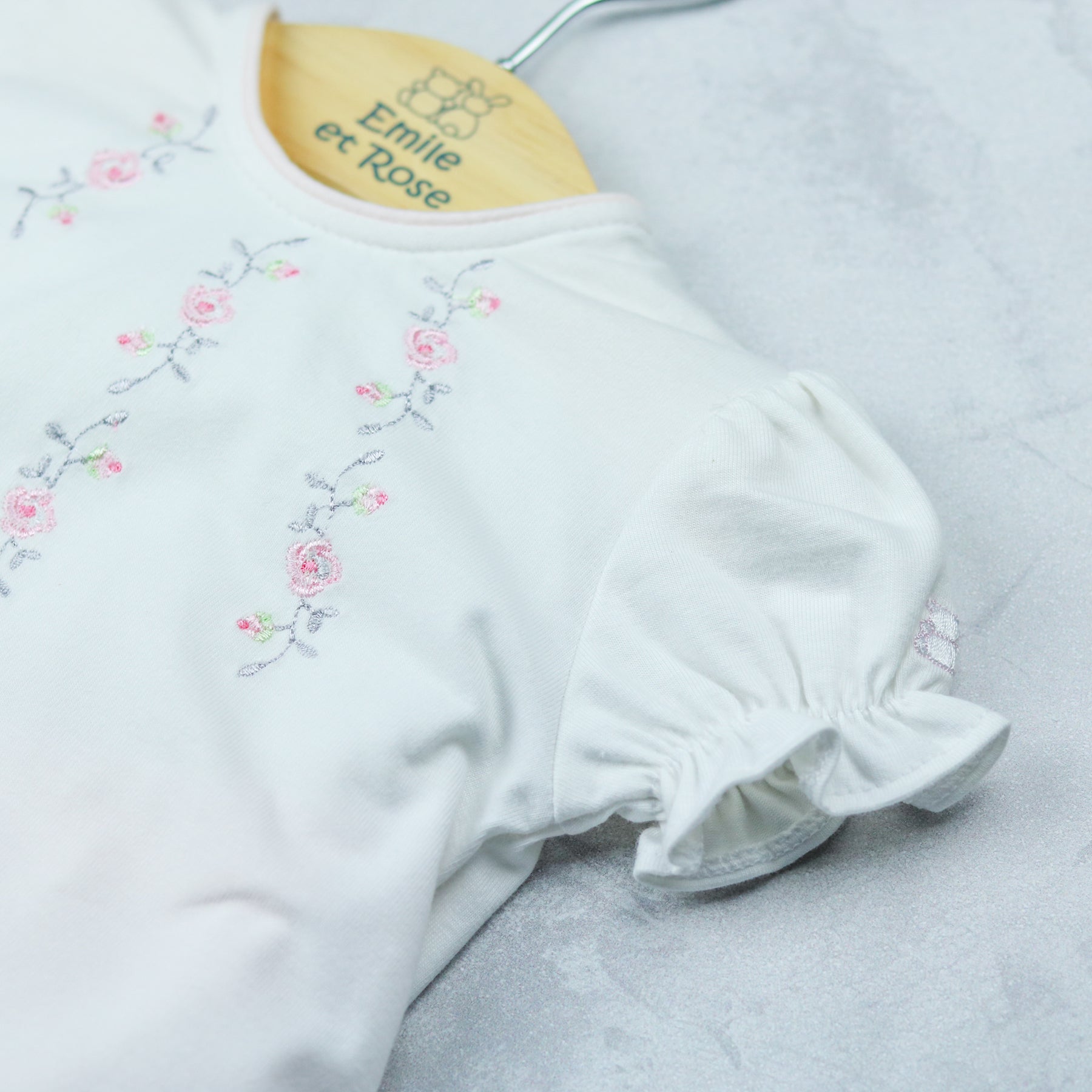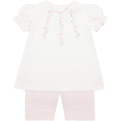 This delightful two piece top and shorts set is available in our signature pink or our new stone colourway. The white top has three simple but gorgeous cascading pink floral embroideries trailing from the neck. Ensuring a comfy fit this garment is slightly fuller in style with puffed gathered sleeves and slide. Coordinating pink shorts with white piping complete the set, great for a summer picnic.