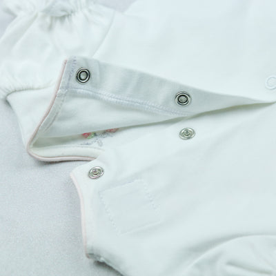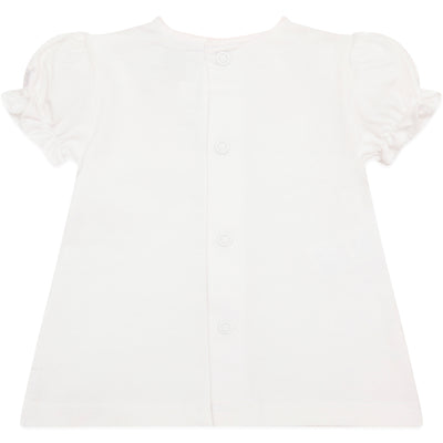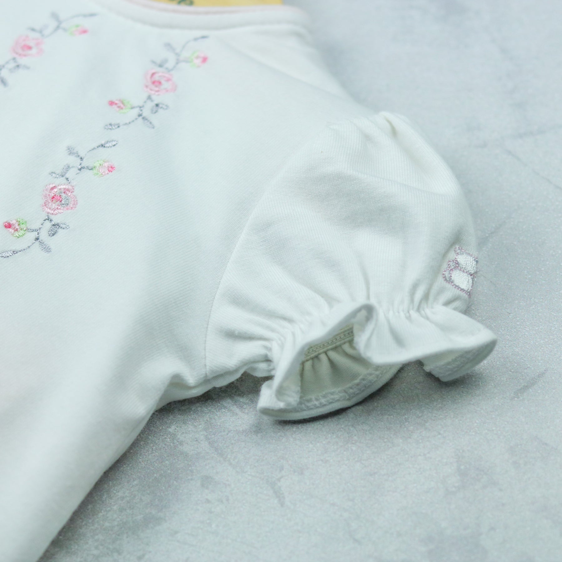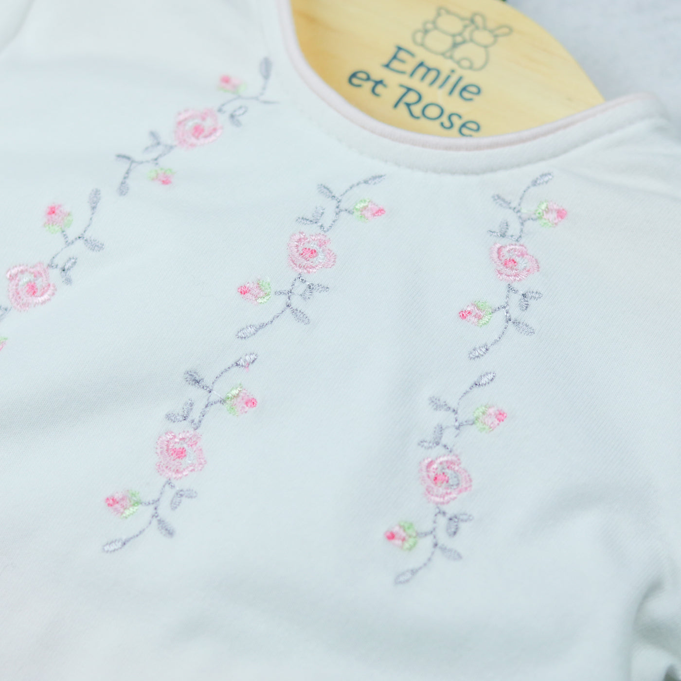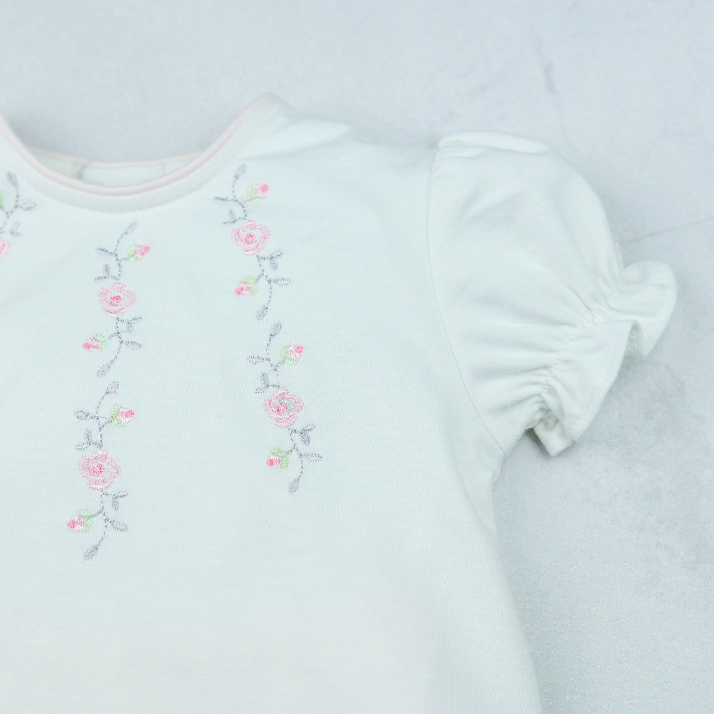 This delightful two piece top and shorts set is available in our signature pink or our new stone colourway. The white top has three simple but gorgeous cascading pink floral embroideries trailing from the neck. Ensuring a comfy fit this garment is slightly fuller in style with puffed gathered sleeves and slide. Coordinating pink shorts with white piping complete the set, great for a summer picnic.