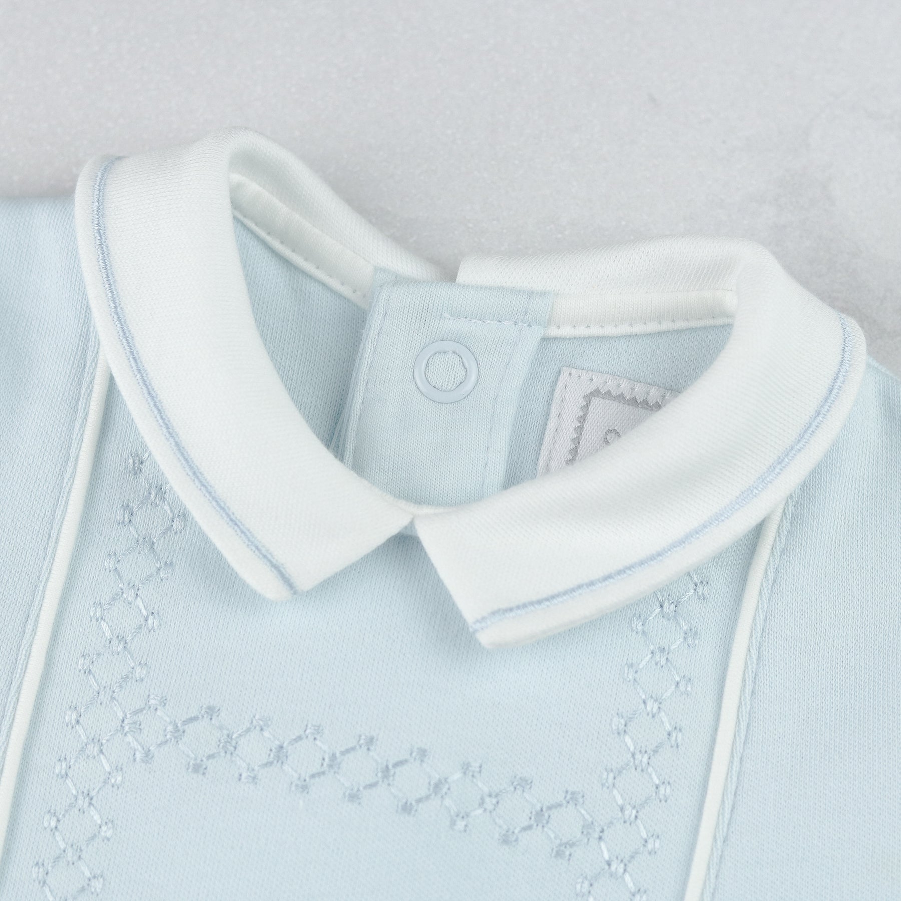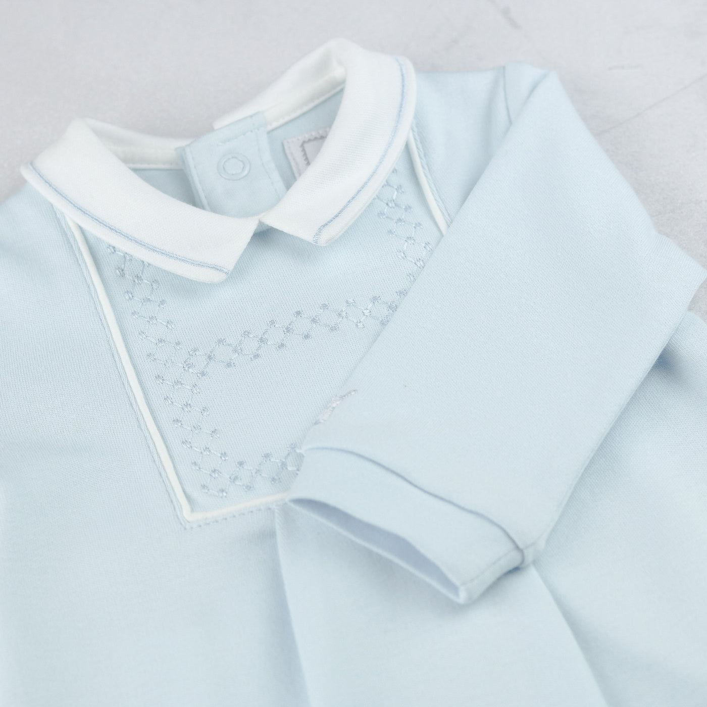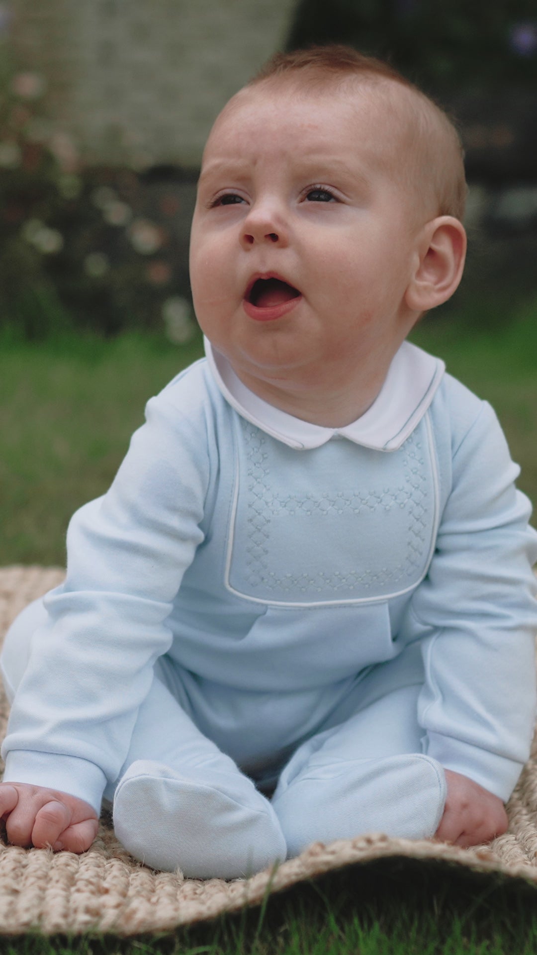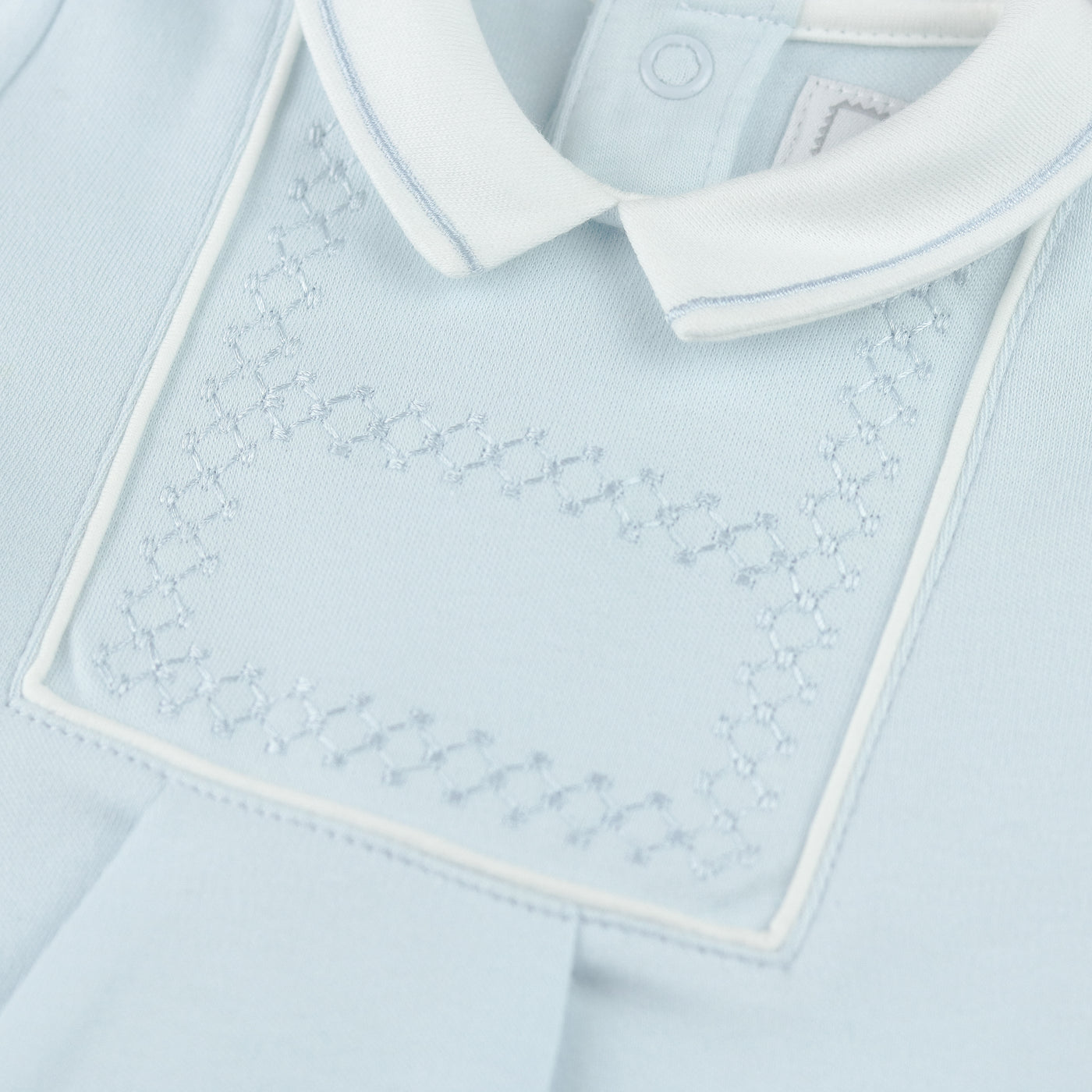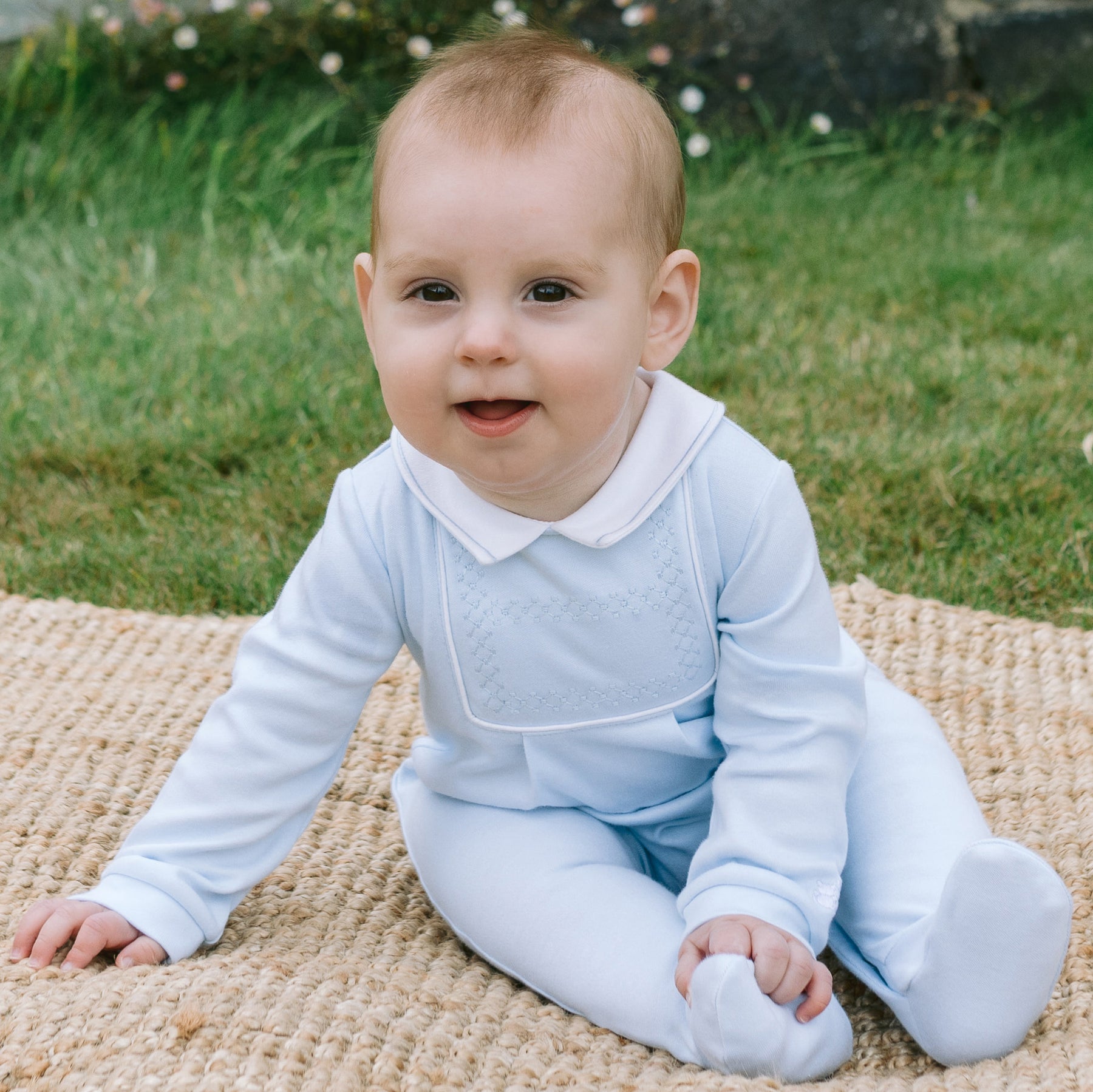 This is a lovely baby boys’ outfit that represents traditional baby clothes at their best. A beautifully embroidered yoke with a chain link design, takes centre stage and is framed by a little collar with white piping. The pleats give this a relaxed fit making it very comfy for baby.