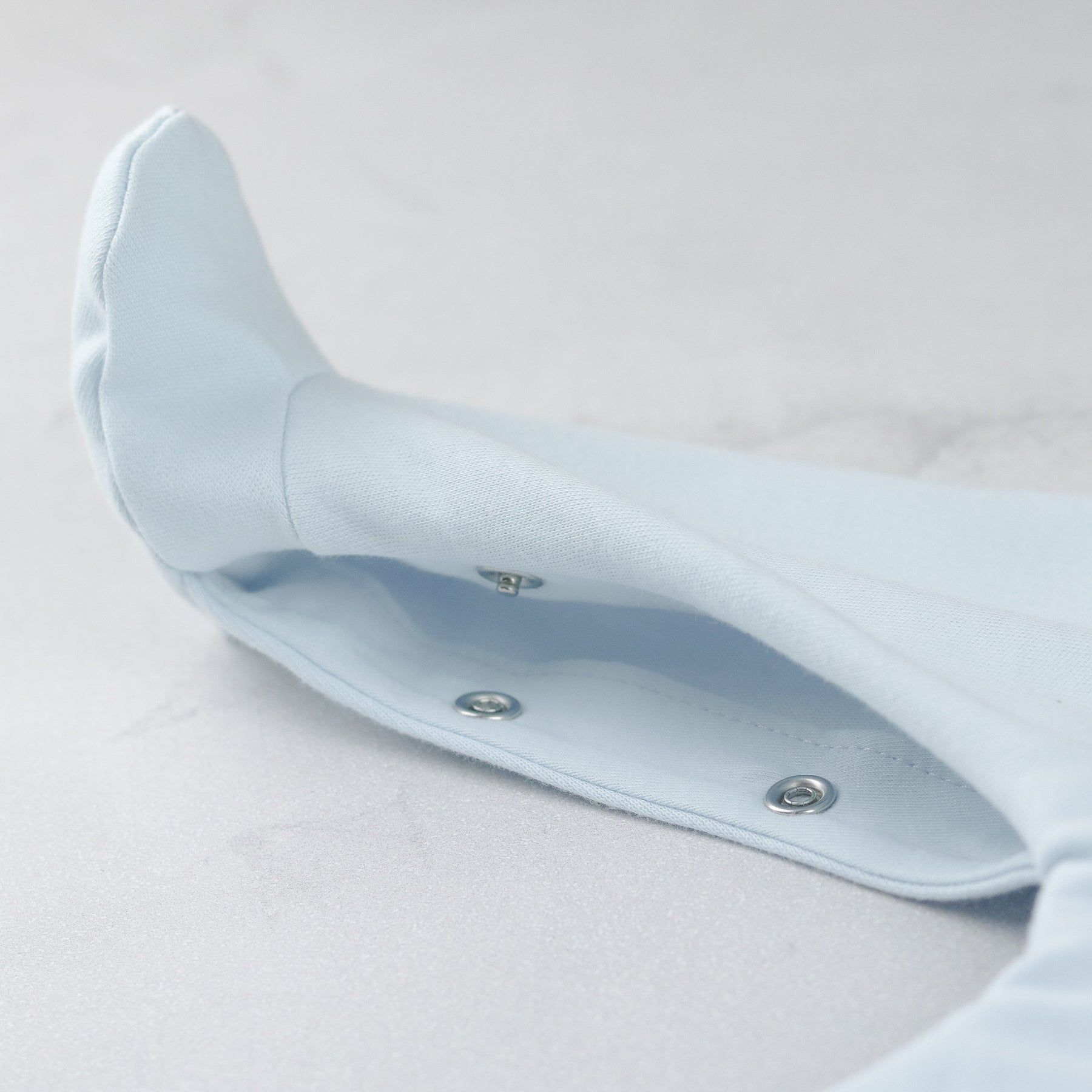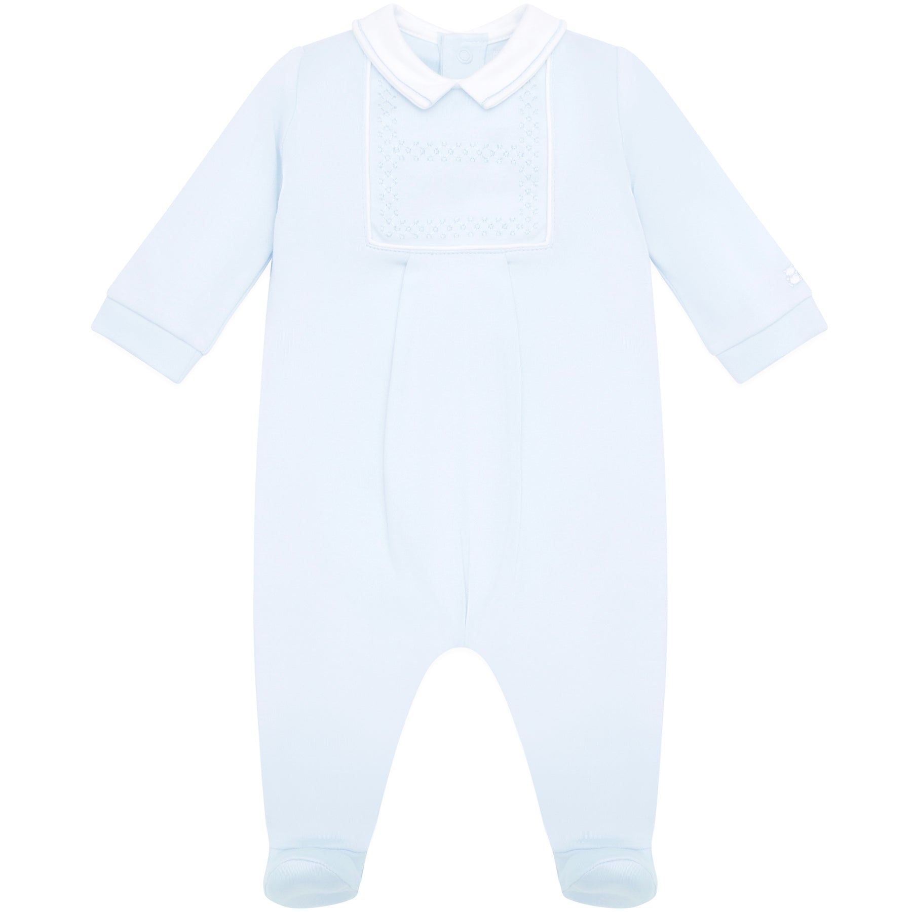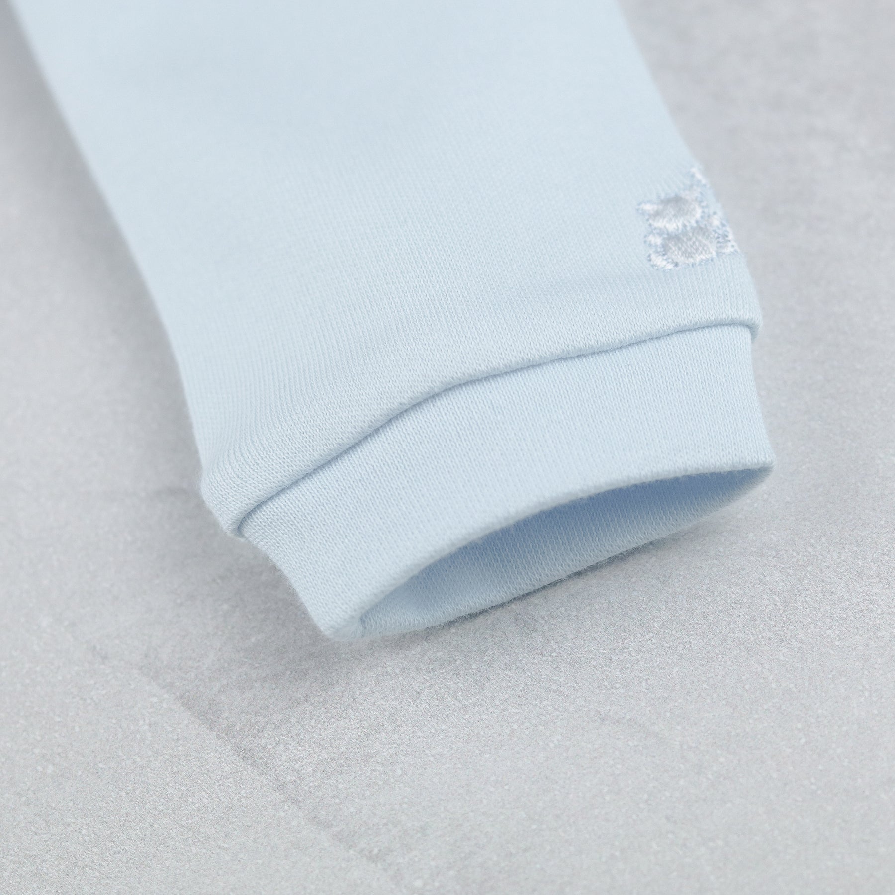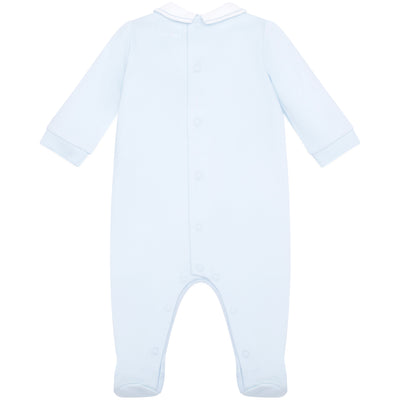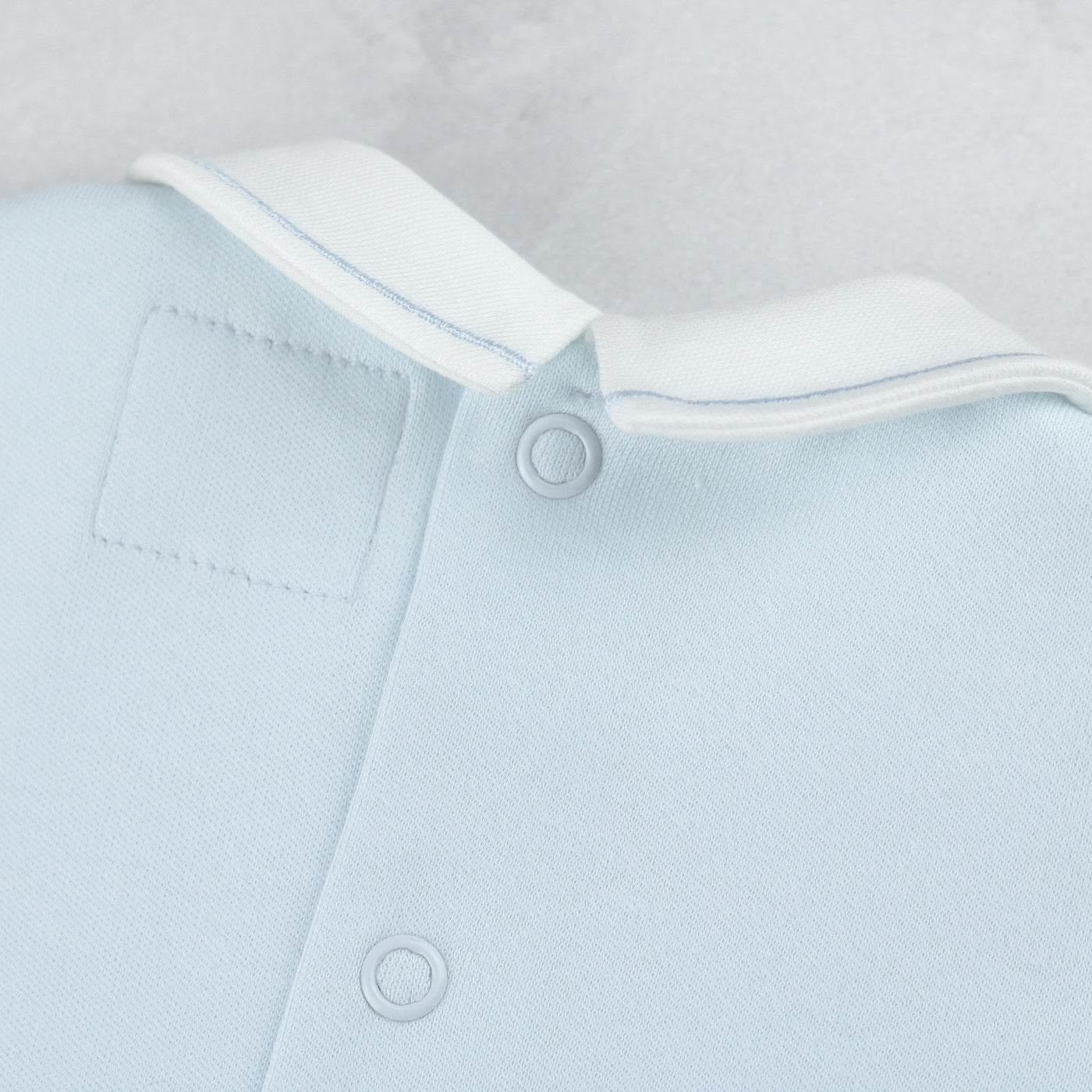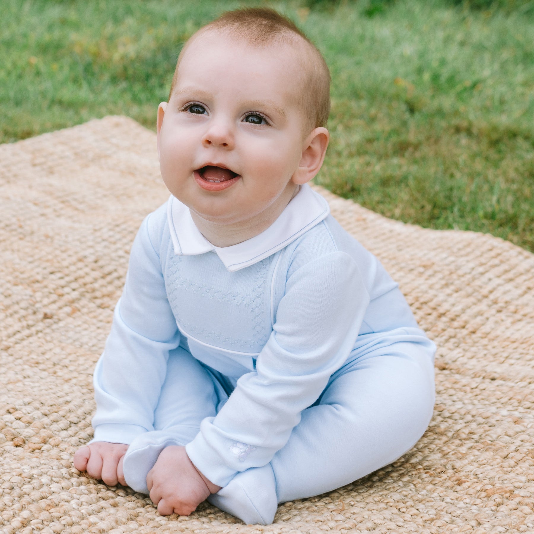 This is a lovely baby boys’ outfit that represents traditional baby clothes at their best. A beautifully embroidered yoke with a chain link design, takes centre stage and is framed by a little collar with white piping. The pleats give this a relaxed fit making it very comfy for baby.