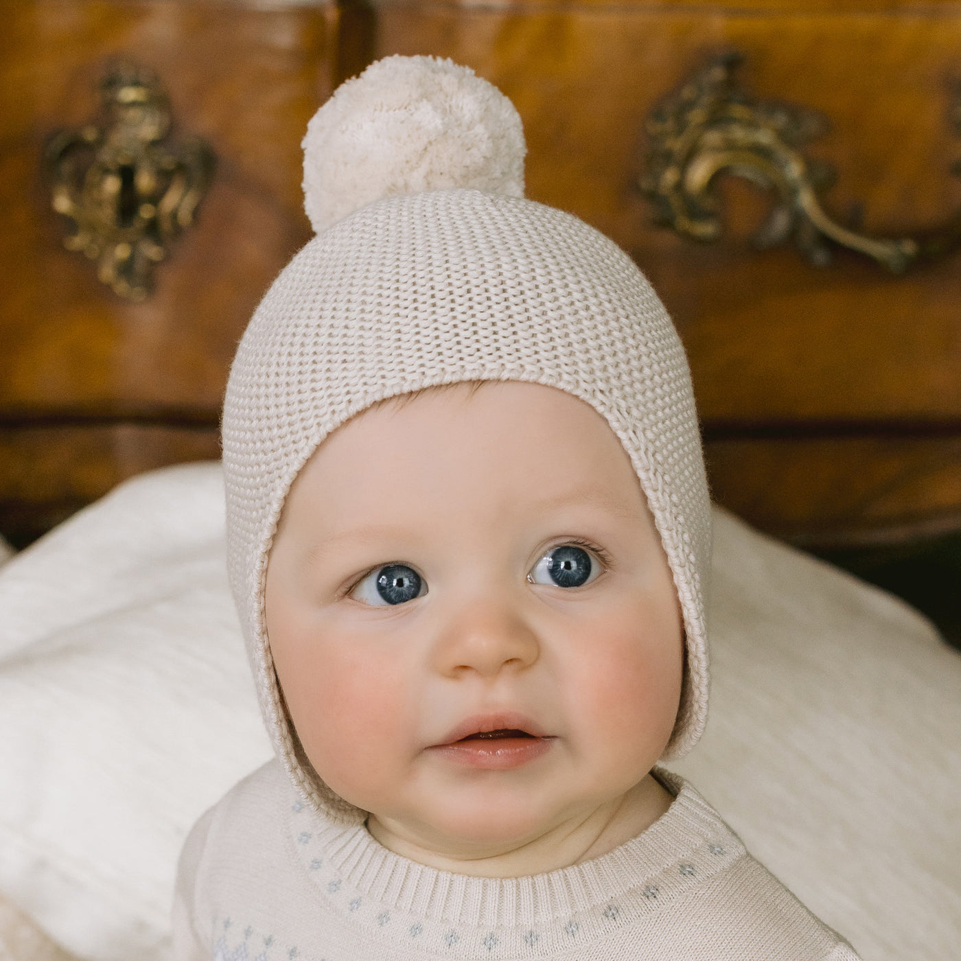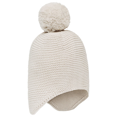 A simply gorgeous stone knitted helmet-shaped hat with ear flaps and pompom on the top! Will match any of our stone garments and is perfect for keeping those ears warm on a windy day!