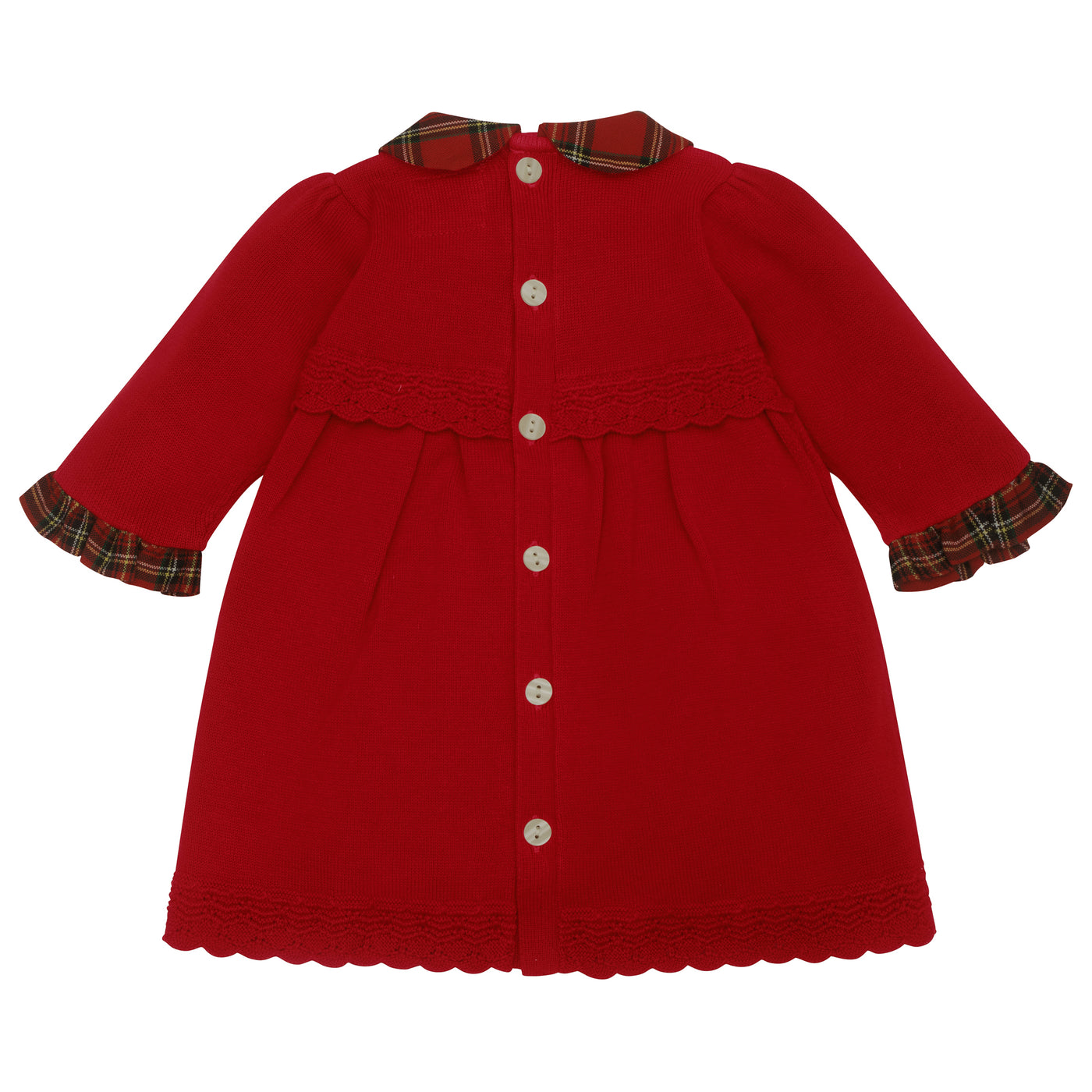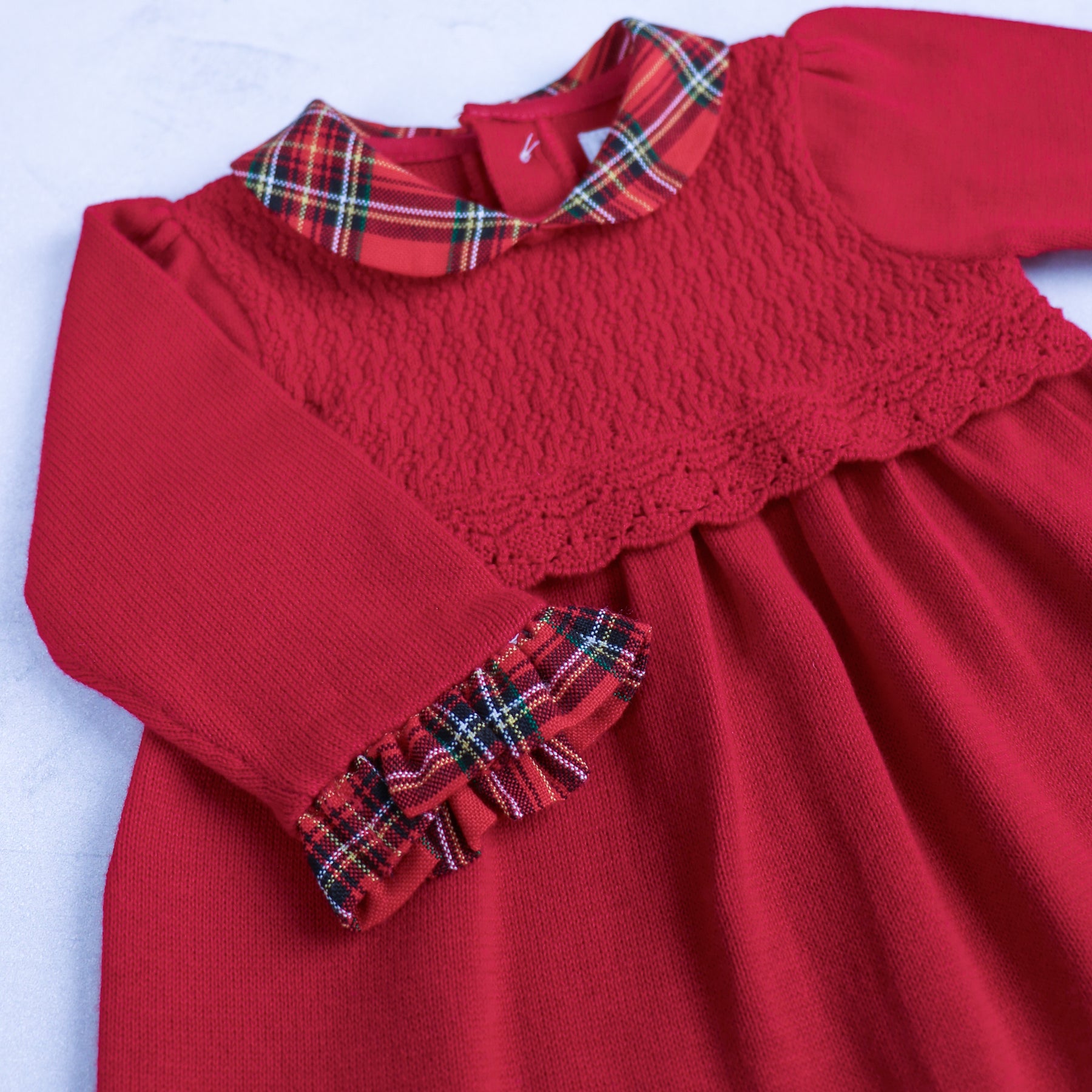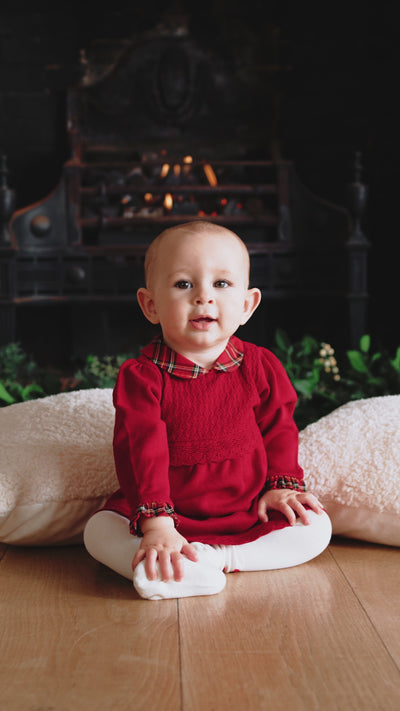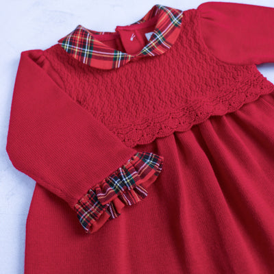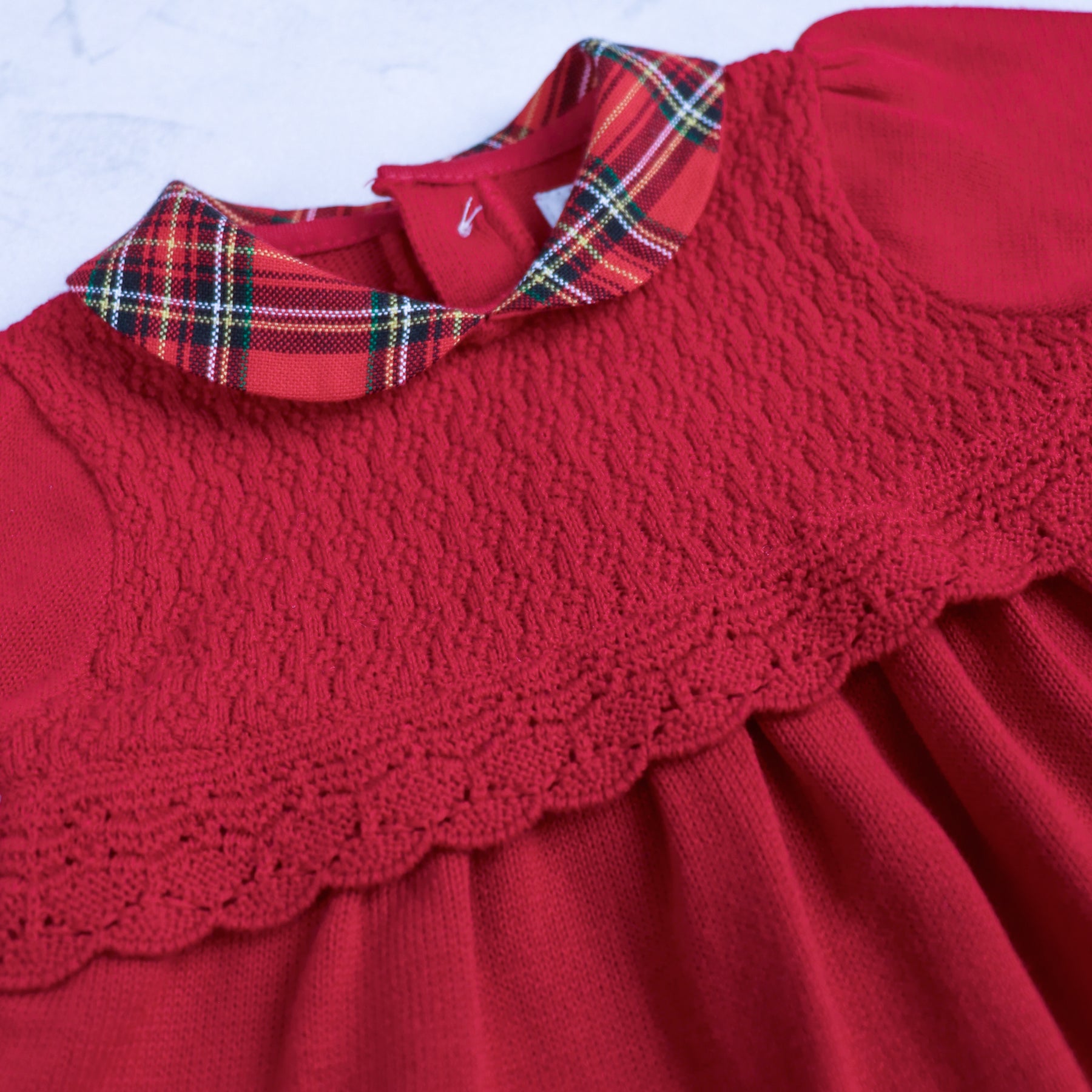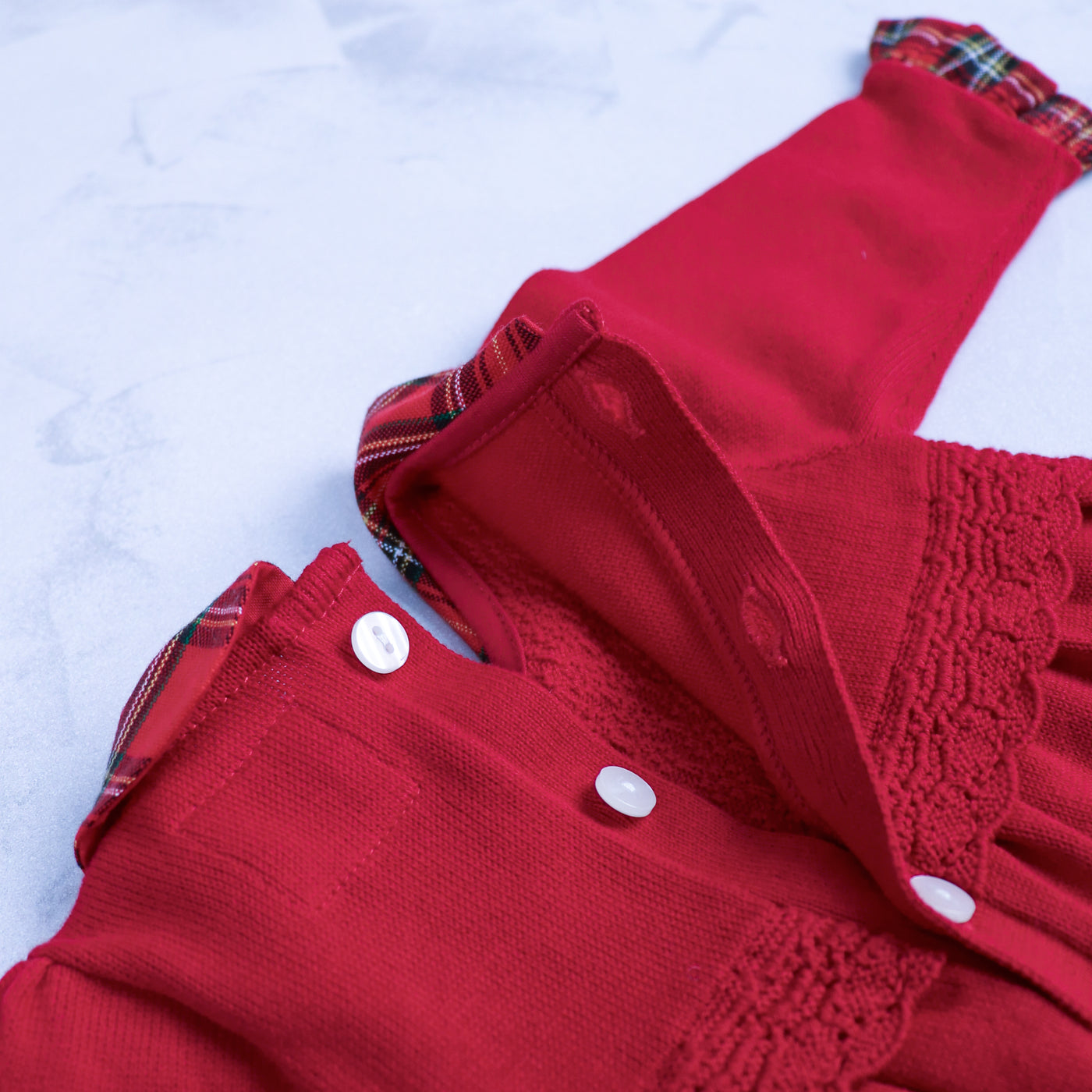 Continuing our lace and scallop edge knitwear theme, our Keisha Dress is another option but this time in striking red. The yoke has intricate stitching in a flower design and is edged with the lace, scallop knit, as is the hem of the skirt. The rounded collar and sleeve frills are in festive tartan which combines beautifully with the ornate knit. Pearlised buttons on the back of the dress and white tights with sweet little red satin bows, add lovely finishing touches to this beautiful outfit.
