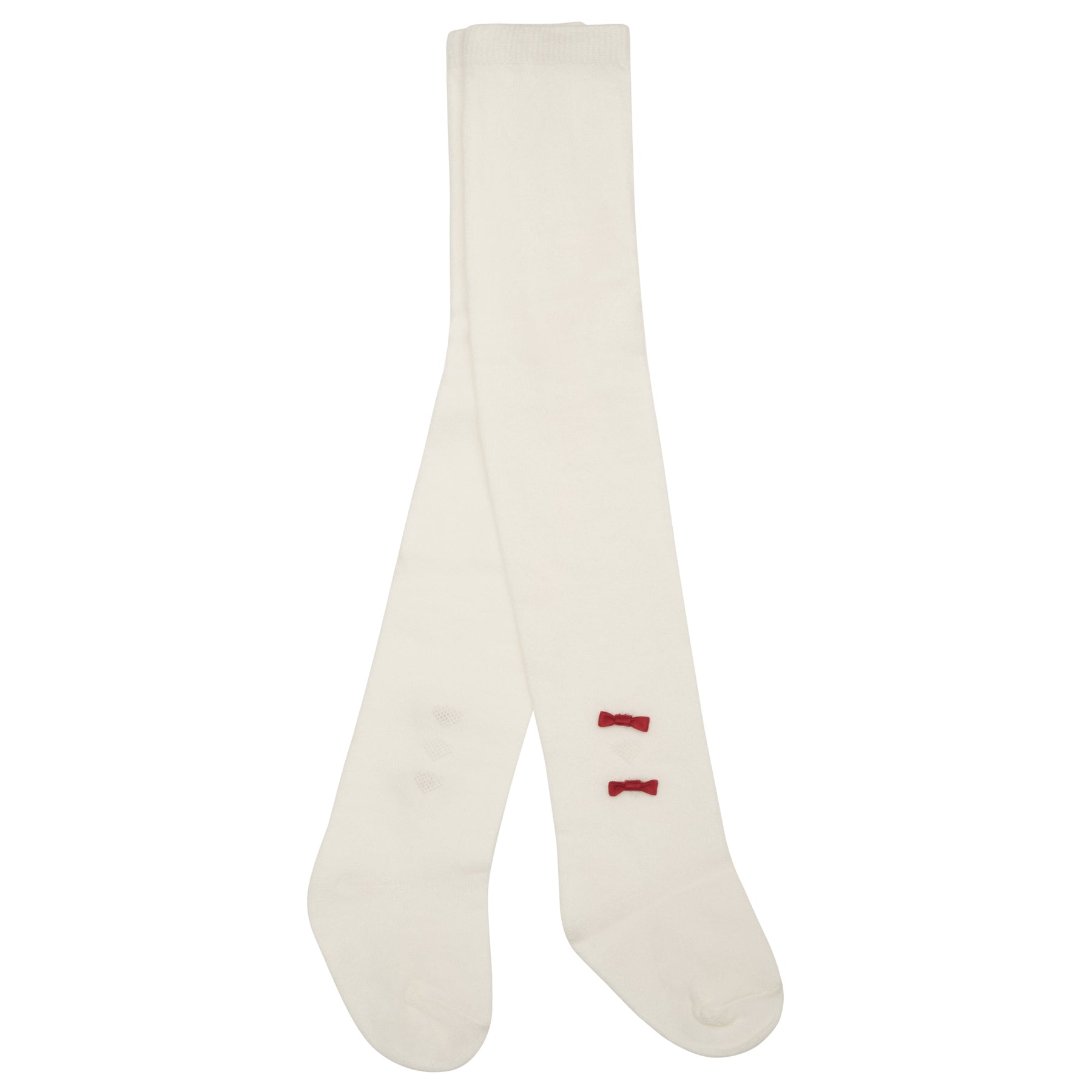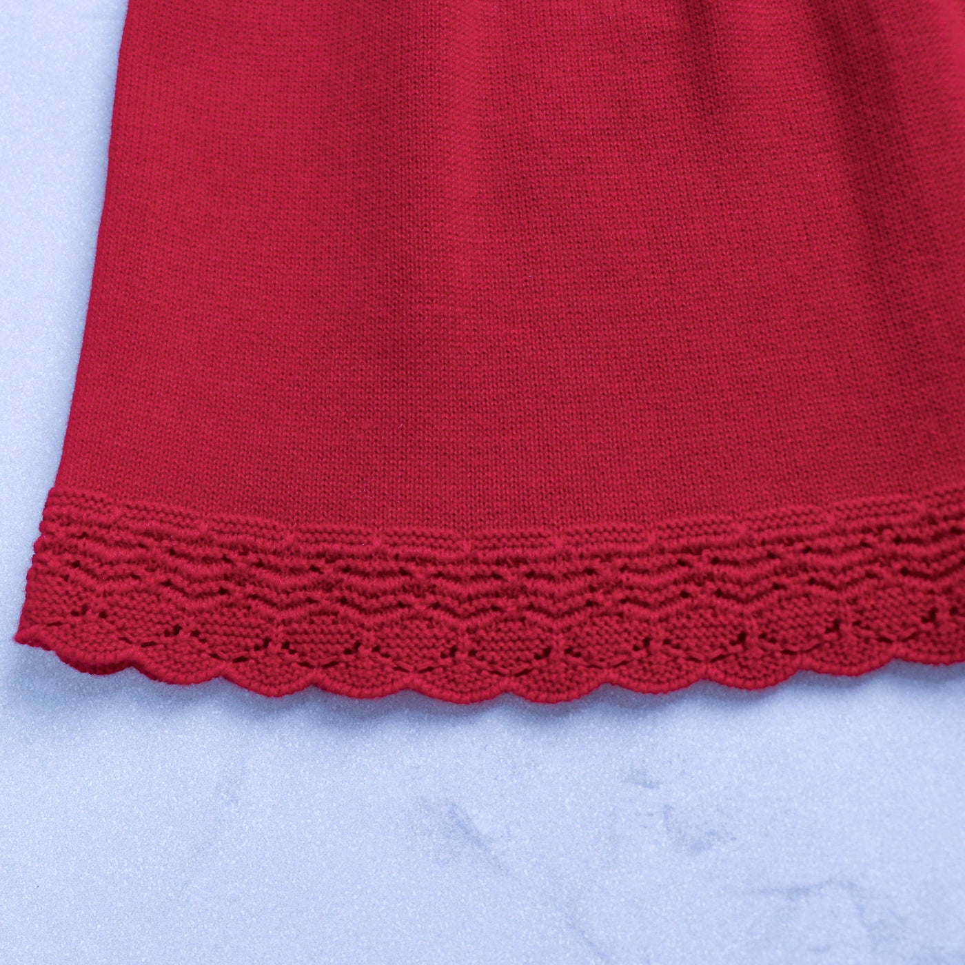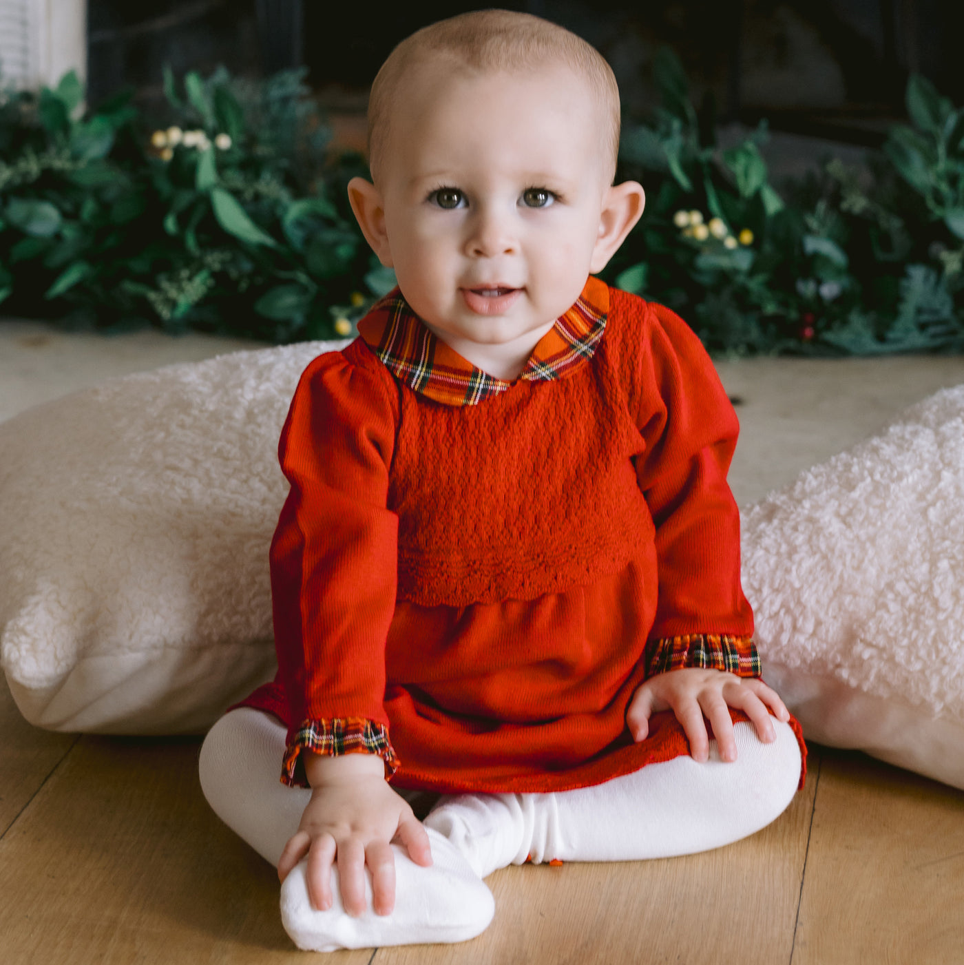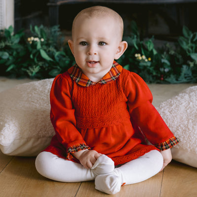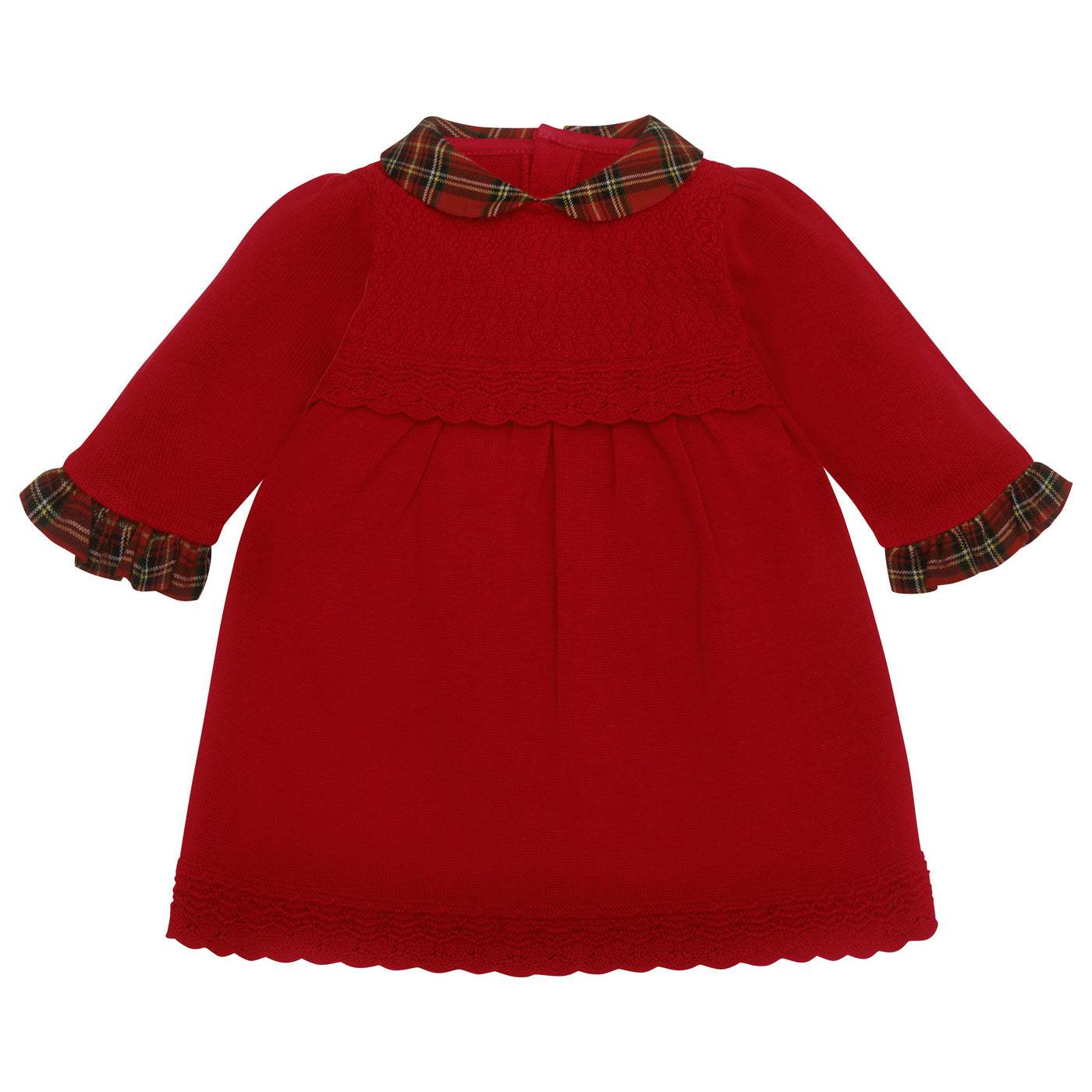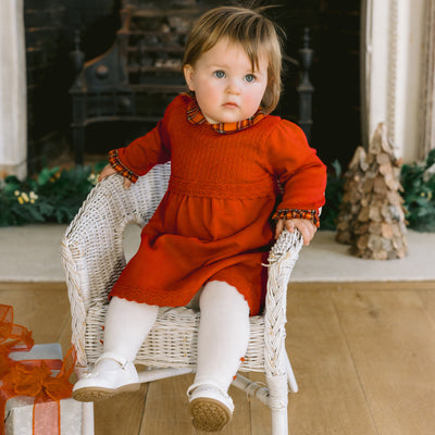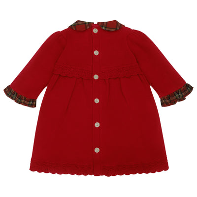 Continuing our lace and scallop edge knitwear theme, our Keisha Dress is another option but this time in striking red. The yoke has intricate stitching in a flower design and is edged with the lace, scallop knit, as is the hem of the skirt. The rounded collar and sleeve frills are in festive tartan which combines beautifully with the ornate knit. Pearlised buttons on the back of the dress and white tights with sweet little red satin bows, add lovely finishing touches to this beautiful outfit.