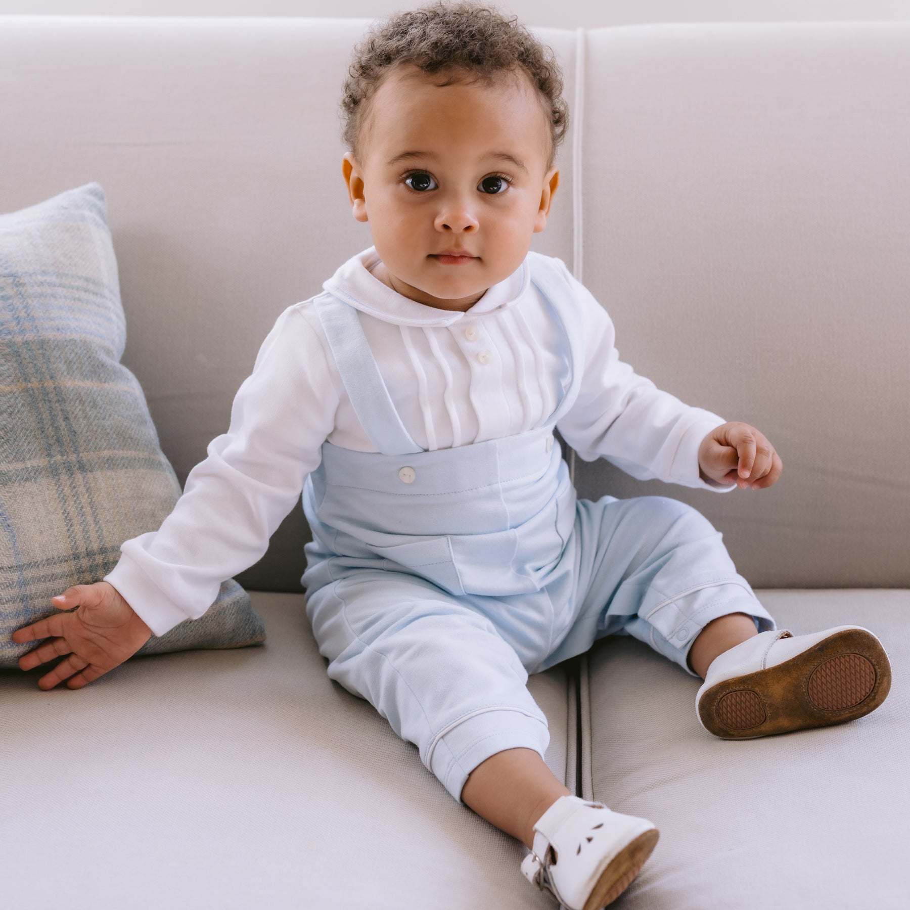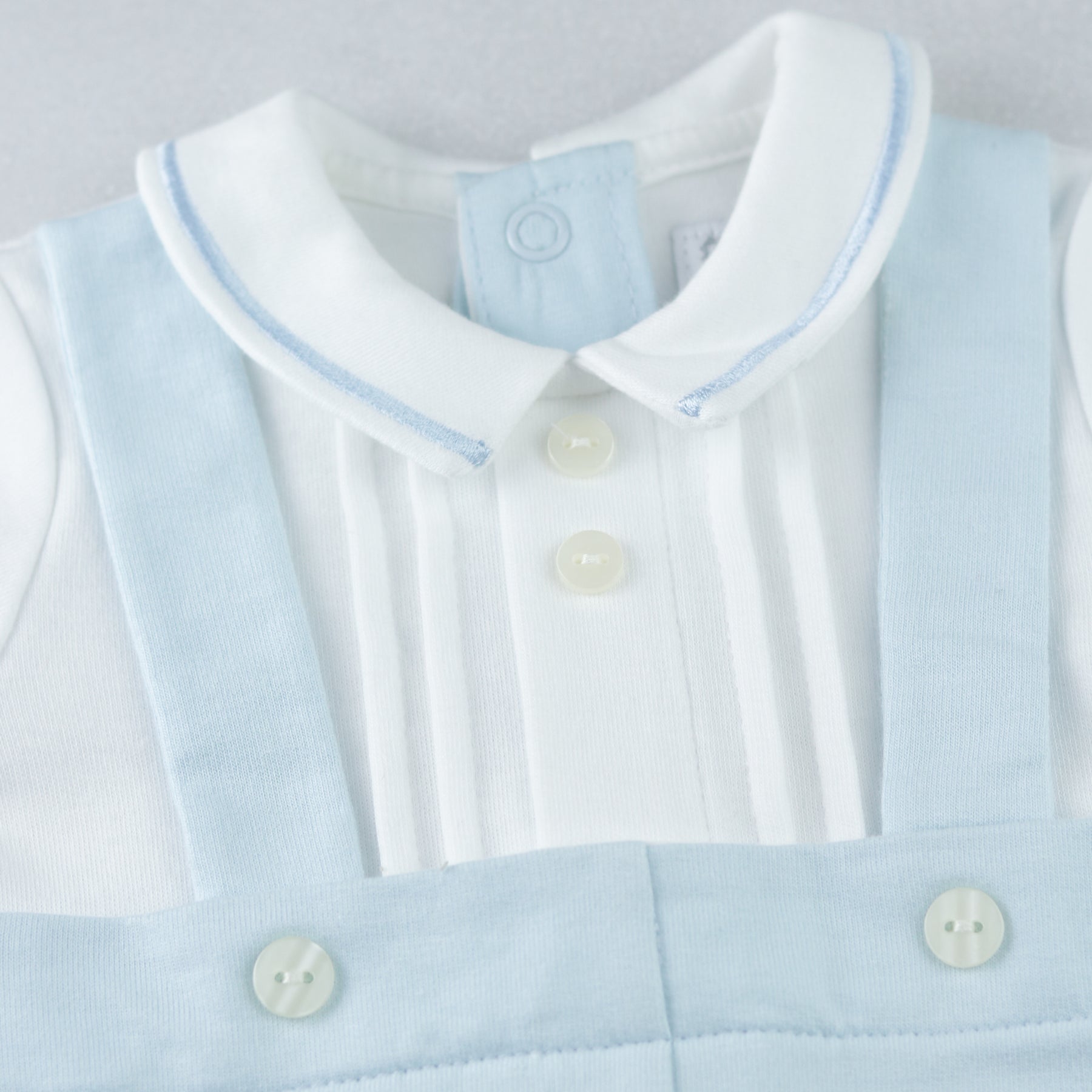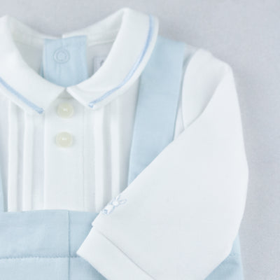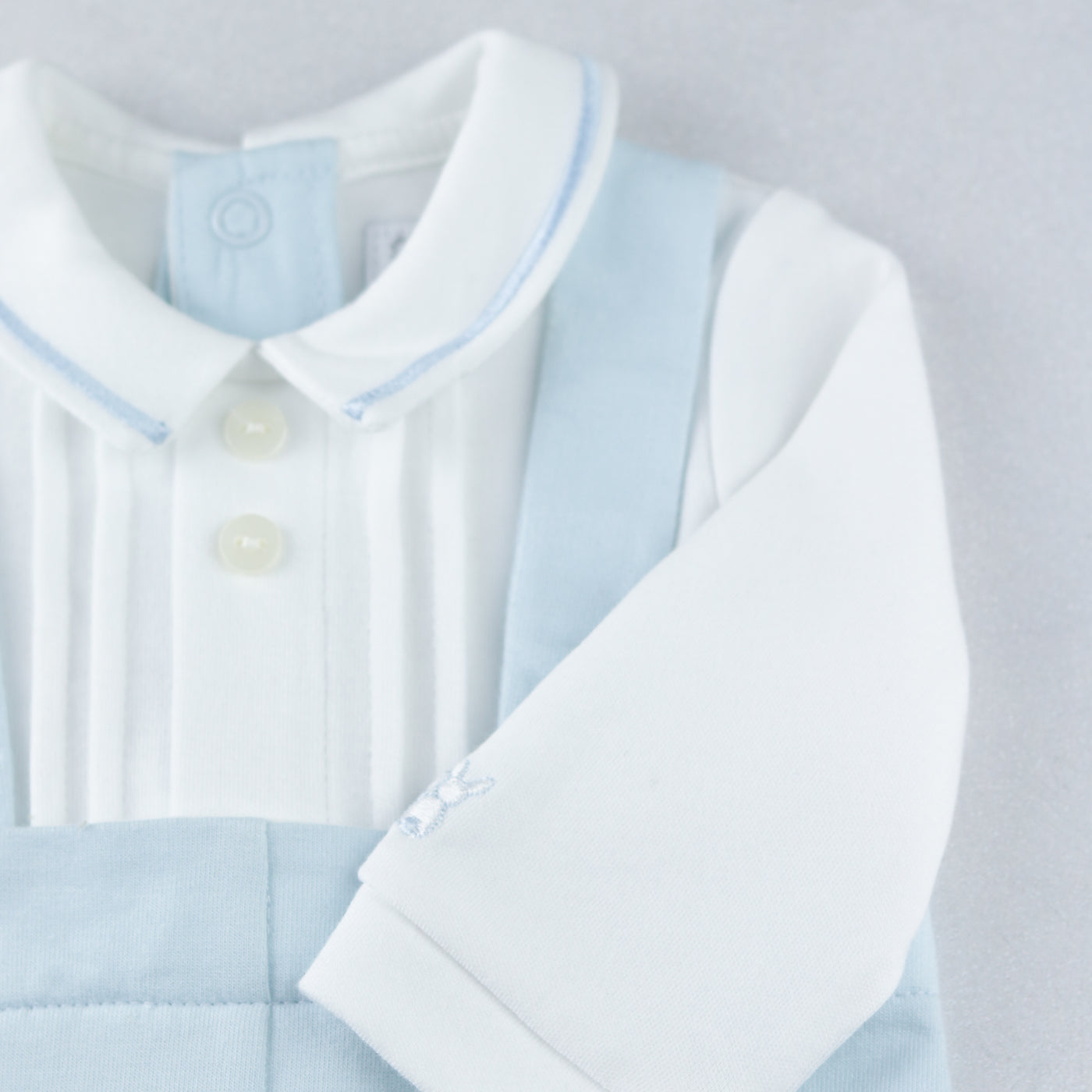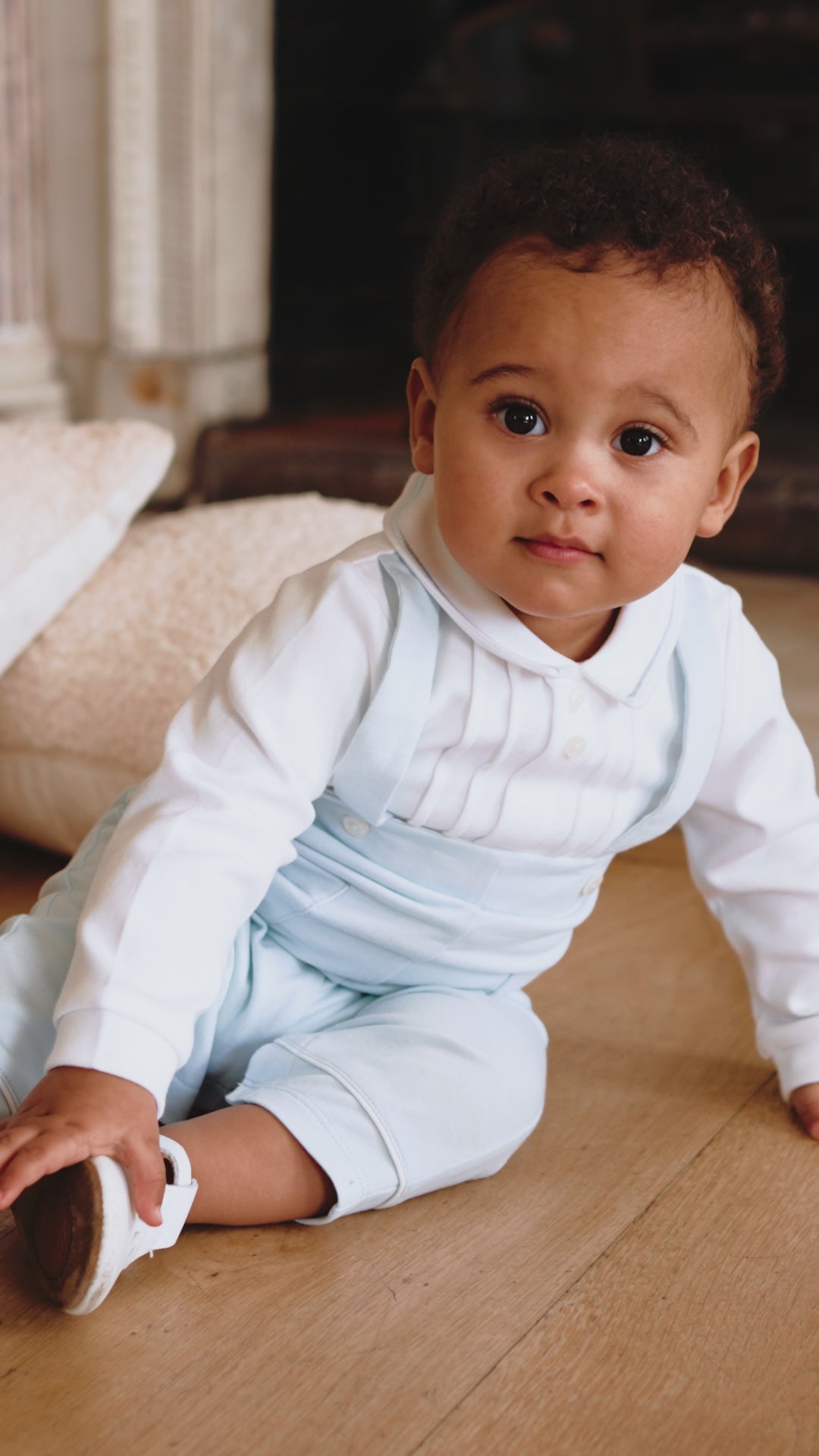 Kingsley is both classic and traditional and a great addition to any little boys wardrobe. This mock dungaree and shirt combinations looks like a two piece but is in fact a babygrow without feet. The waistband has mock braces fixed by a tiny button and two sweet little pockets. The top part of the garment is styled like a shirt with collar, buttons and pintuck pleats. Very smart!