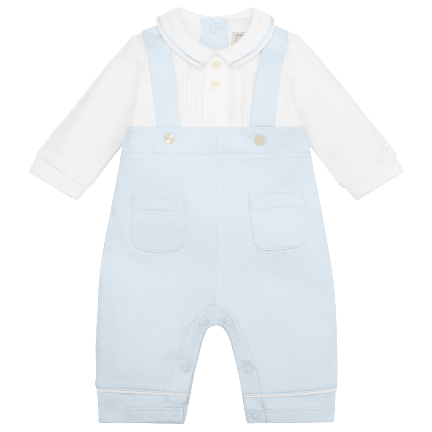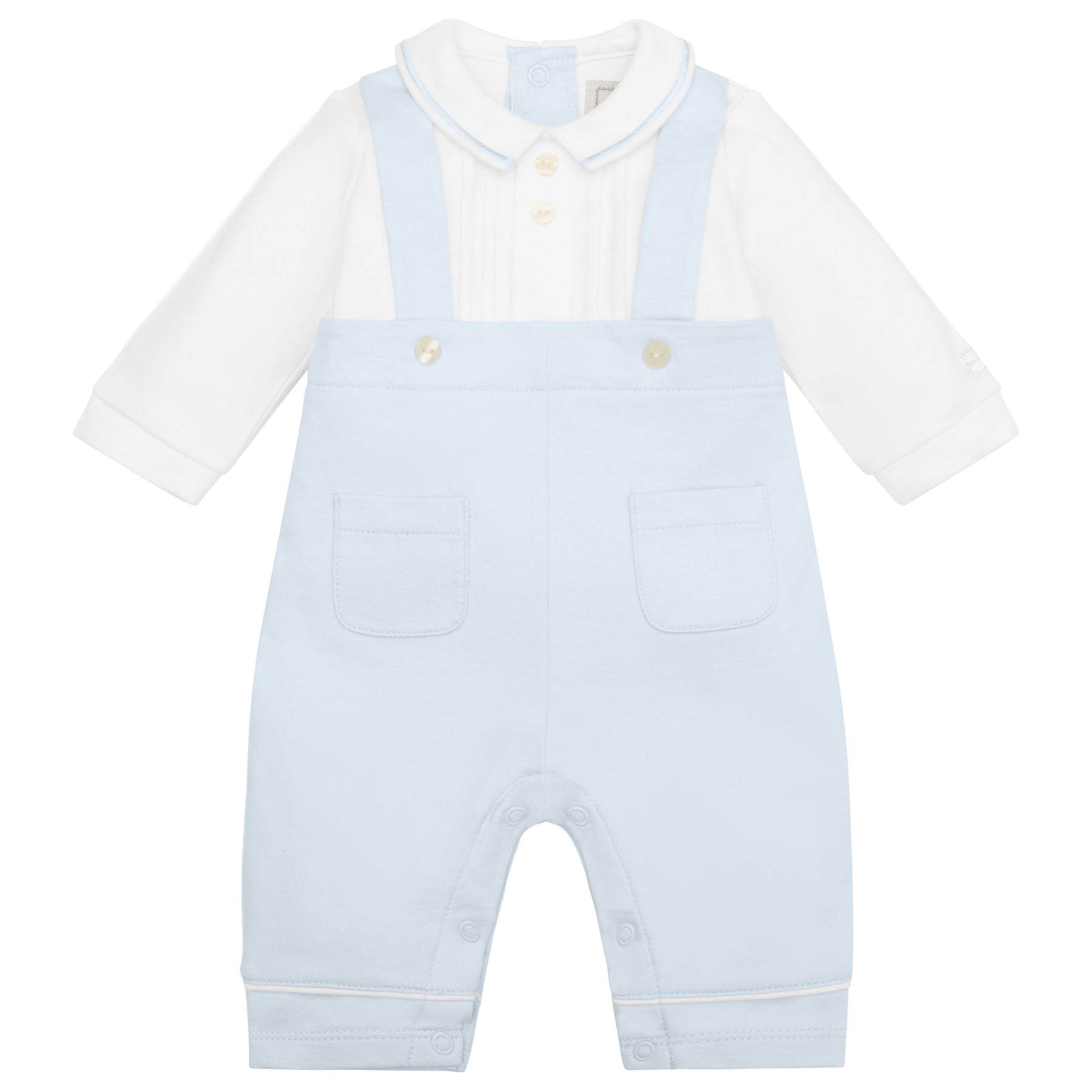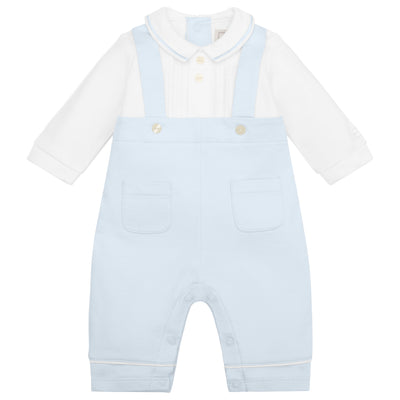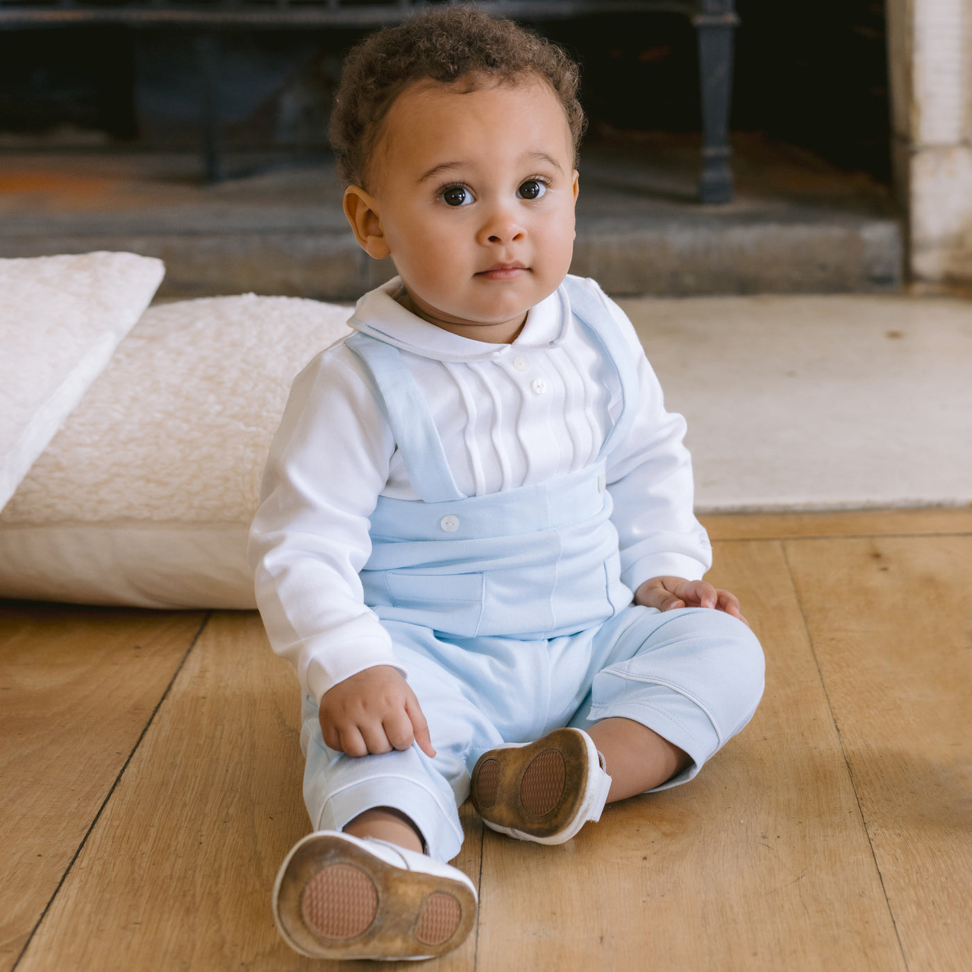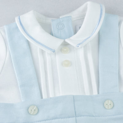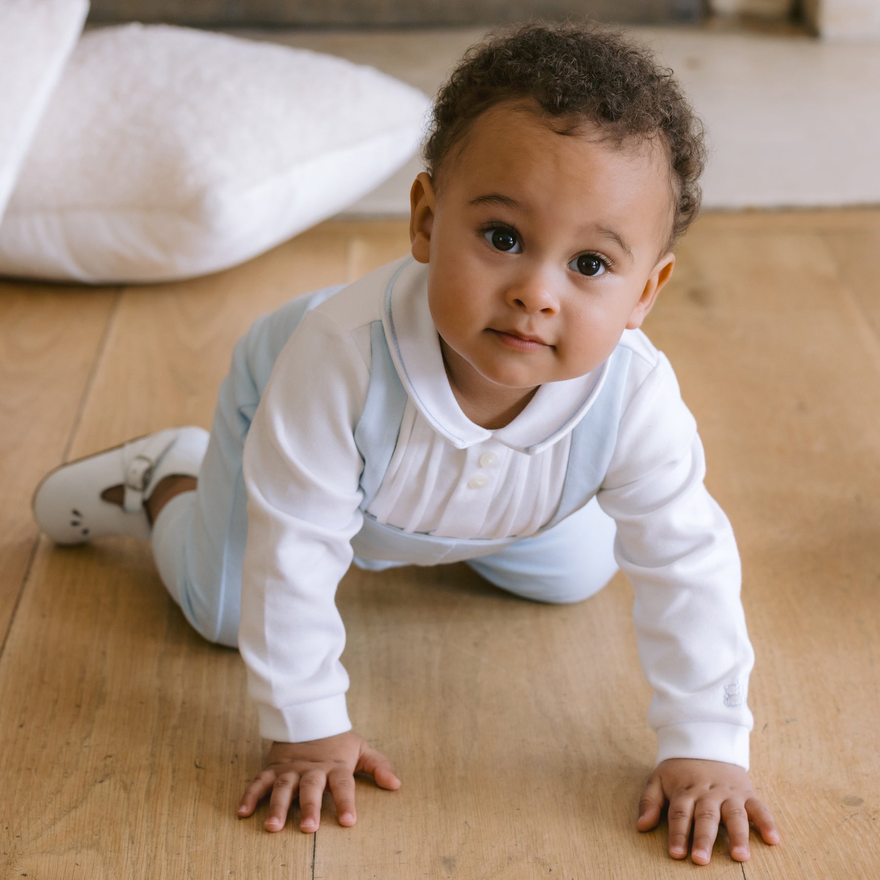 Kingsley is both classic and traditional and a great addition to any little boys wardrobe. This mock dungaree and shirt combinations looks like a two piece but is in fact a babygrow without feet. The waistband has mock braces fixed by a tiny button and two sweet little pockets. The top part of the garment is styled like a shirt with collar, buttons and pintuck pleats. Very smart!