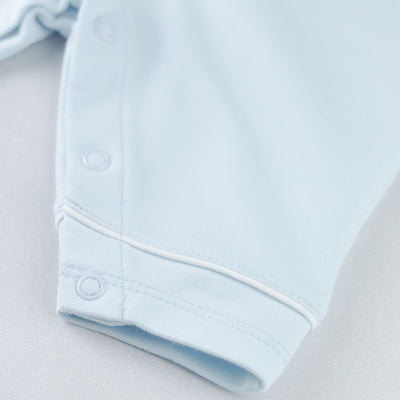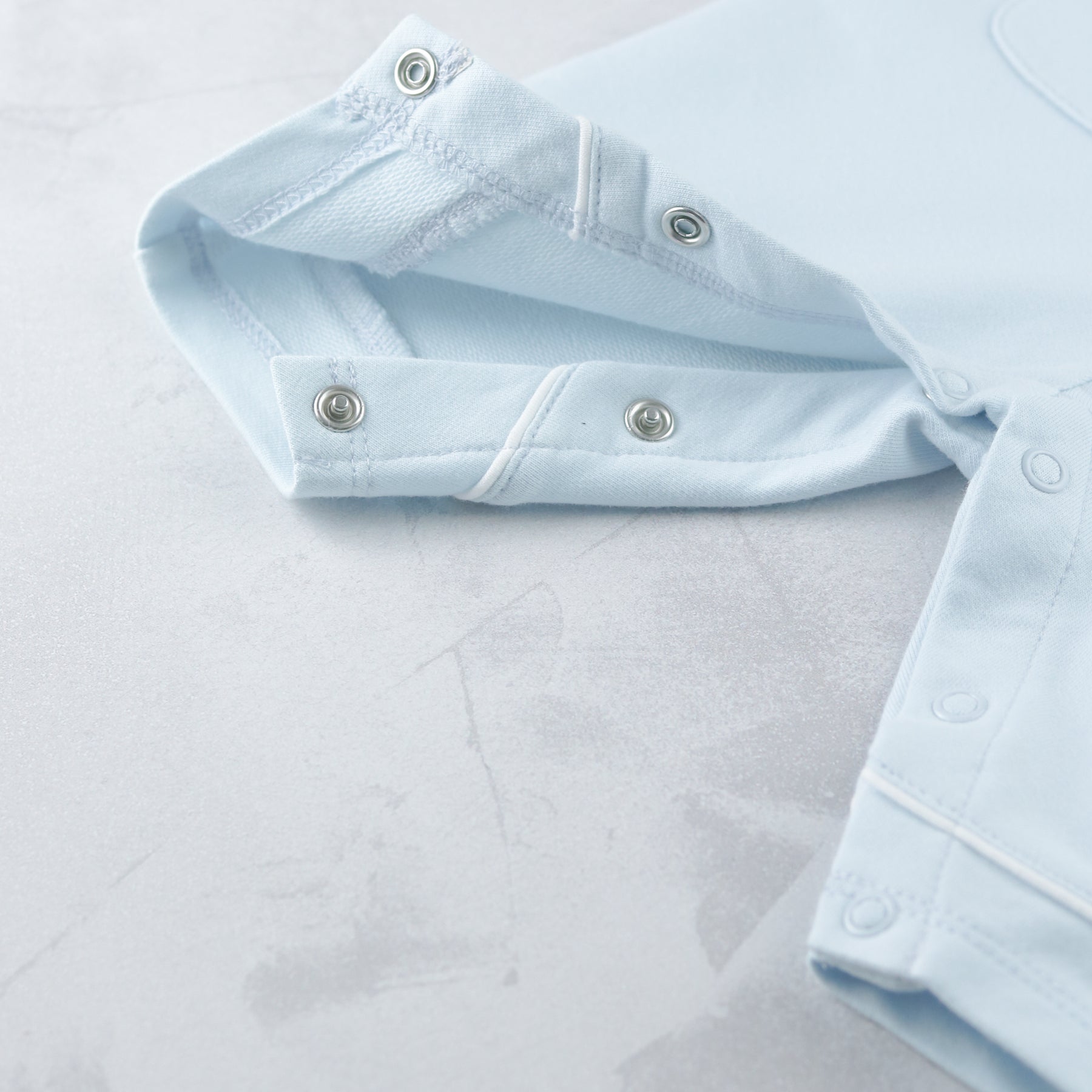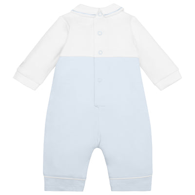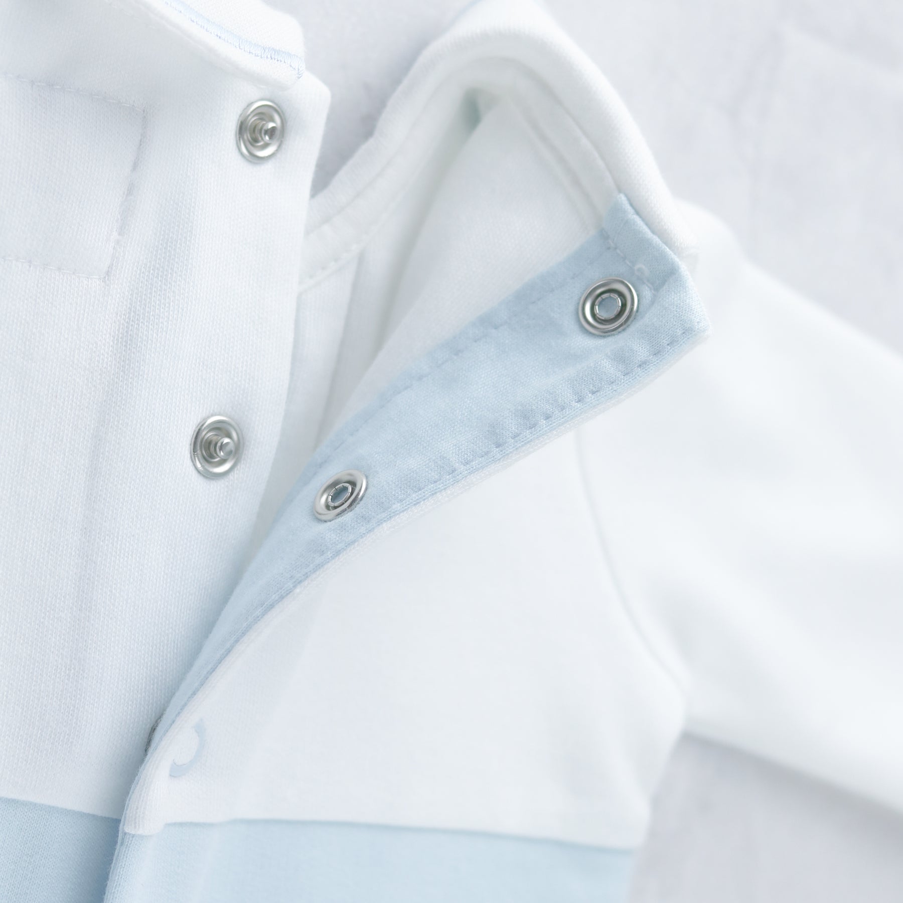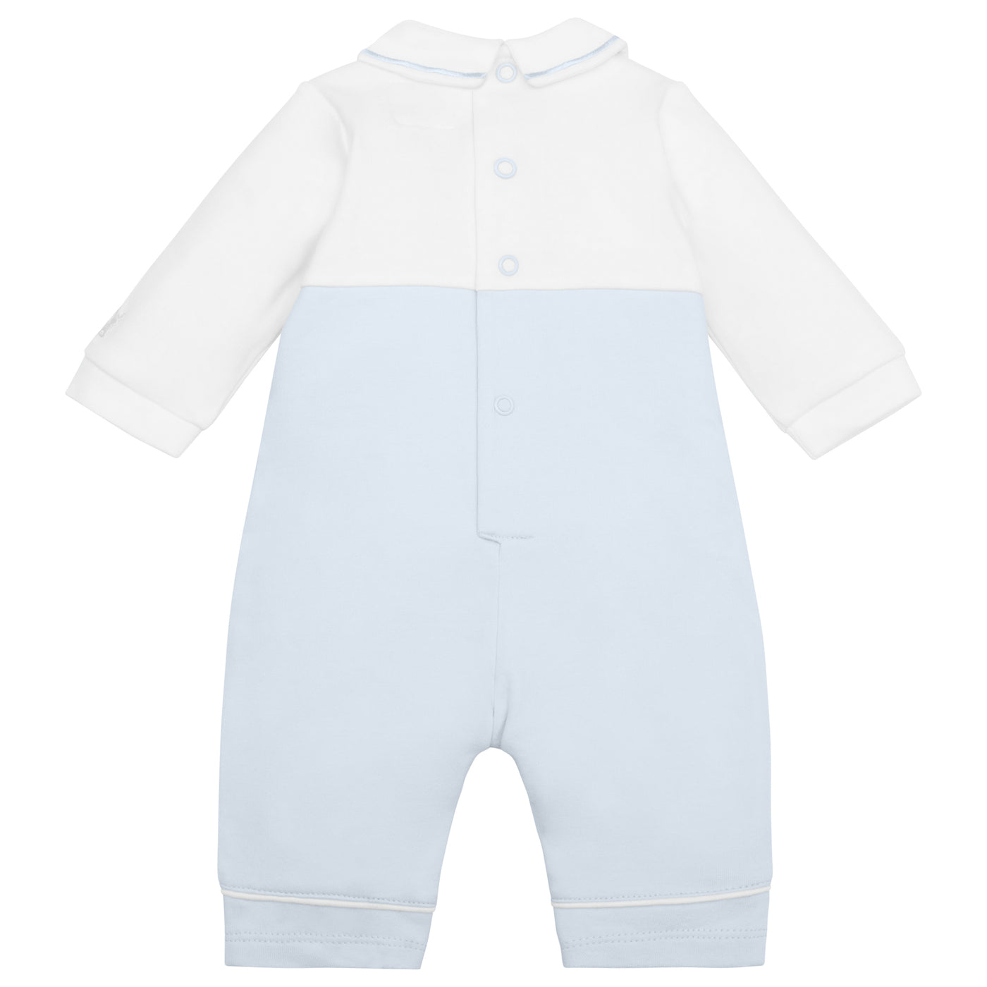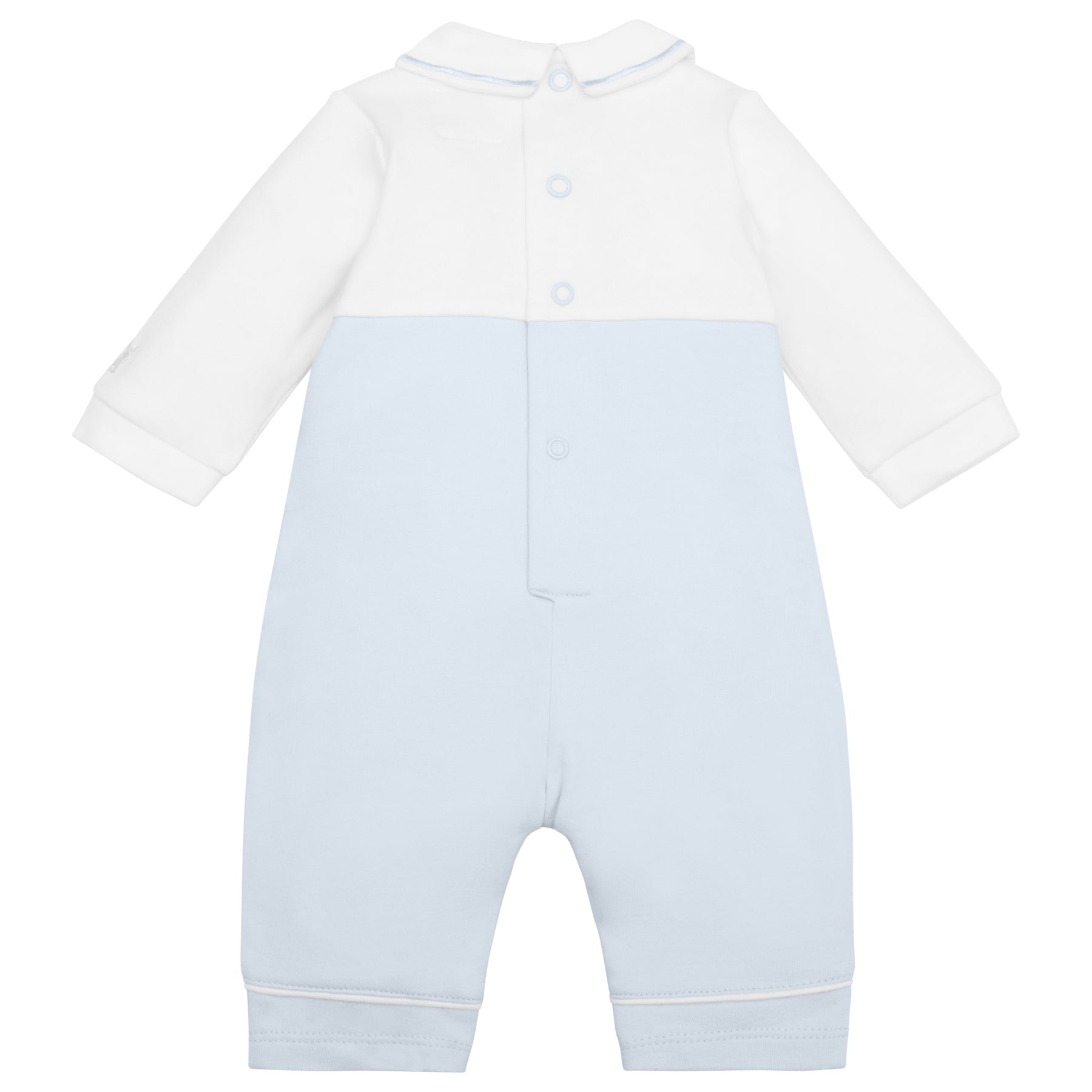 Kingsley is both classic and traditional and a great addition to any little boys wardrobe. This mock dungaree and shirt combinations looks like a two piece but is in fact a babygrow without feet. The waistband has mock braces fixed by a tiny button and two sweet little pockets. The top part of the garment is styled like a shirt with collar, buttons and pintuck pleats. Very smart!