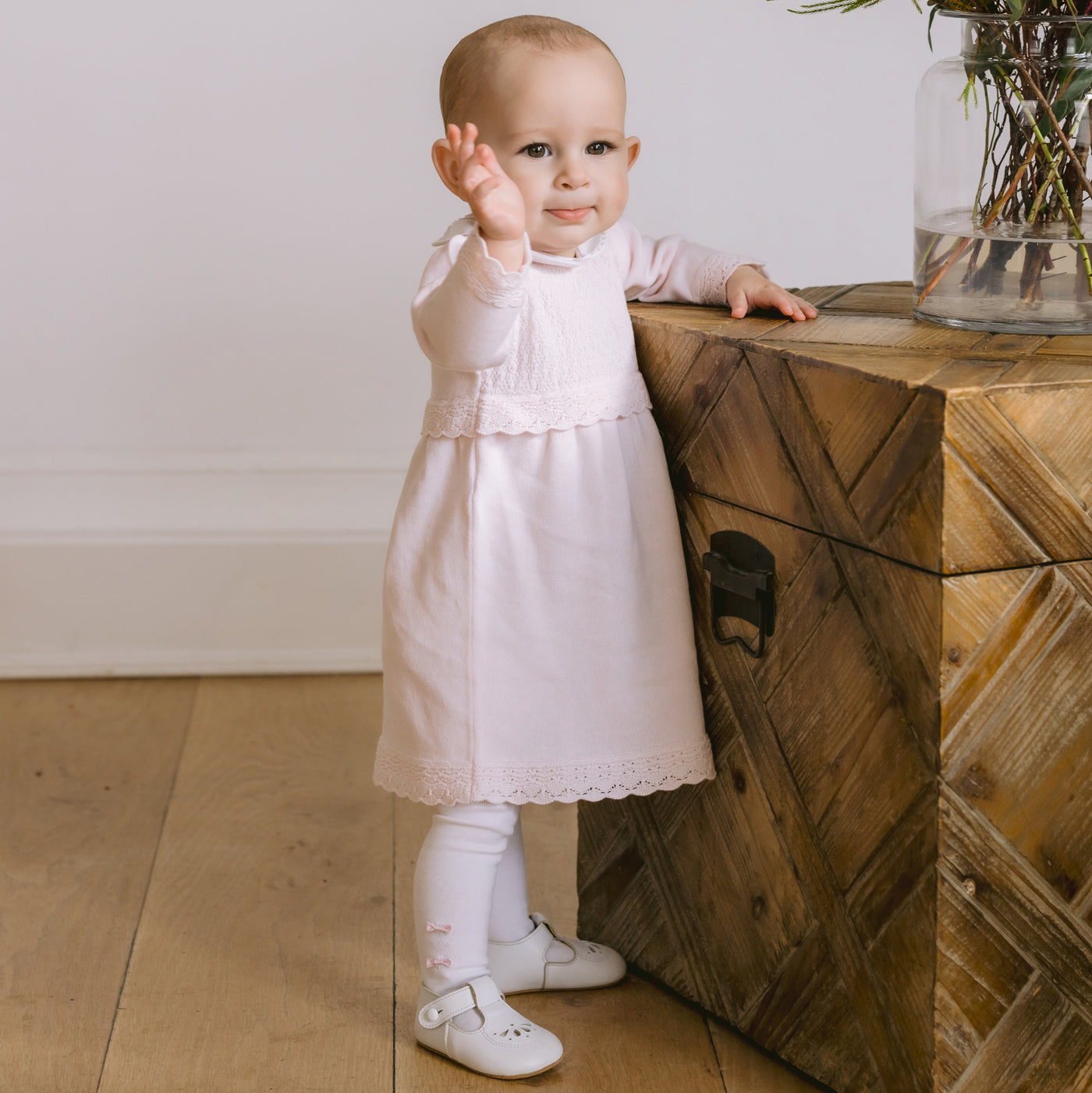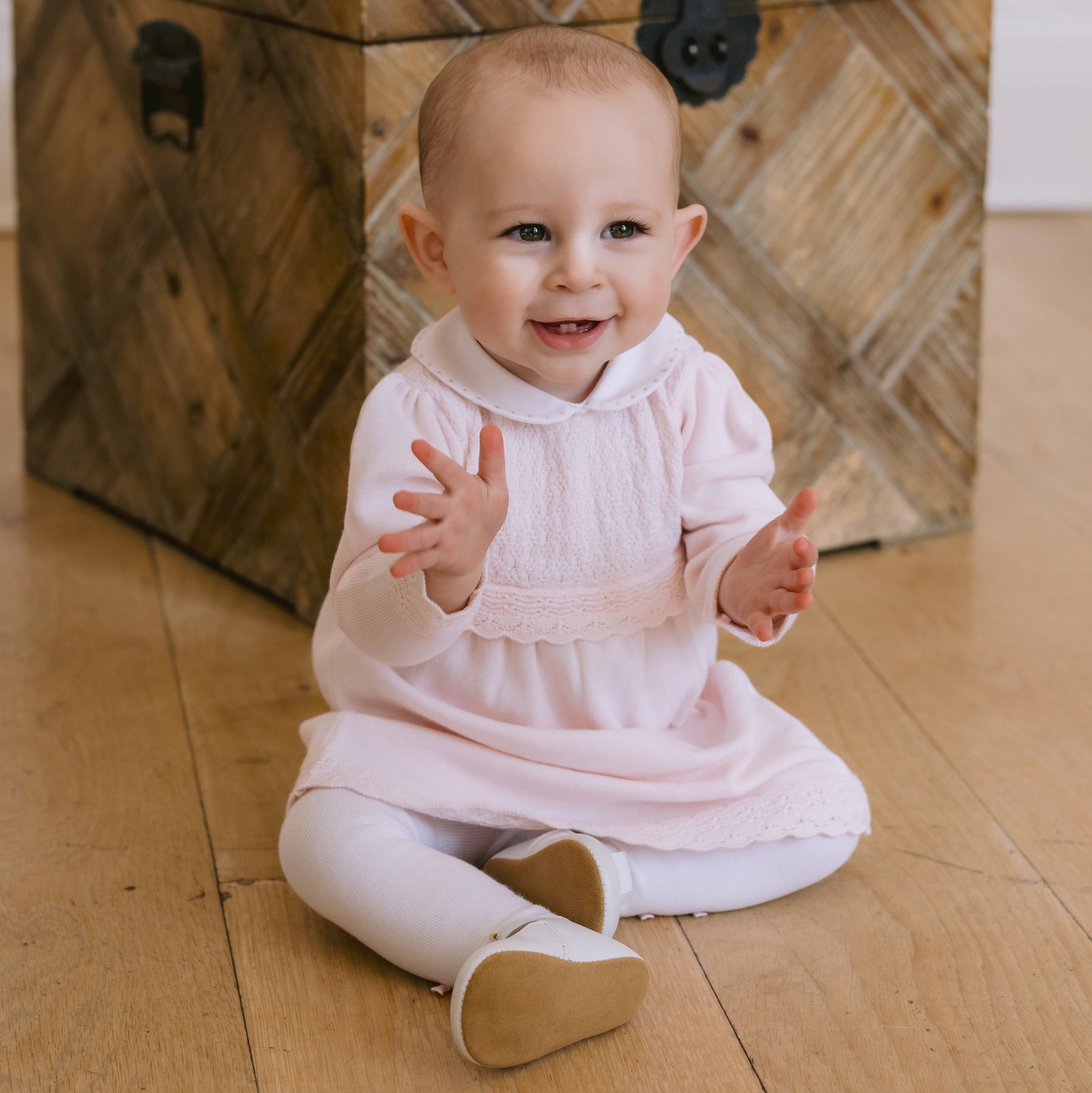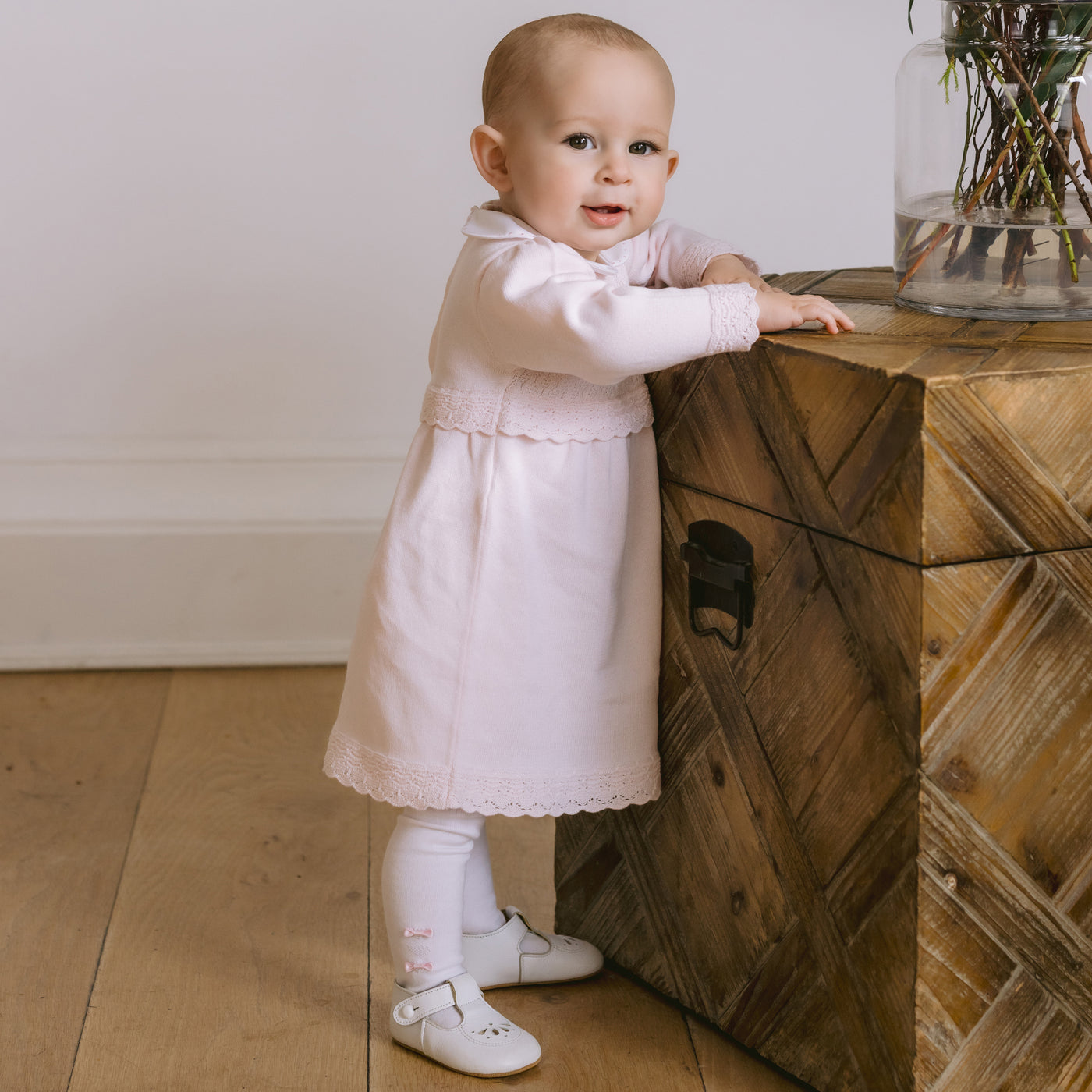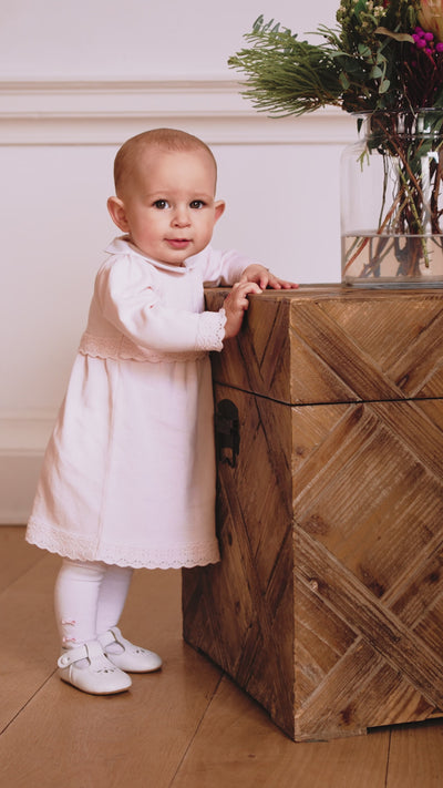 Continuing our lace and scallop edge knitwear theme, our Kara Dress is another option. The yoke has intricate stitching in a flower design with a spot embroidered rounded white collar. This combines beautifully with the ornate sleeves and hemline. Pearlised buttons on the back of the dress and white tights with sweet little pink satin bows, add lovely finishing touches to this beautiful outfit.