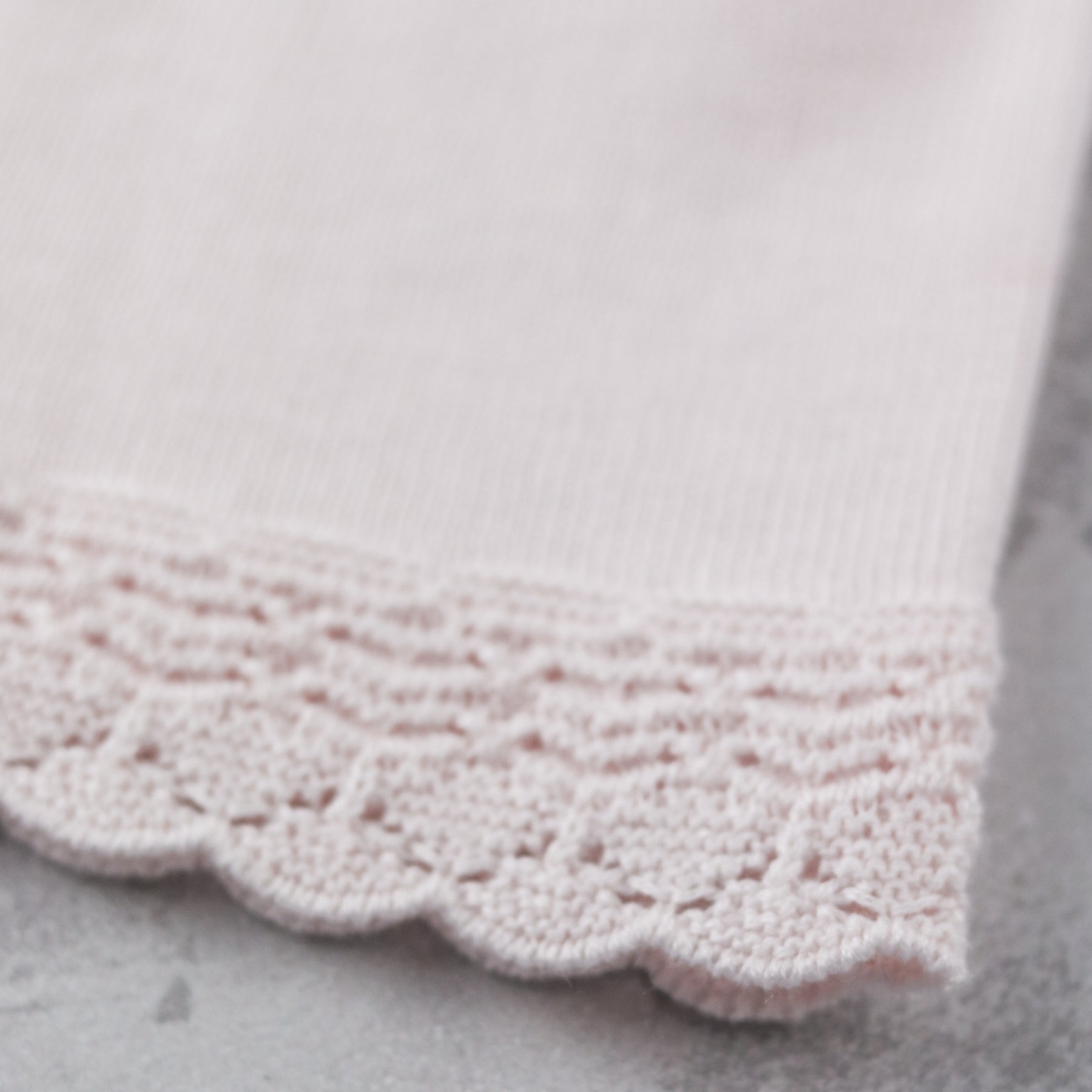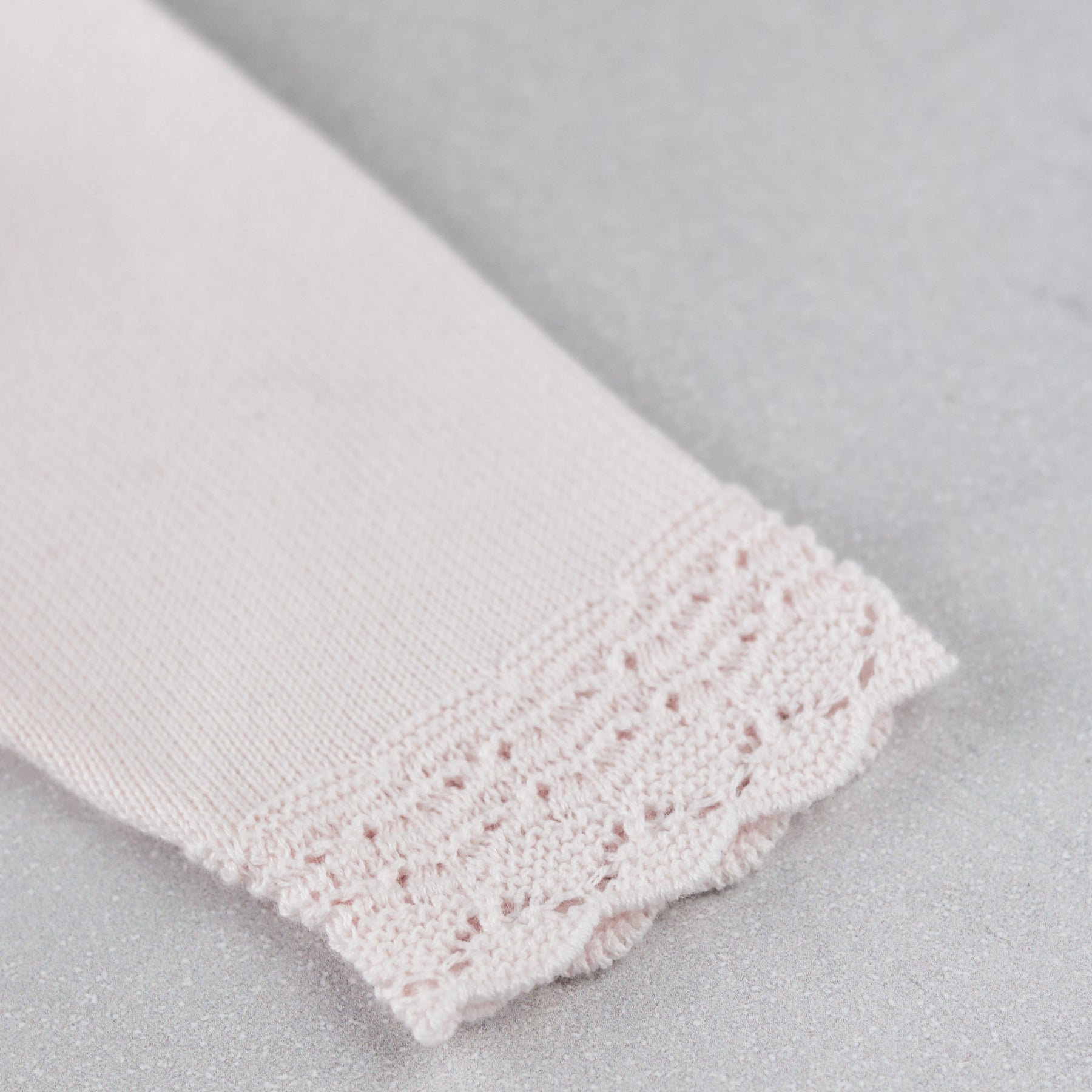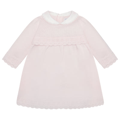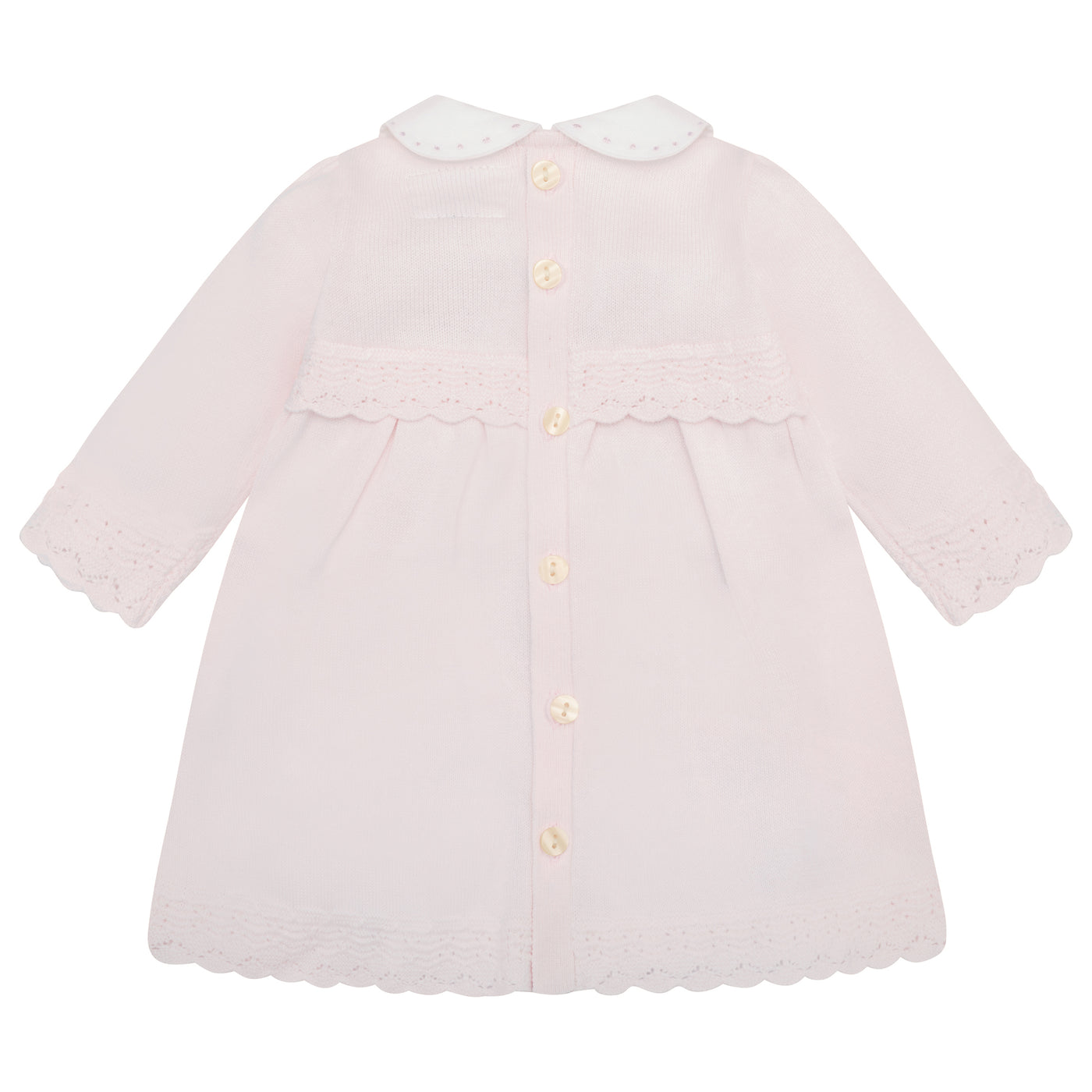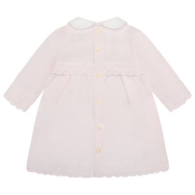 Continuing our lace and scallop edge knitwear theme, our Kara Dress is another option. The yoke has intricate stitching in a flower design with a spot embroidered rounded white collar. This combines beautifully with the ornate sleeves and hemline. Pearlised buttons on the back of the dress and white tights with sweet little pink satin bows, add lovely finishing touches to this beautiful outfit.