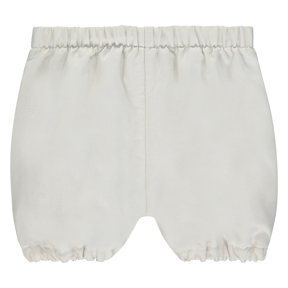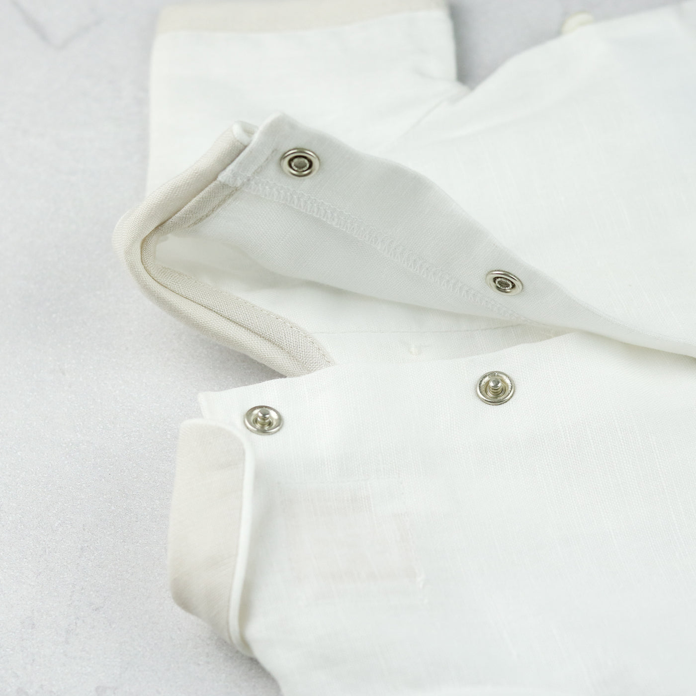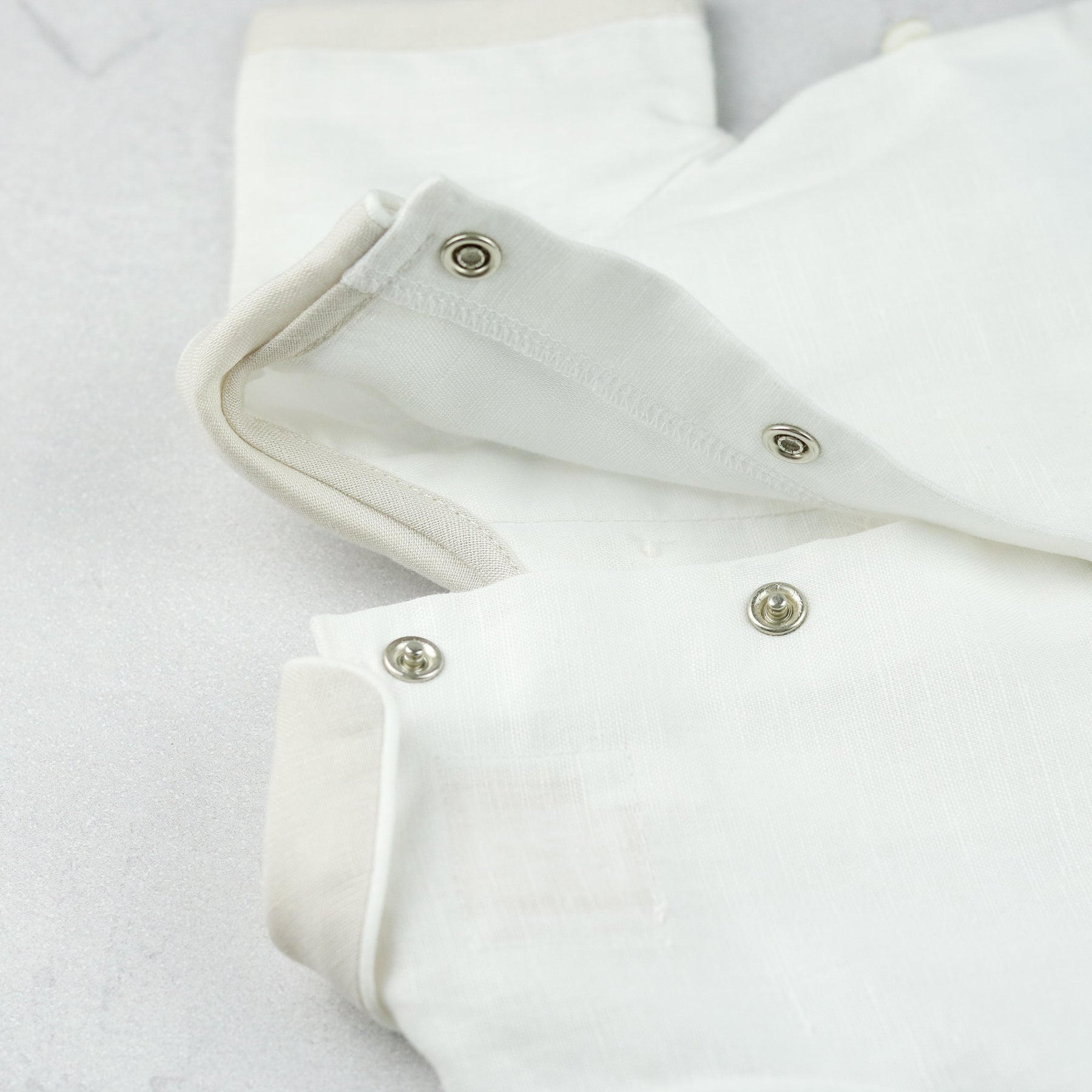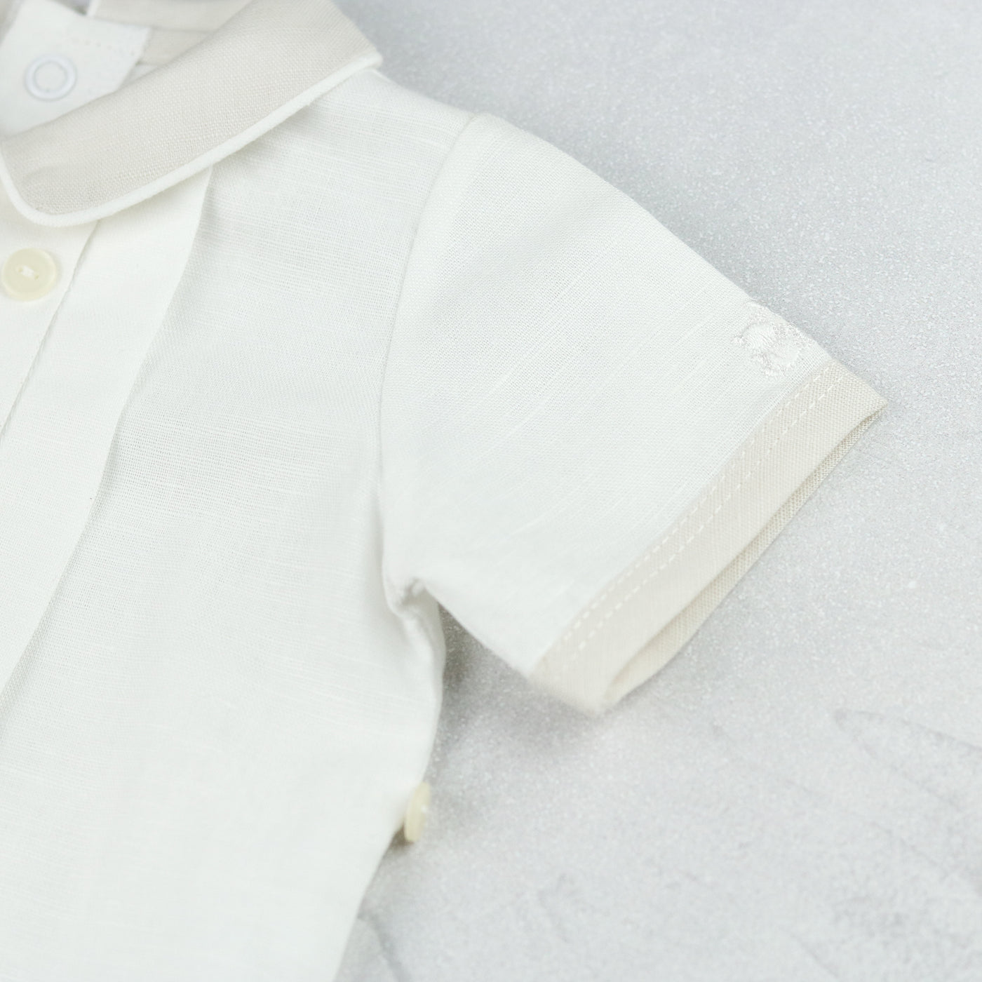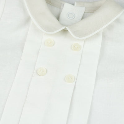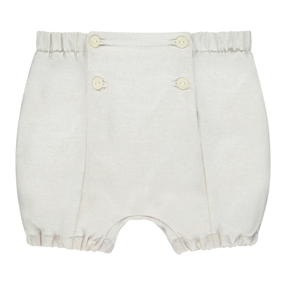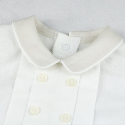 A mix of soft linen and cotton, Sawyer, is a two-piece baby boy's outfit perfect for special occasions. The top half features stone coloured arm cuffs and collar, below is a mock pleated panel, featuring four pearlised buttons. The matching bottoms are a bloomer style, with two vertical pleats down the centre of each leg and four pearlised buttons sat inside of the pleating.