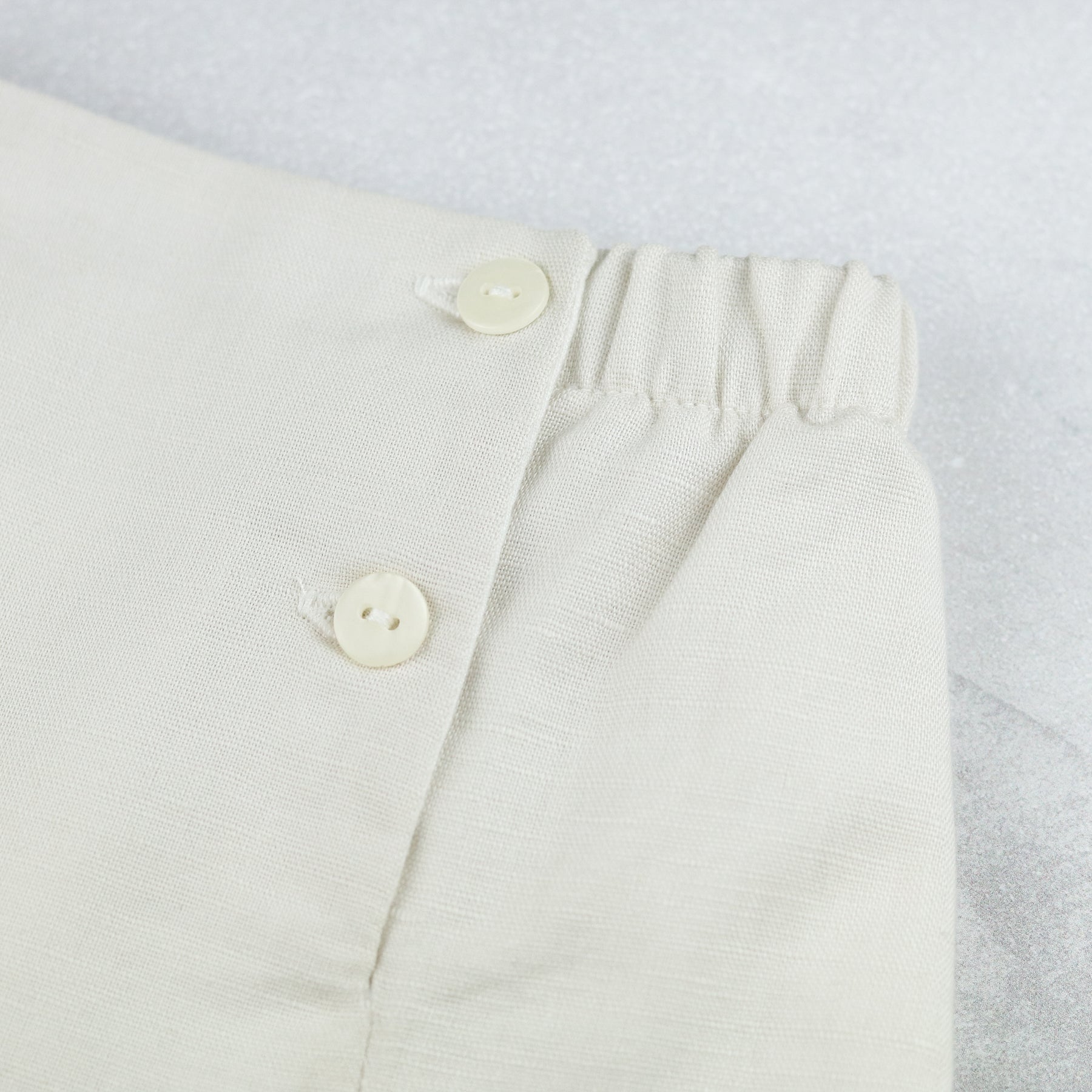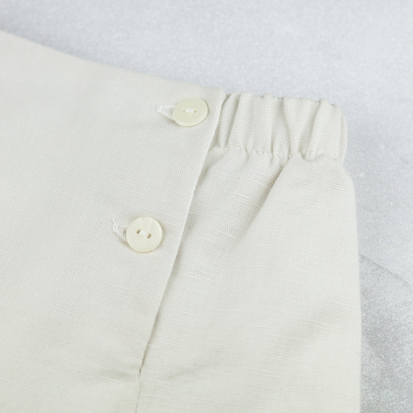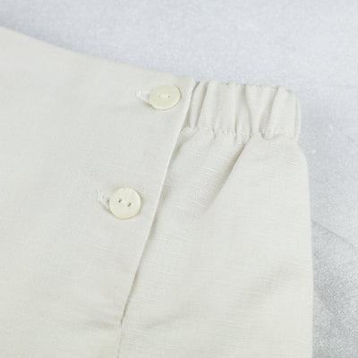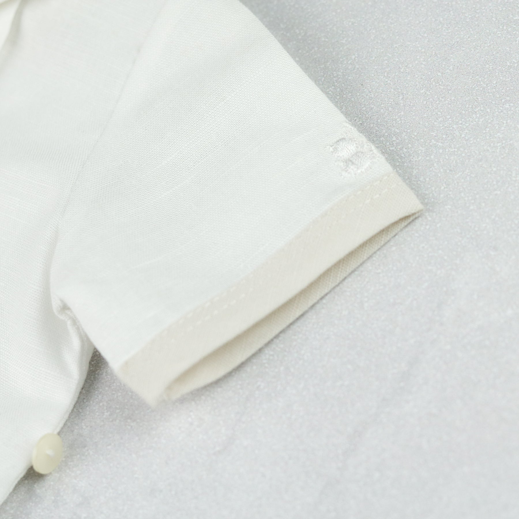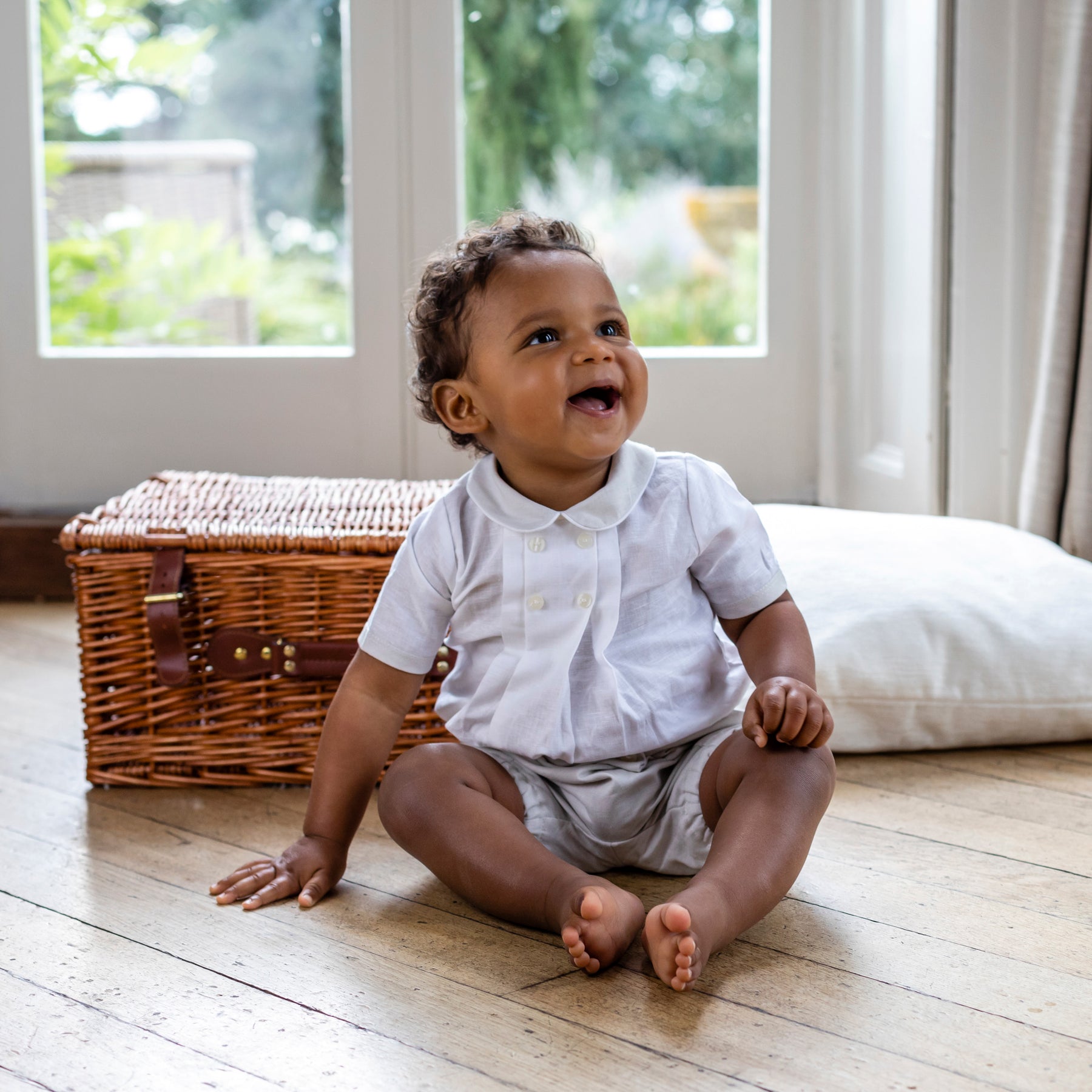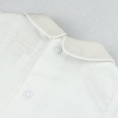 A mix of soft linen and cotton, Sawyer, is a two-piece baby boy's outfit perfect for special occasions. The top half features stone coloured arm cuffs and collar, below is a mock pleated panel, featuring four pearlised buttons. The matching bottoms are a bloomer style, with two vertical pleats down the centre of each leg and four pearlised buttons sat inside of the pleating.