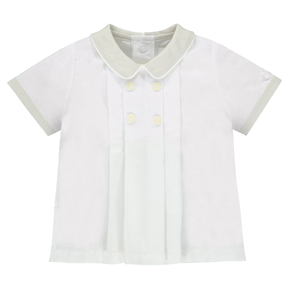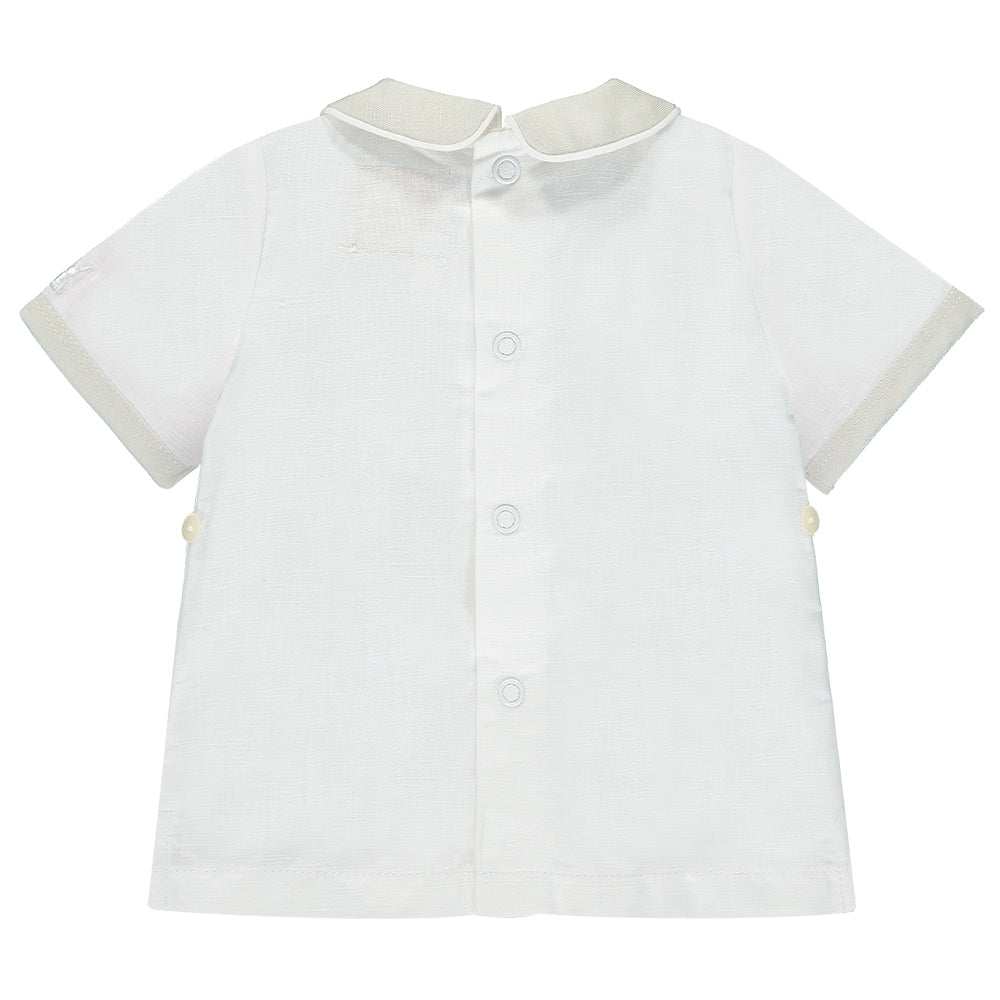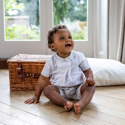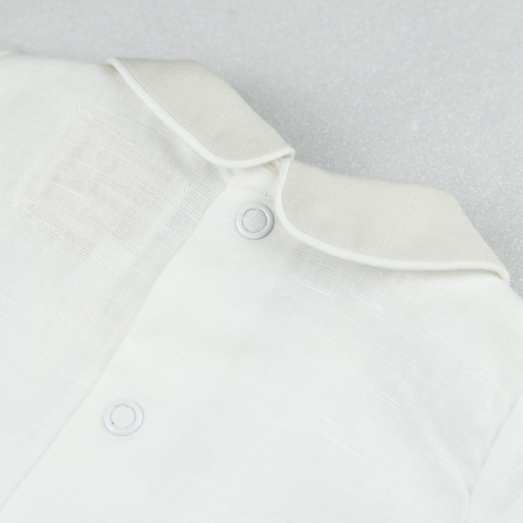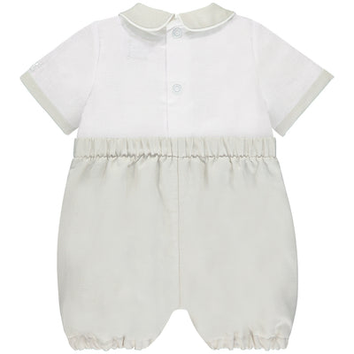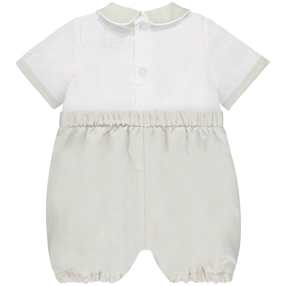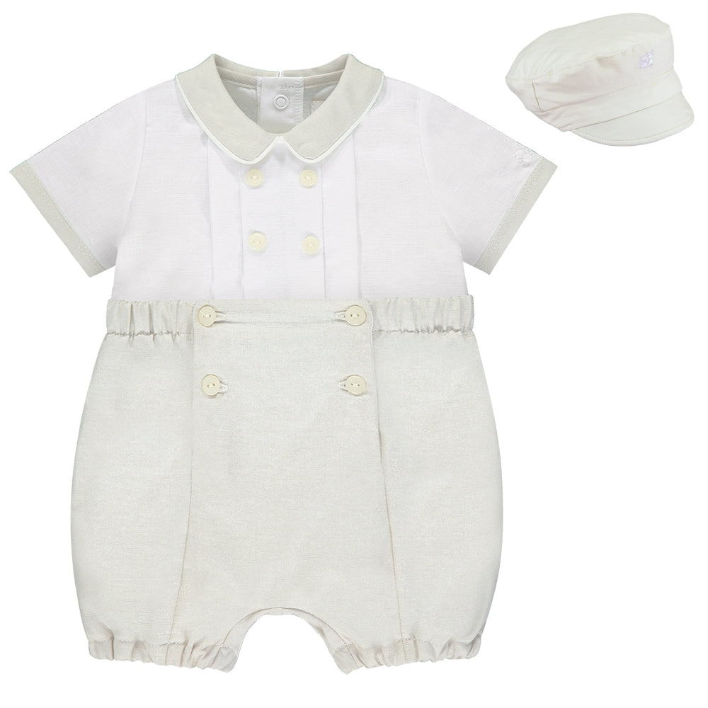 A mix of soft linen and cotton, Sawyer, is a two-piece baby boy's outfit perfect for special occasions. The top half features stone coloured arm cuffs and collar, below is a mock pleated panel, featuring four pearlised buttons. The matching bottoms are a bloomer style, with two vertical pleats down the centre of each leg and four pearlised buttons sat inside of the pleating.